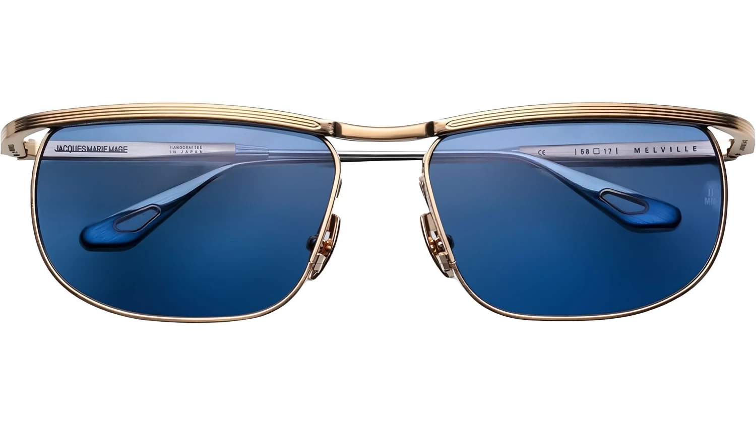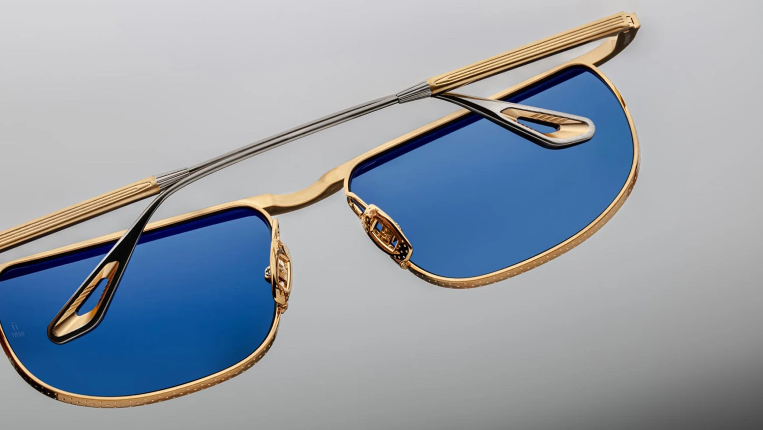 Dark gold beta titanium frame with silver accents and blue lenses. Featuring dark gold and silver titanium temples with eyelet wing tips, dark gold tension-secured custom monoblock hinge, and custom nose pads with logo and hairline engraving. Equipped with sky CR39 6 base lenses with backside anti-reflective treatment. Provides 100% UV protection. Frame total width: mm.