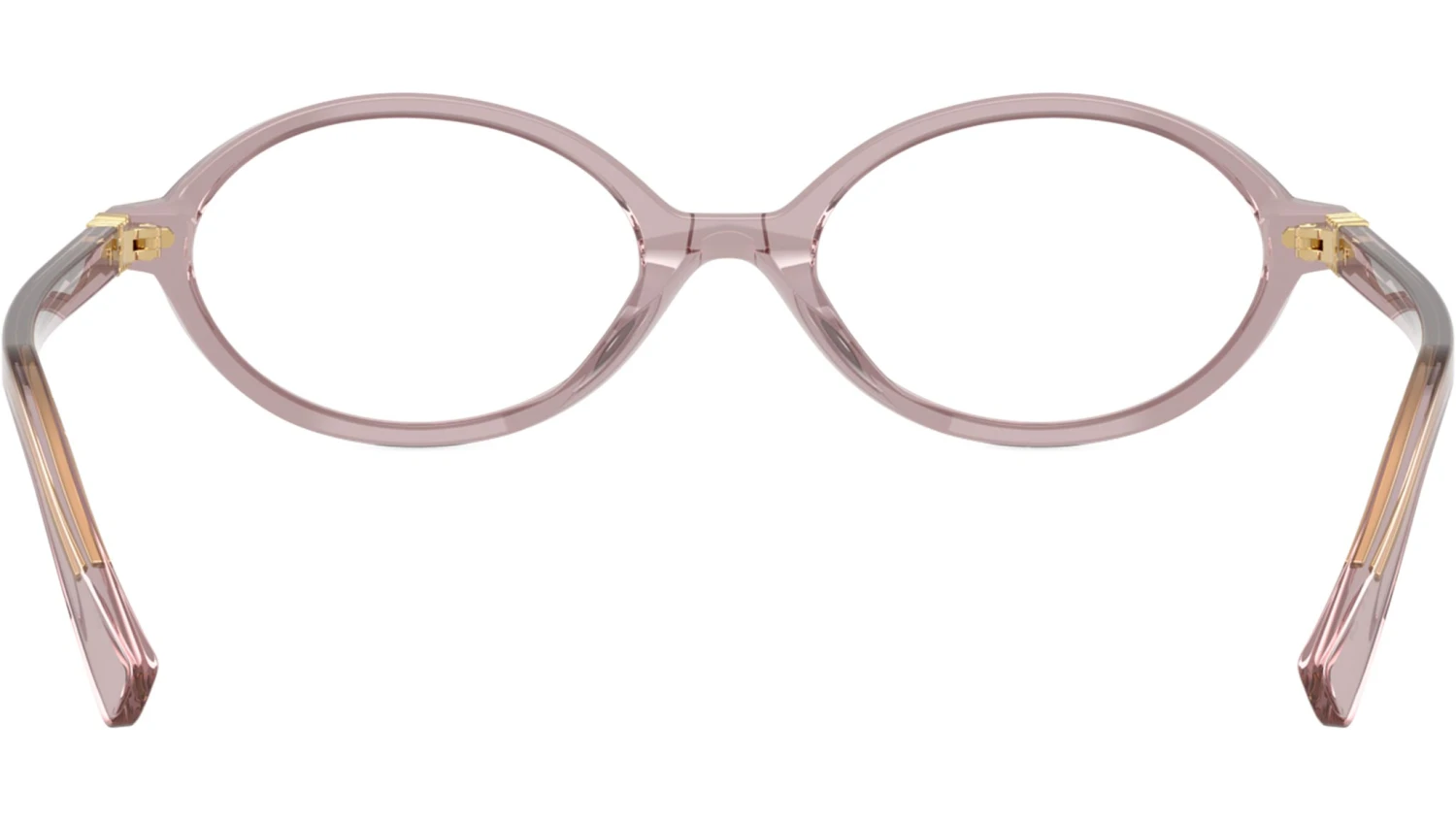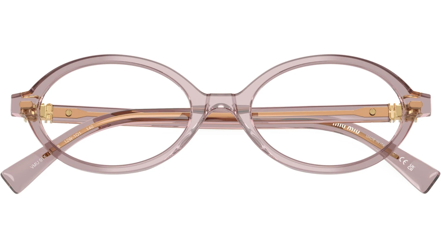 Miu Miu MU 01XV 12W1O1 glasses for women, featuring transparent mauve oval acetate frame and demo lenses. High bridge fit. Brand line: Breaking The Rules. Style code: 0MU 01XV. Color code: 12W1O1. Made in Italy. Authorized Miu Miu online reseller. Your glasses will include the original case and accessories and are covered by a 12-month global warranty.