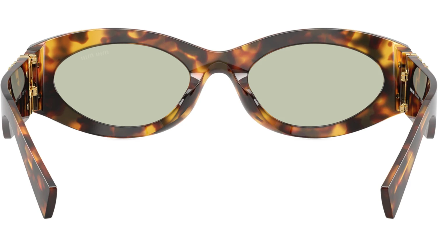 Miu Miu MU 11WS 14L50O sunglasses for women, featuring honey havana oval acetate frame and light green bio polyamide lenses. Universal fit. Brand line: Special Project. Style code: 0MU 11WS. Color code: 14L50O. Made in Italy. Authorized Miu Miu online reseller. Your glasses will include the original case and accessories and are covered by a 12-month global warranty.