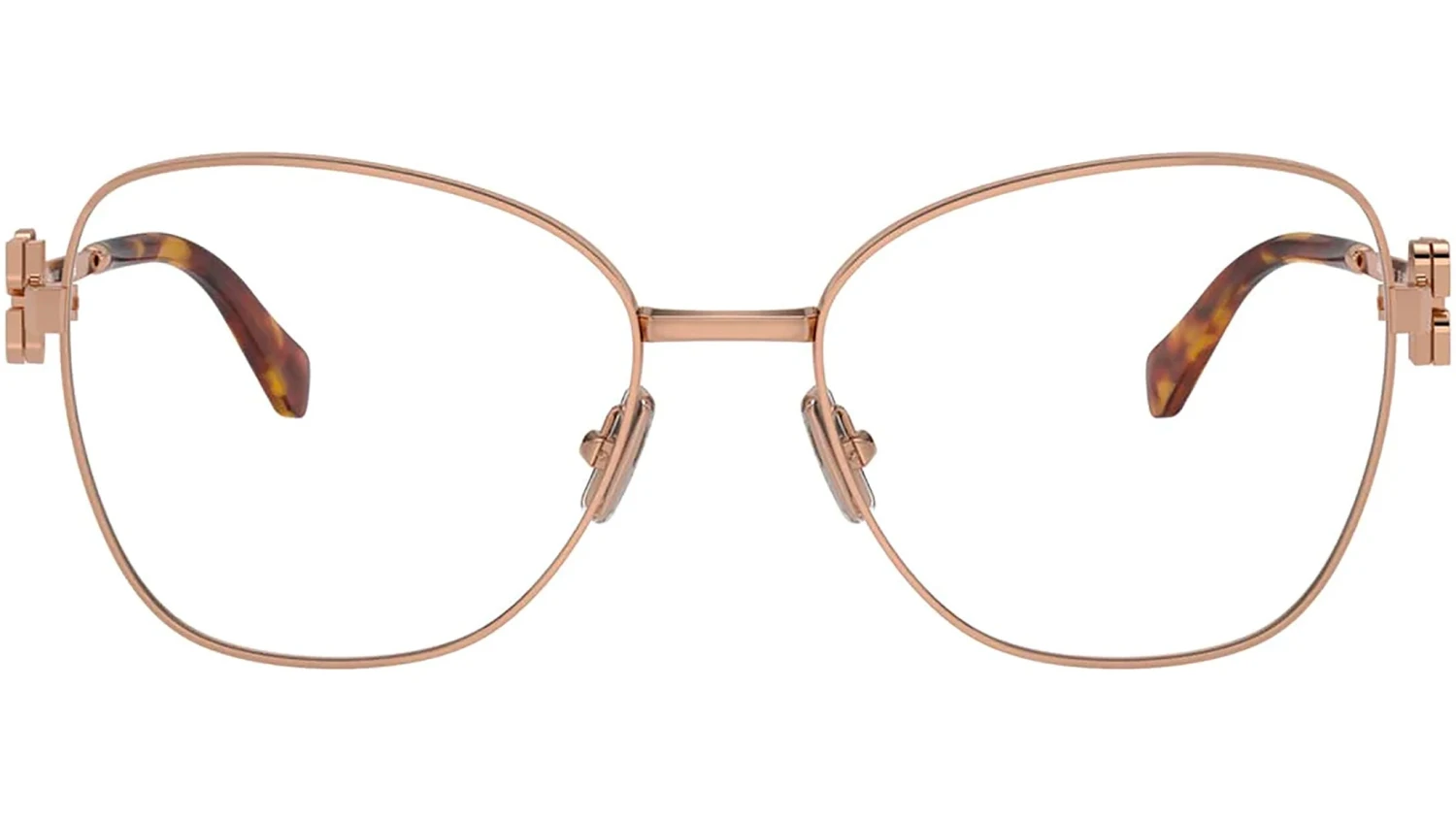 Miu Miu Irreverently Sophisticated eyeglasses collection model MU 50XV rose gold full rim aviator metal frame with demo lens. Product code MU50XV, color code ZVF1O1. Miu Miu eyeglasses are the epitome of chic and sophisticated fashion. The line showcases unique and avant-garde designs, featuring bold frames, vibrant colors, and intricate detailing
