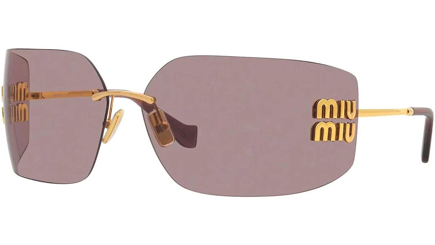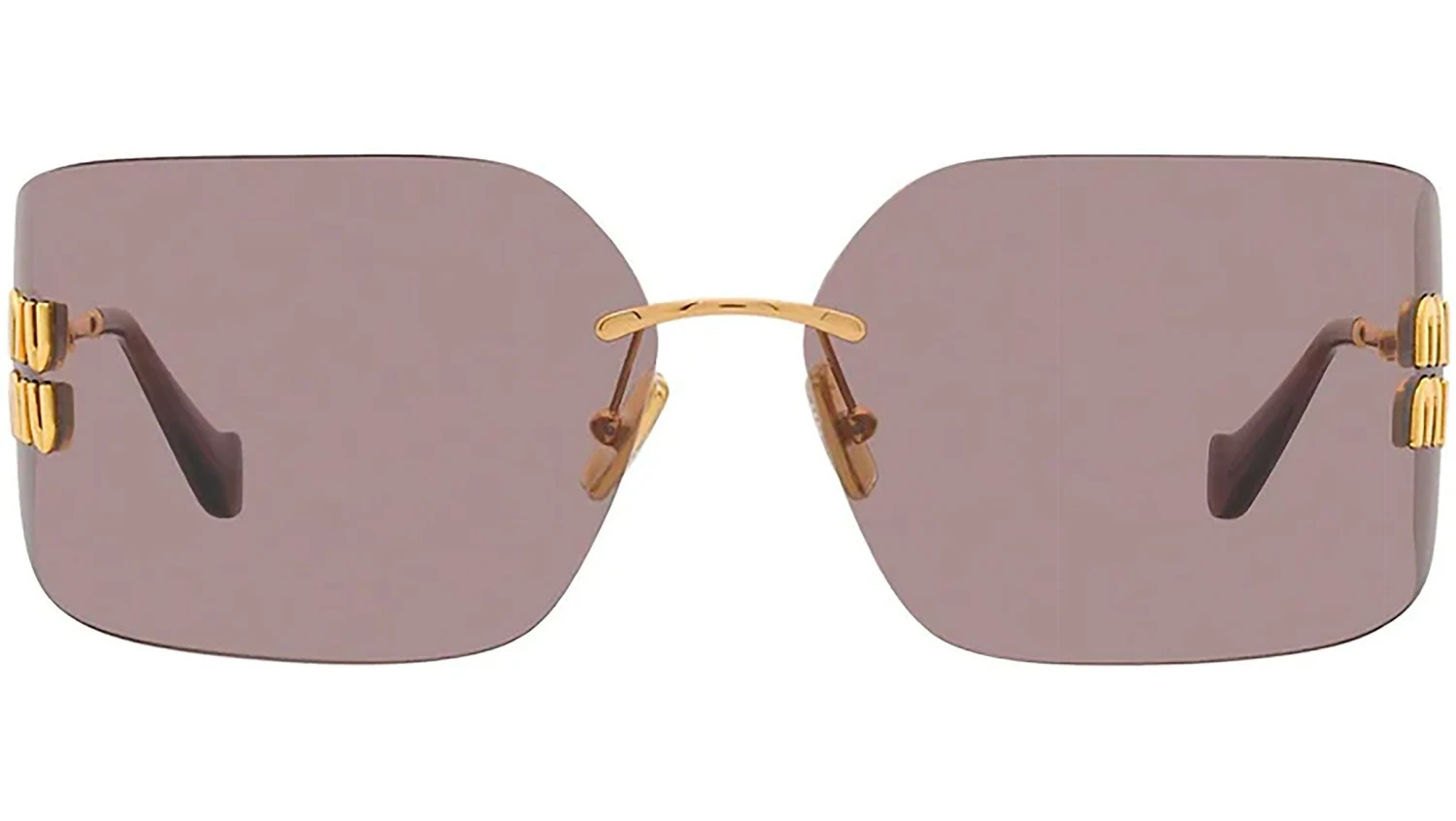 Miu Miu sunglasses model MU 54YS color code 5AK06I featuring gold rimless metal frame and CR-39 light purple brown lenses. The sunglasses within the Miu Miu eyewear collection stand as distinctive masterpieces, products of the brand’s relentless stylistic exploration and adept artistry. A harmonious fusion of joyful experimentation and intricate detailing, these sunglasses epitomize the stylistic ethos that has perennially defined the House. This reinforces Miu Miu’s undeniable knack for integrating offbeat designs with a touch of retro-tinged romanticism.