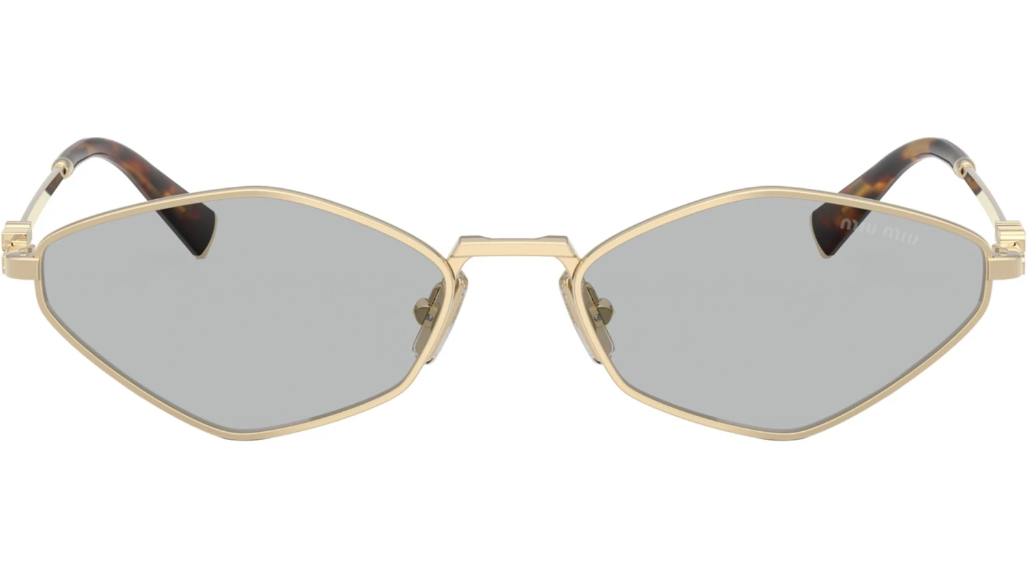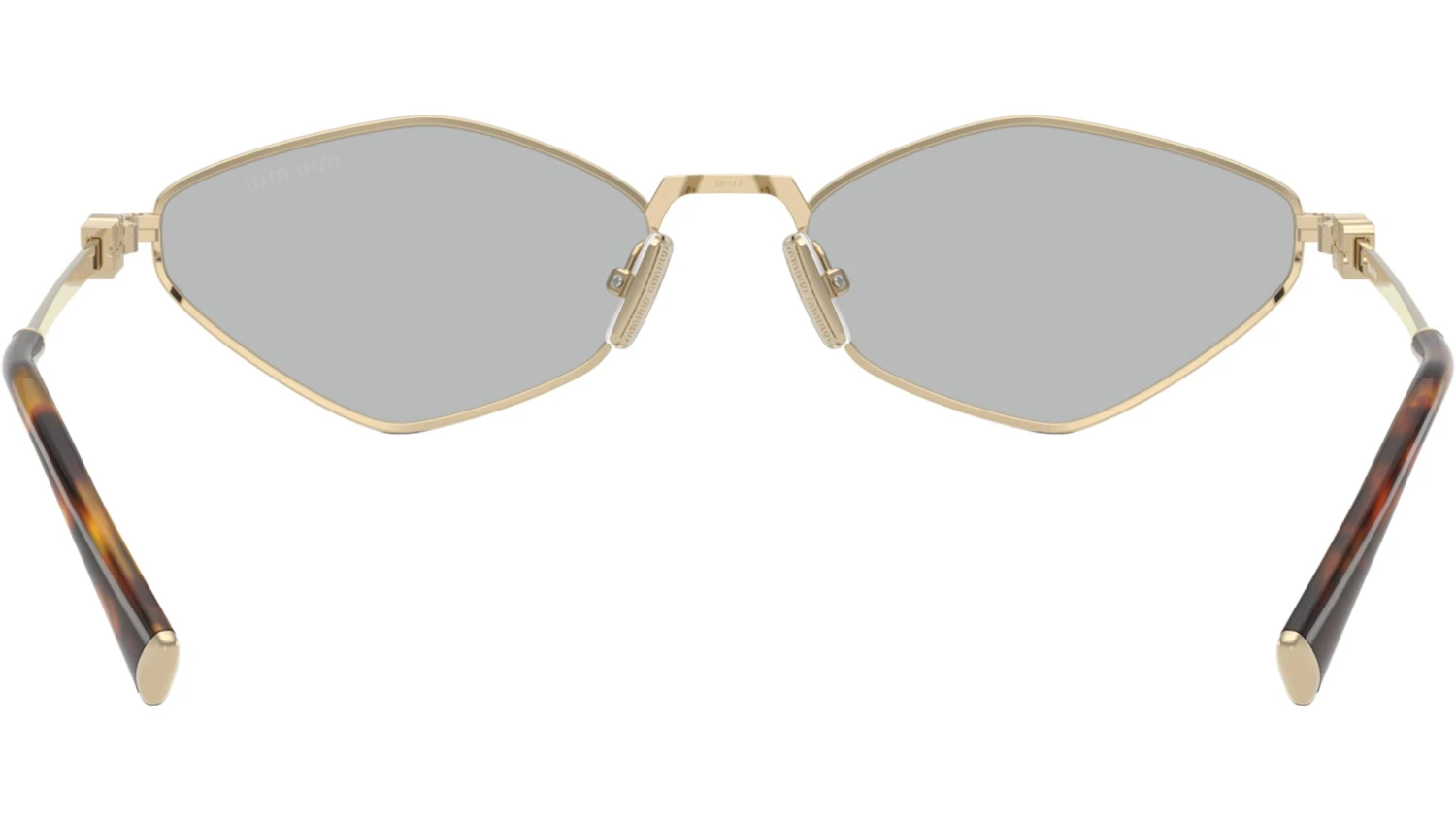 Miu Miu MU 56ZS ZVN50K sunglasses for women, featuring pale gold geometric metal frame and light grey bio polyamide lenses. Adjustable nosepads. Brand line: Dna. Style code: 0MU 56ZS. Color code: ZVN50K. Made in Italy. Authorized Miu Miu online reseller. Your glasses will include the original case and accessories and are covered by a 12-month global warranty.