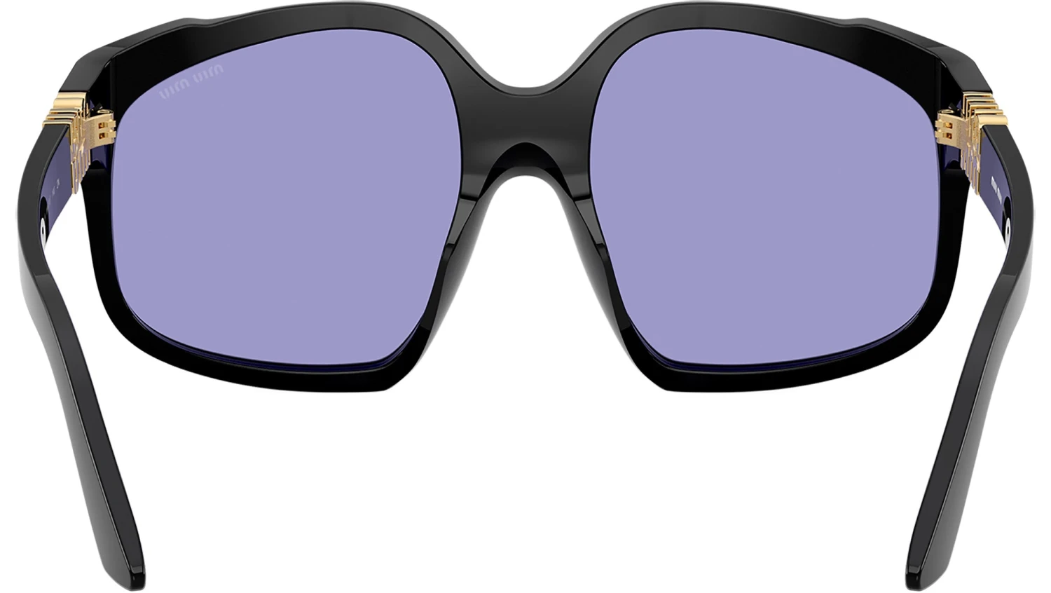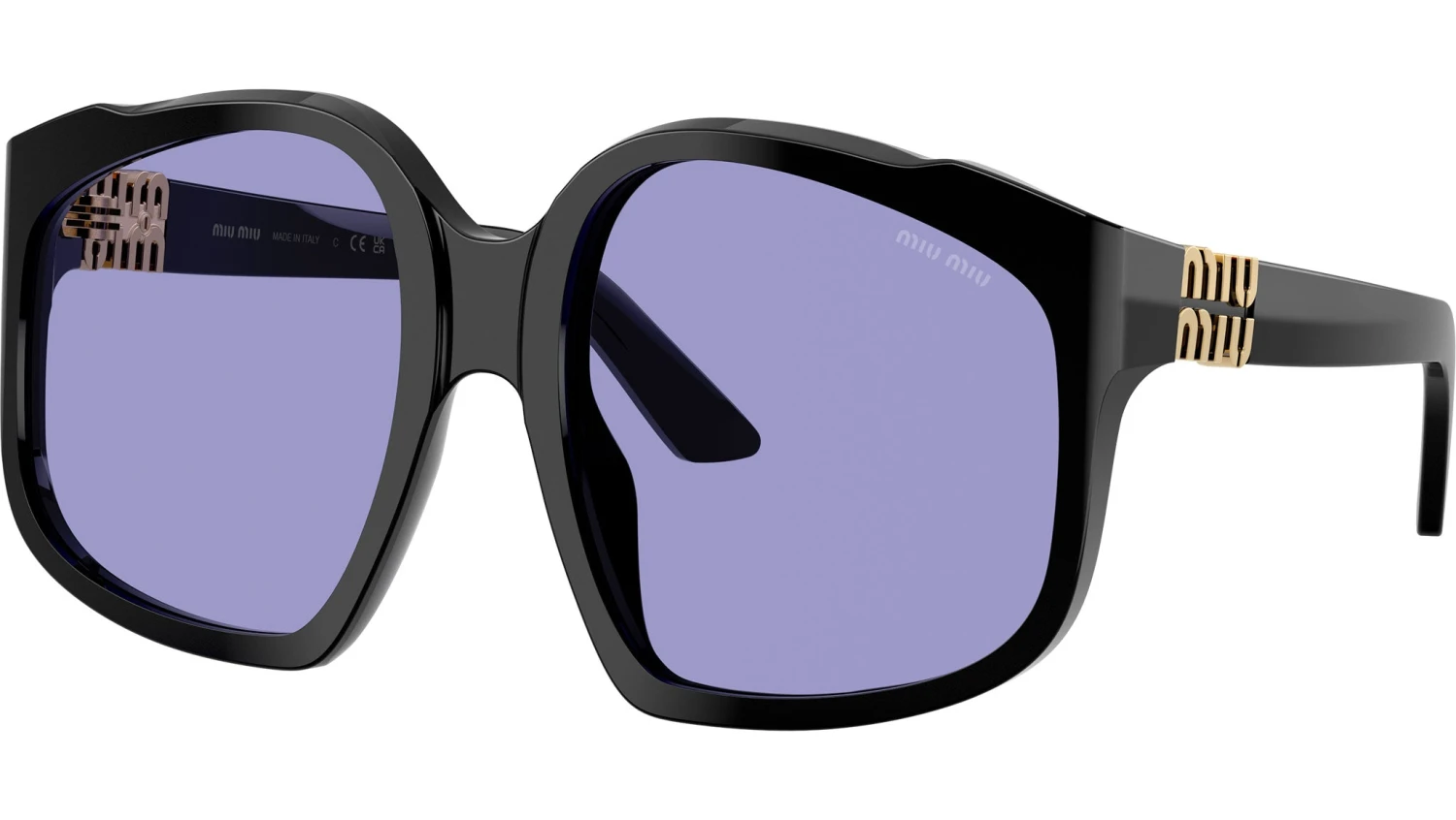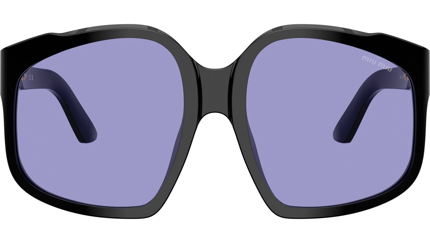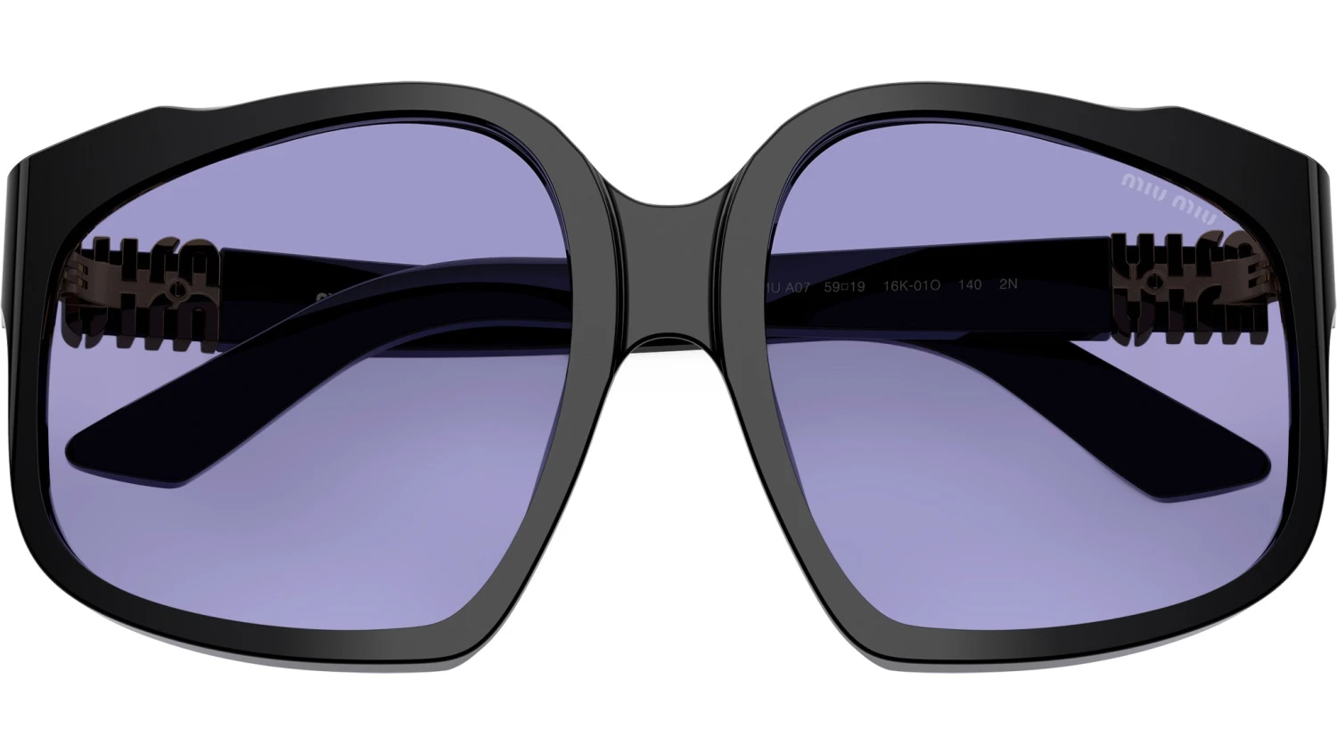 Miu Miu MU A07S 16K01O sunglasses for women, featuring black geometric acetate frame and violet bio polyamide lenses. High bridge fit. Brand line: Fashion Show. Style code: 0MU A07S. Color code: 16K01O. Made in Italy. Authorized Miu Miu online reseller. Your glasses will include the original case and accessories and are covered by a 12-month global warranty.