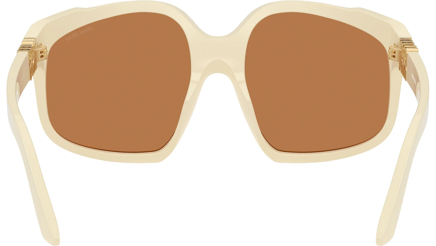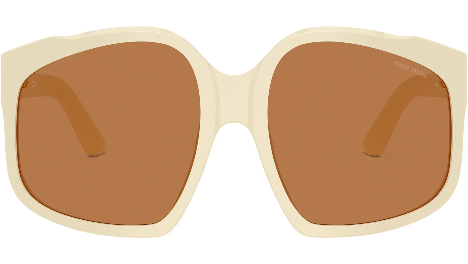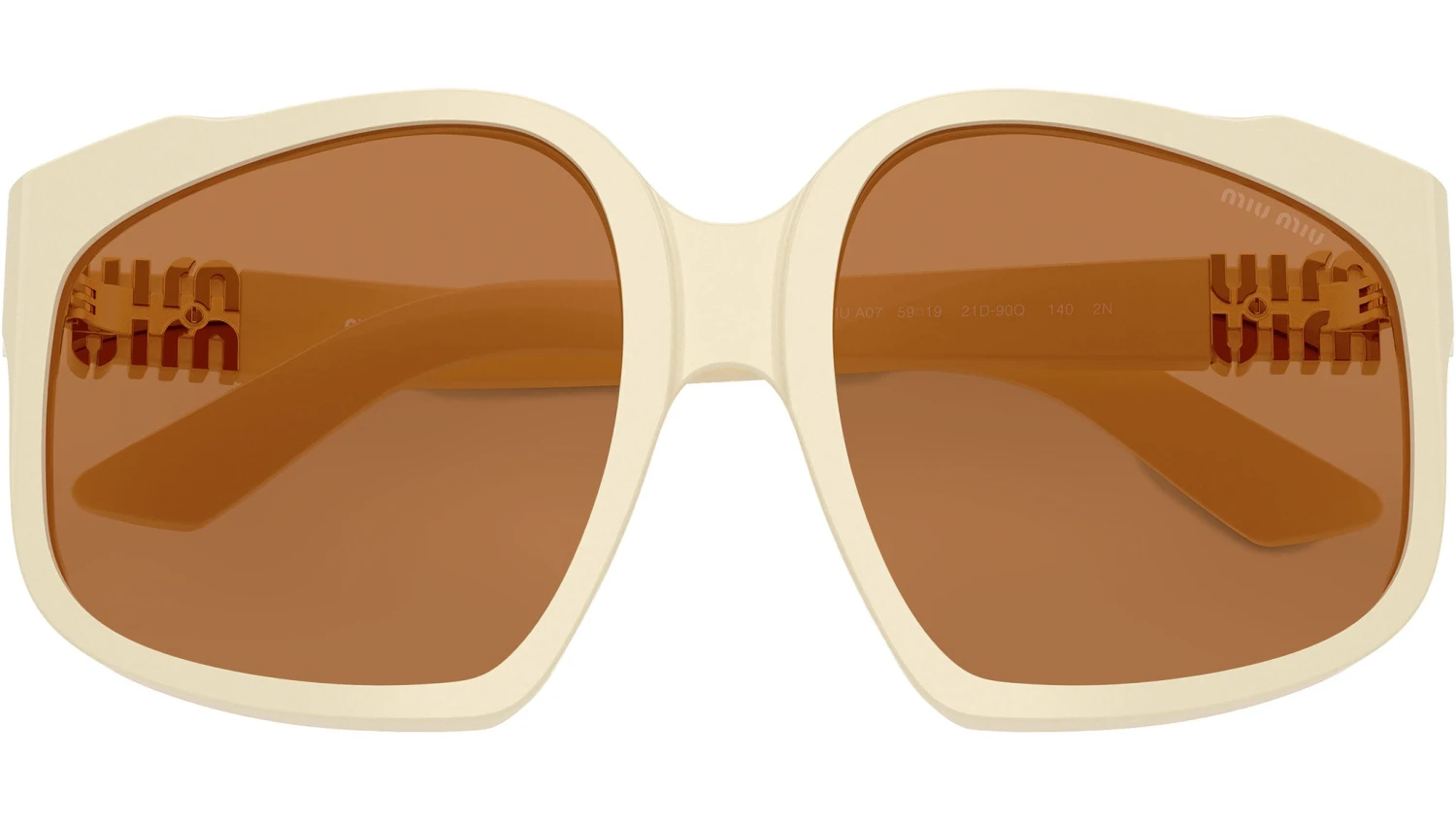 Miu Miu MU A07S 21D90Q sunglasses for women, featuring white milk geometric acetate frame and brown bio polyamide lenses. High bridge fit. Brand line: Fashion Show. Style code: 0MU A07S. Color code: 21D90Q. Made in Italy. Authorized Miu Miu online reseller. Your glasses will include the original case and accessories and are covered by a 12-month global warranty.