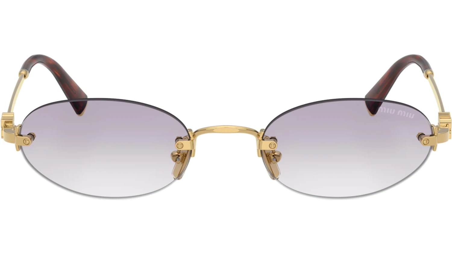 Miu Miu MU A54S 5AK04O sunglasses for women, featuring gold oval metal frame and clear gradient dark grey bio polyamide lenses. Adjustable nosepads. Brand line: Miu Regard. Style code: 0MU A54S. Color code: 5AK04O. Made in Italy. Authorized Miu Miu online reseller. Your glasses will include the original case and accessories and are covered by a 12-month global warranty.