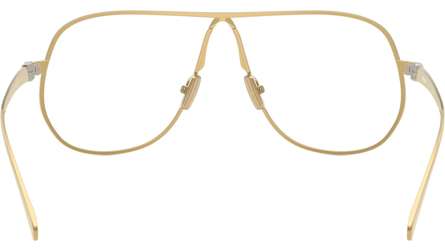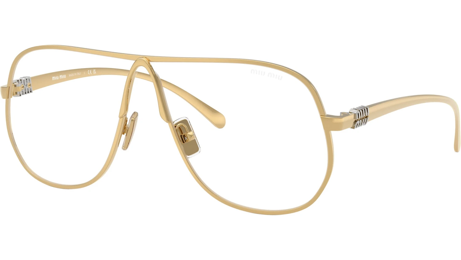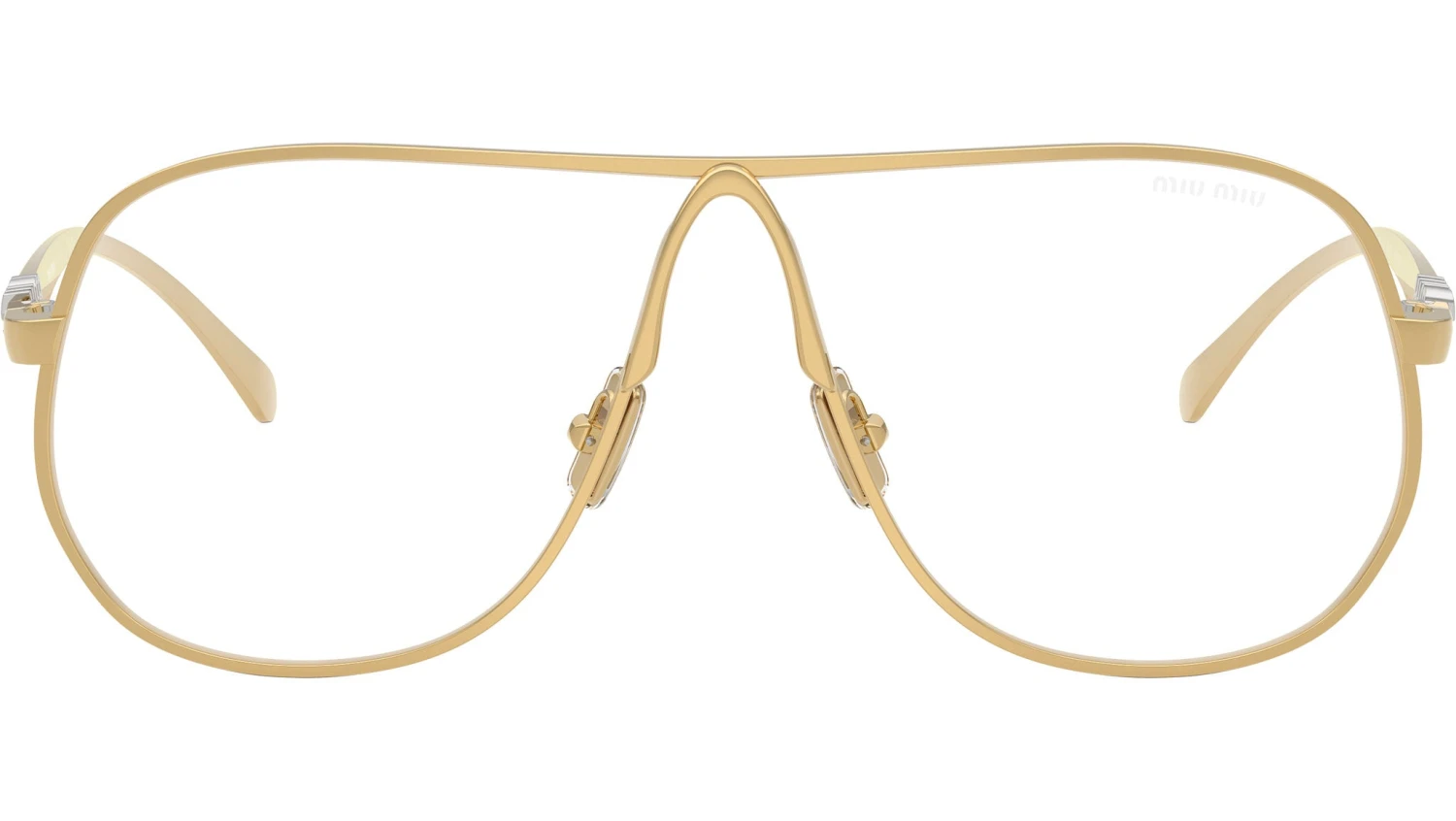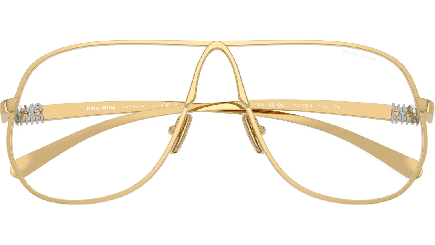 Miu Miu MU A56S 5AK08N sunglasses for women, featuring gold pilot metal frame and clear blue-violet light filter bio polyamide lenses. Adjustable nosepads. Brand line: Main Collection. Style code: 0MU A56S. Color code: 5AK08N. Made in Italy. Authorized Miu Miu online reseller. Your glasses will include the original case and accessories and are covered by a 12-month global warranty.