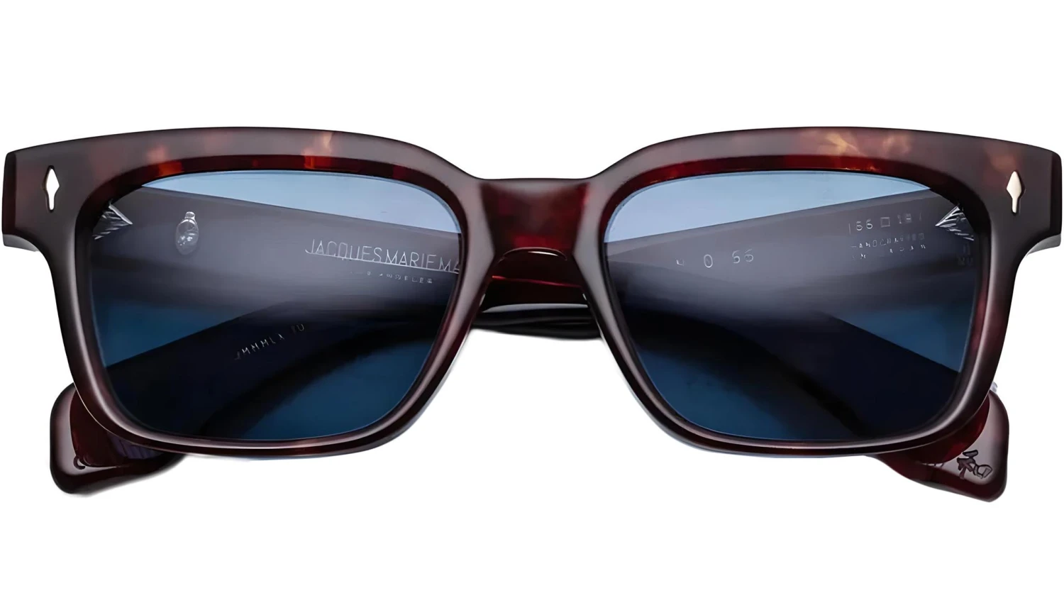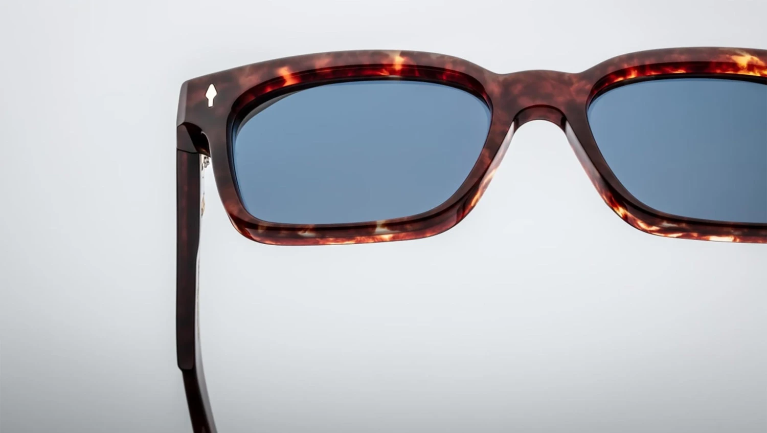 Havana 10mm cured cellulose acetate frame with double-laminated acetate temples, featuring precious metal hardware and Prussian blue lenses. Detailed with a light gold arrowhead front pin, exposed dark gold hairline-engraved wirecore, and a light gold tension-secured 7-barrel hinge with silver spur-shaped rivets. Accentuated by a domed 3D metal cameo logo, the rectangular frame includes 6-base CR-39 lenses with backside anti-reflective treatment, ensuring 100% UV protection.