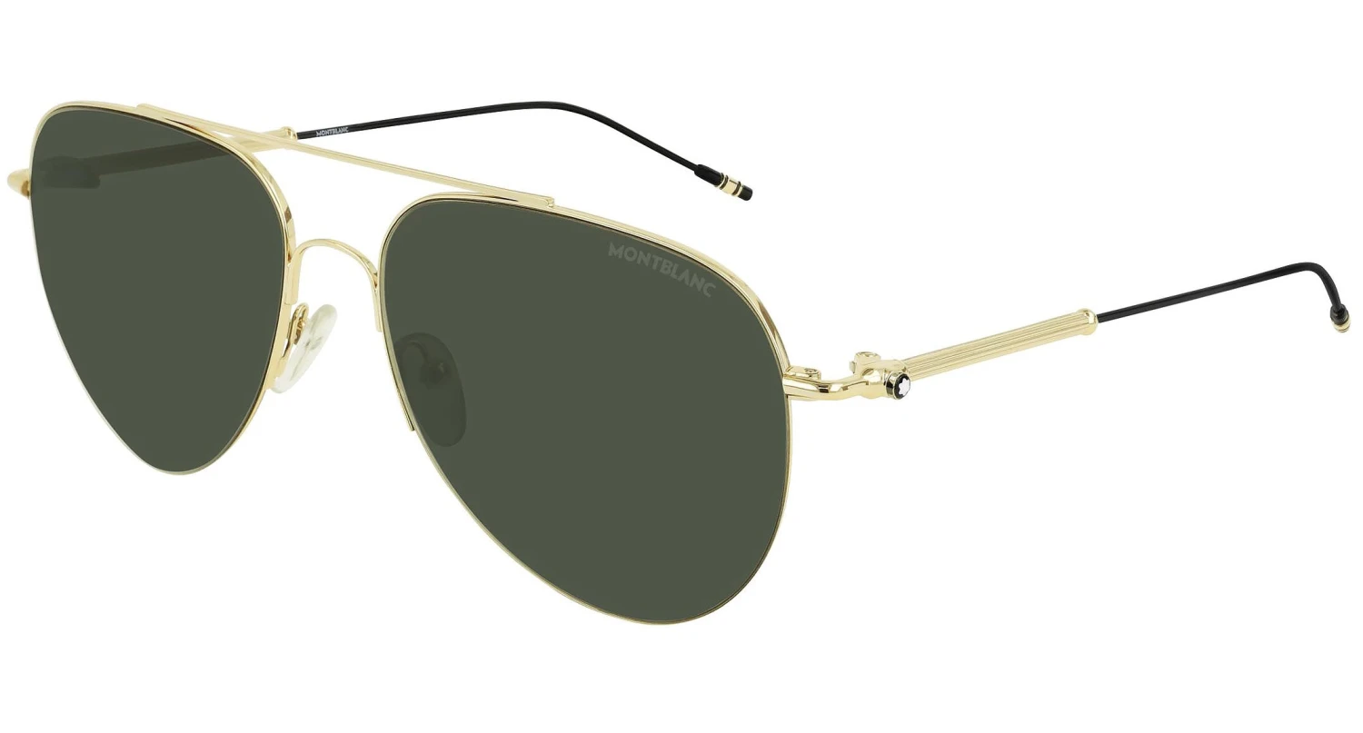 Montblanc sunglasses collection model MB0037S 002 featuring shiny light gold frame and green lens. Montblanc revolutionized the culture of writing with breakthrough innovations. Today, the Maison continues to push boundaries and evolve the expression of fine craftsmanship across each of its product categories: the pinnacle of luxury writing instruments, timepieces, leather goods, accessories, fragrances and eyewear.