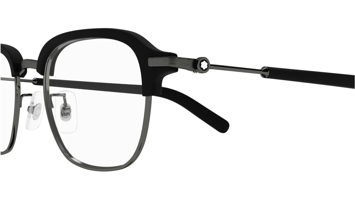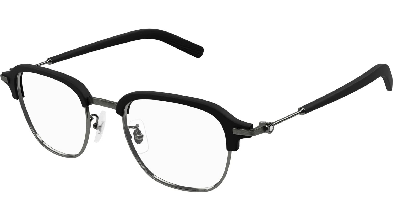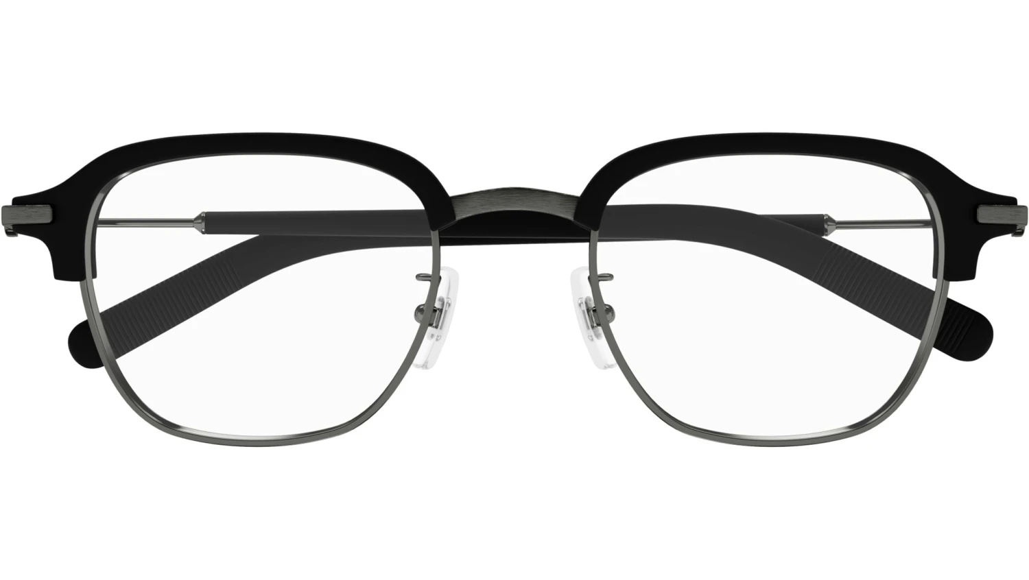 Montblanc MB0390O 002 glasses for men, featuring shiny dark ruthenium / matte black ciliar rectangular metal frame and demo lenses. Brand line: Snowcap. Style code: MB0390O. Color code: 002. Made in Japan. Authorized Montblanc online reseller. Your glasses will include the original case and accessories and are covered by a 12-month global warranty.