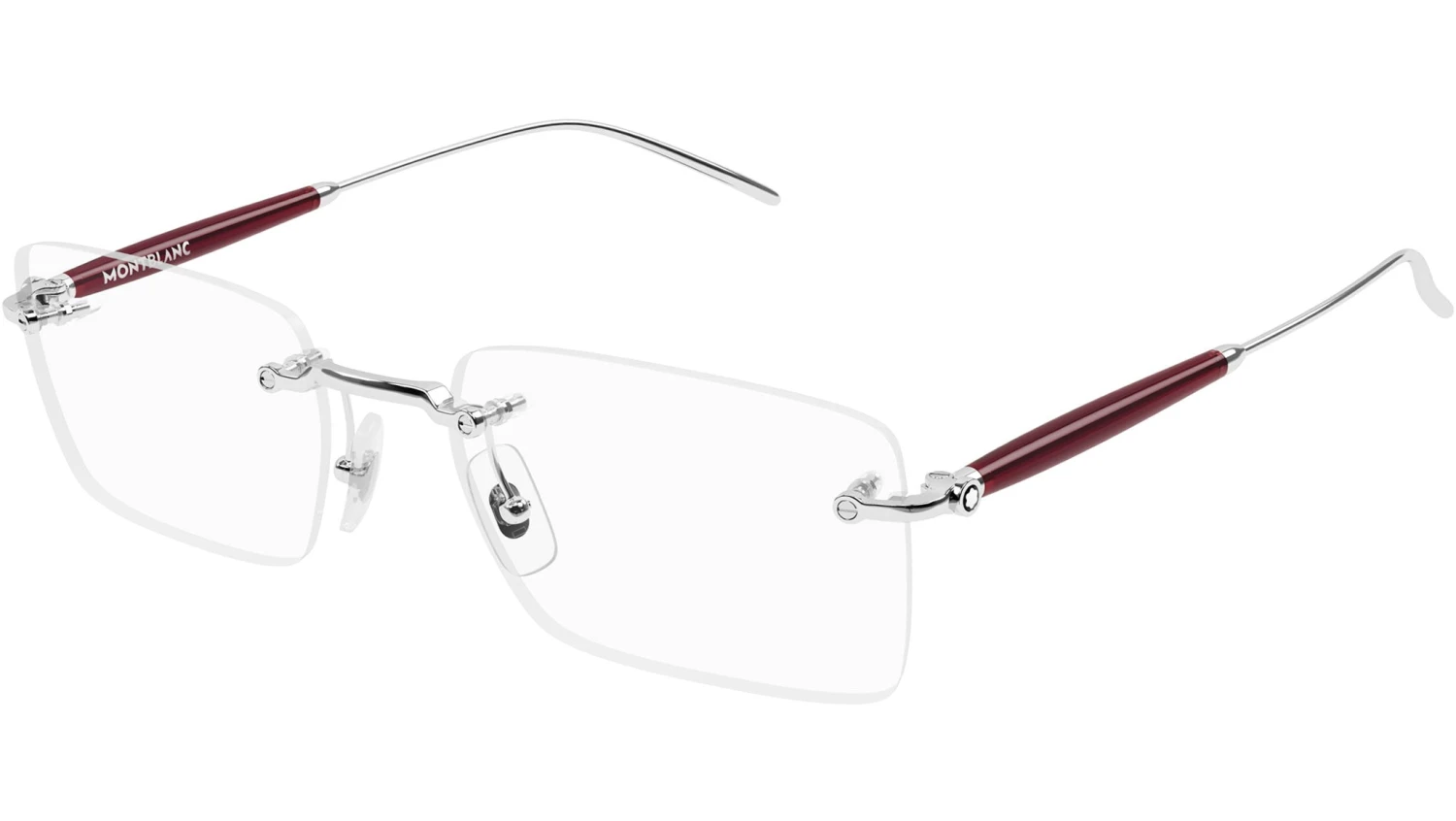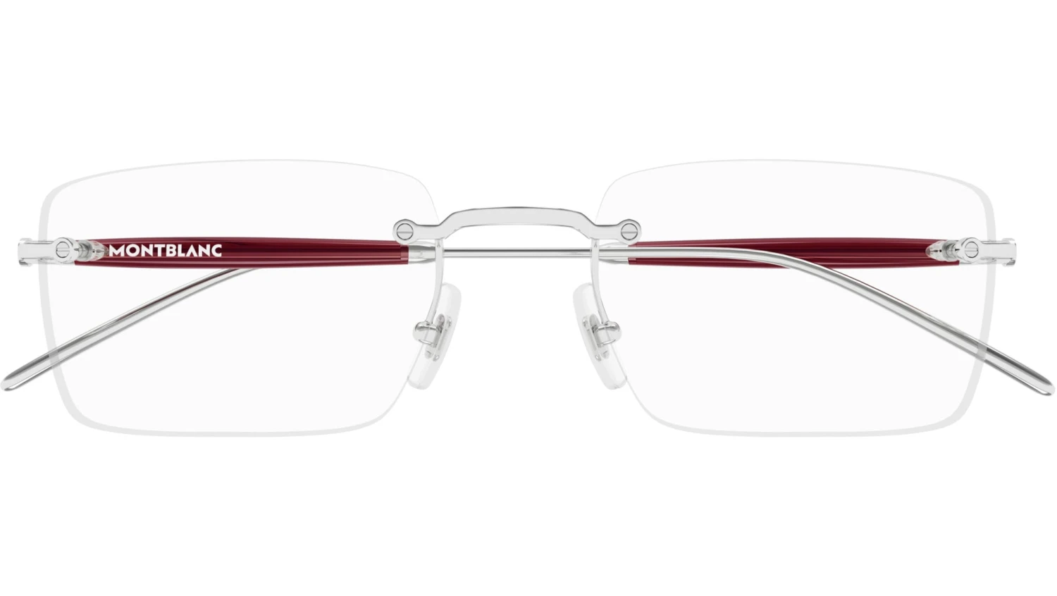 Montblanc MB0411O 003 glasses for men, featuring shiny silver rectangular metal frame and demo lenses. Brand line: Meisterstück. Style code: MB0411O. Color code: 003. Made in Japan. Authorized Montblanc online reseller. Your glasses will include the original case and accessories and are covered by a 12-month global warranty.