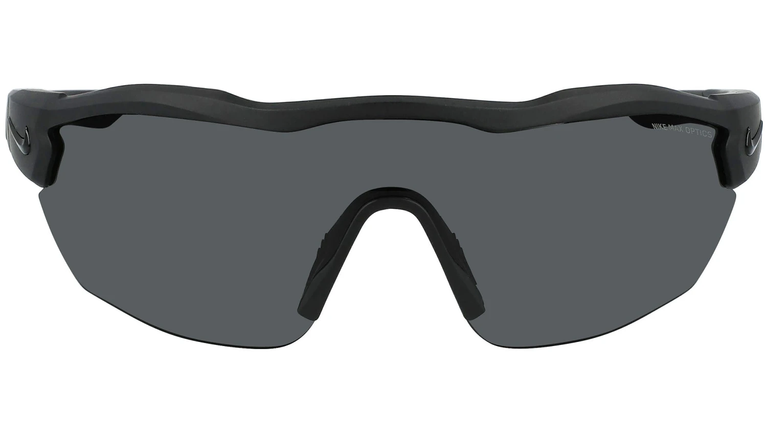 Nike Show X3 Elite line sunglasses model DJ2028-011 featuring matte solid black frame and dark grey lens.