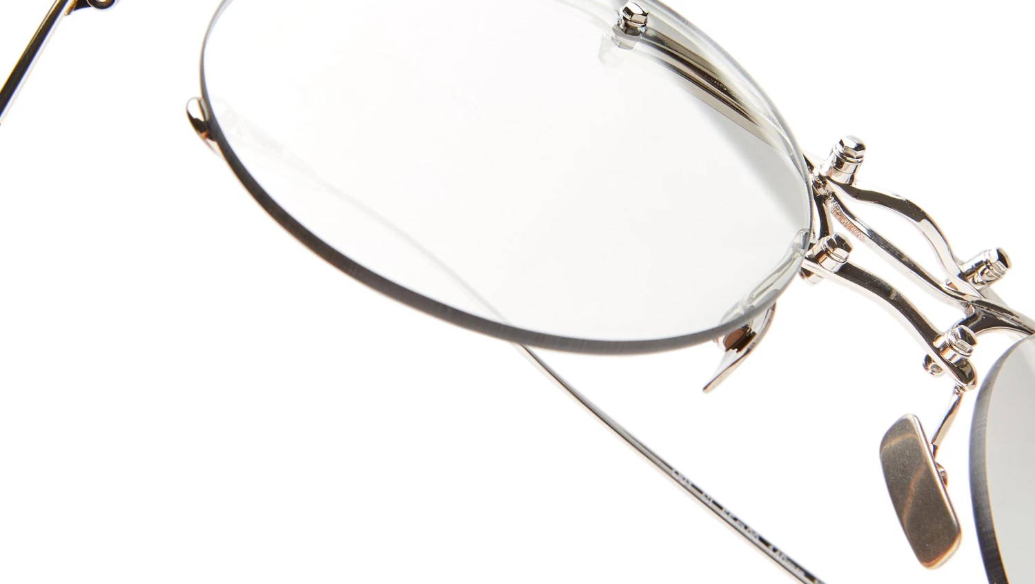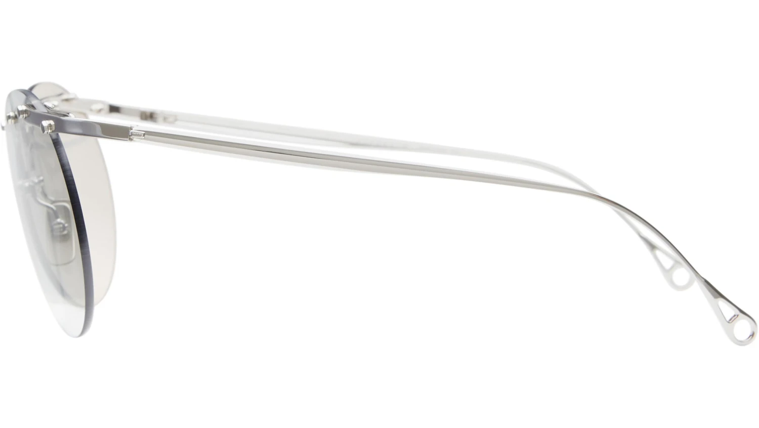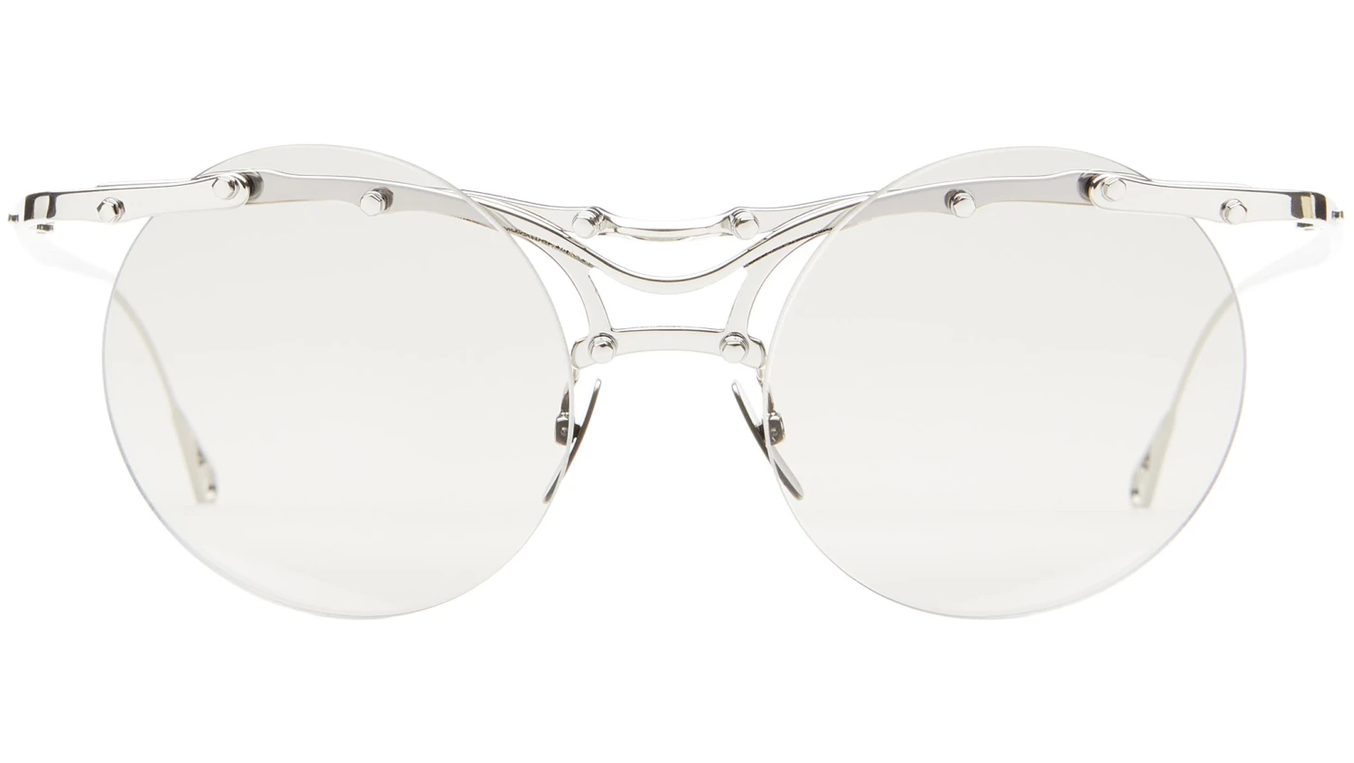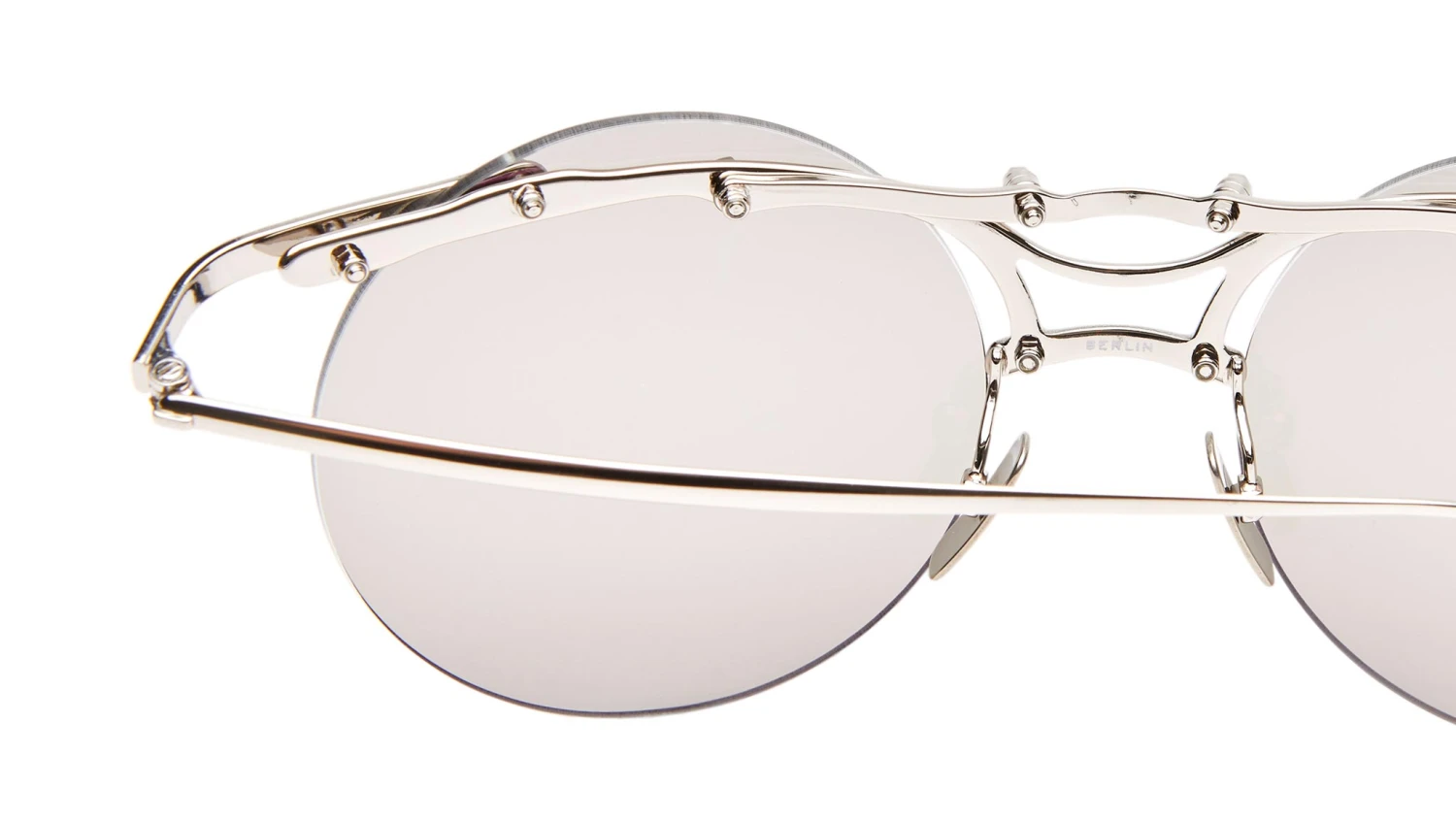 Innerraum Eyewear Object O01 blends an intersecting top bar metal-construction with rimless round lenses. Fluidly shifting between the organic and synthetic realms, this frame is enhanced by a distinctive triple metal-bridge, multiple top bar screws and adjustable titanium nose pads. Available in Black Matt with Dark Grey lenses or in luminous Silver with Silver lenses.
