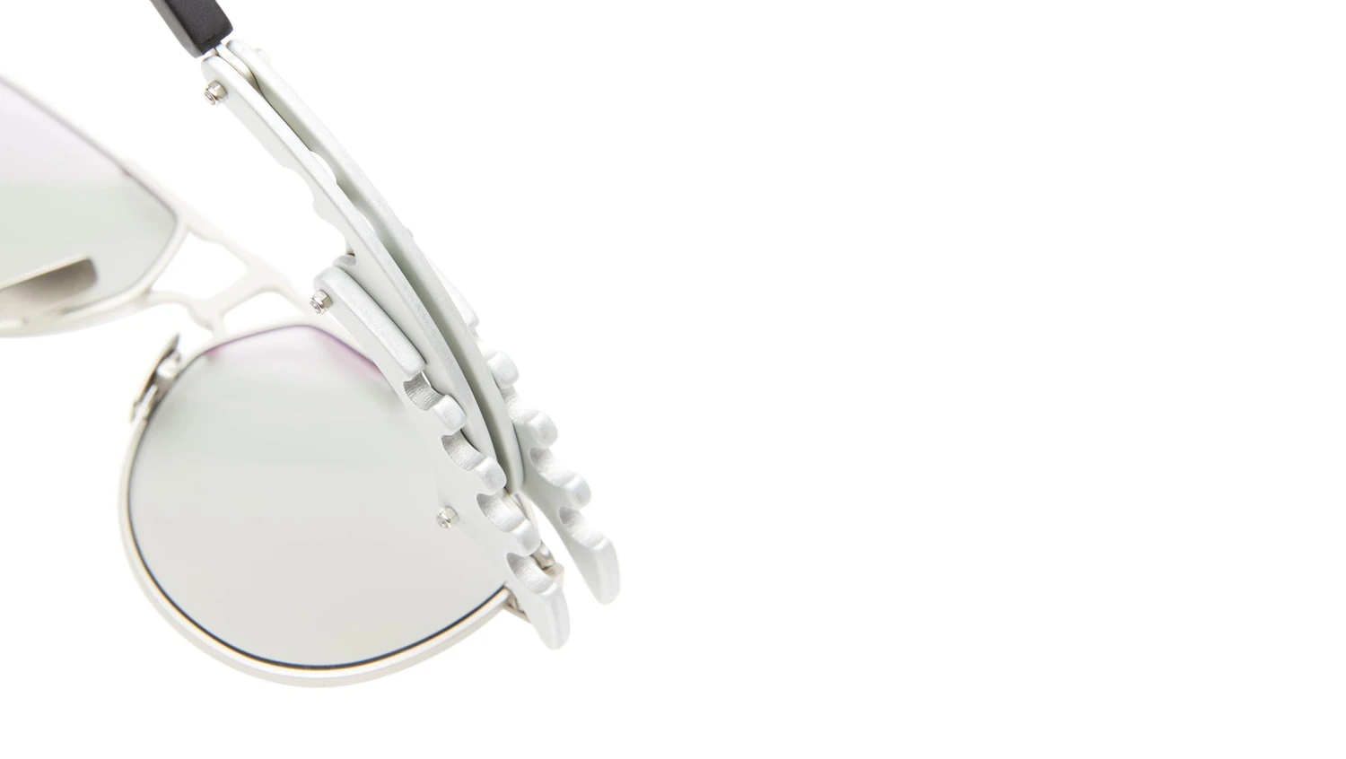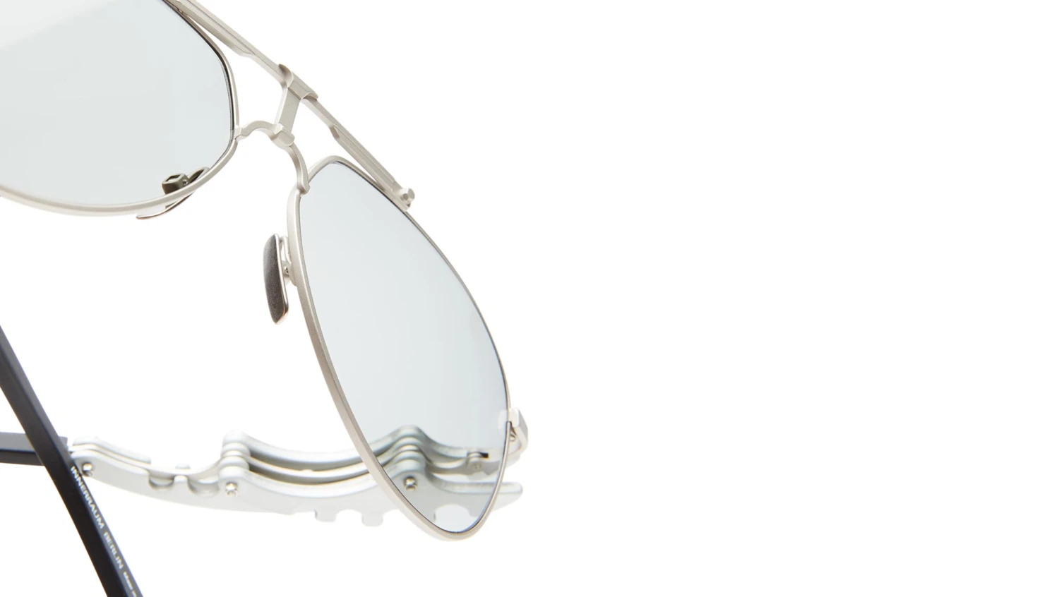 Innerraum Eyewear Object O20 expands the ultimate aviator silhouette with an elaborate temple design, foregrounding networked spaces that fluidly merge into a multi-layered assemblage of biomechanical aluminum components held together by screws, then transitioning into acetate temple tips. Its minimalistic frontal design is enhanced by a T-shaped nose bridge and matte finishing, complemented by adjustable titanium nose pads for added comfort. Available in an all-Black silhouette with Dark Grey lenses, Gold Matt with Gold Orange lenses and triple-colored temples in Black, Orange & Gold, or Silver Matt with 24h Grey lenses and Silver and Black temples.