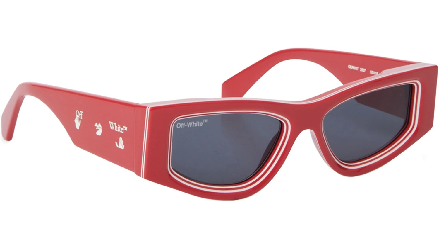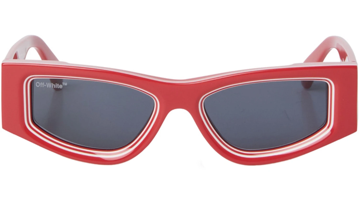 Andy sunglasses are a multi-layer color block. The front acetate frame is distinguished by a play of volumes for a graphic effect. It is an art piece. The final effect is a four-dimensional sculpture: in addition to the sculpted three-dimensional volumes, we played with blocks of solid color and white, creating the effect of amplified lenses. The swimming man Off-White logo enriches the temples, further iconic touch to the style.