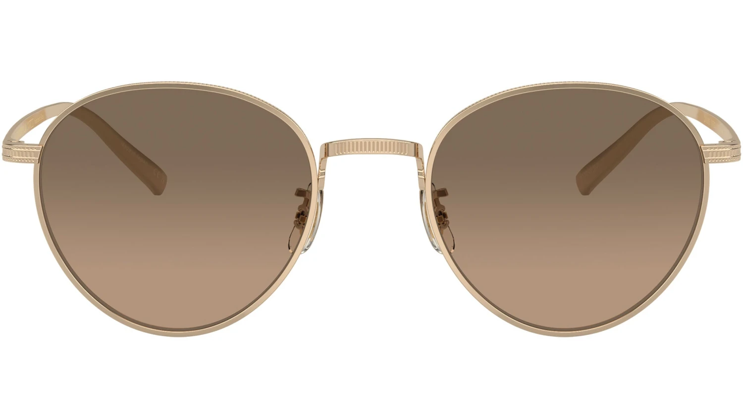 Oliver Peoples unisex sunglasses model OV1336ST featuring gold full rim titanium frame and base 2.5 glass sandstone gradient polar lens. High bridge fit. Frame line: Essentials. Brand code: OV 1336ST. Color code: 5035GN. Authorised Oliver Peoples Online Reseller. Your glasses will come including the original case and accessories and will be covered by 12 month global warranty.
