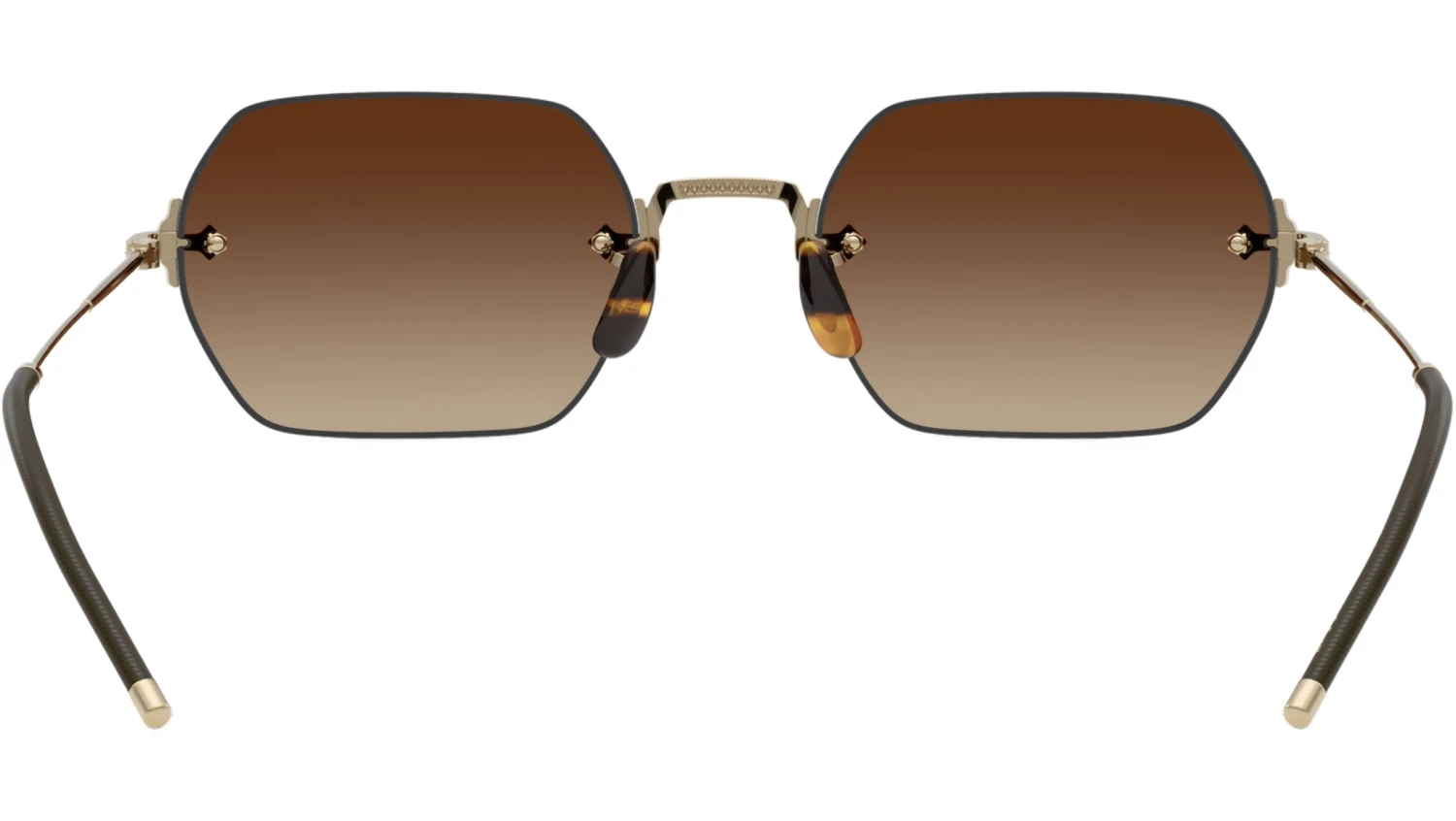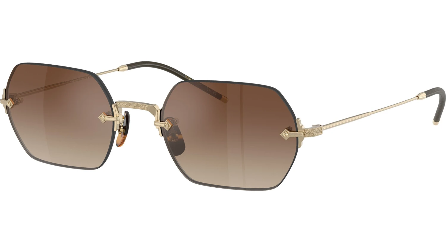Oliver Peoples TK-13 OV1353ST 5035Q1 sunglasses for men and woman, featuring gold geometric titanium frame and dark brown gradient mirror CR-39 lenses. Adjustable nosepads. Brand line: Essentials. Style code: 0OV1353ST. Color code: 5035Q1. Made in Japan. Authorized Oliver Peoples online reseller. Your glasses will include the original case and accessories and are covered by a 12-month global warranty.