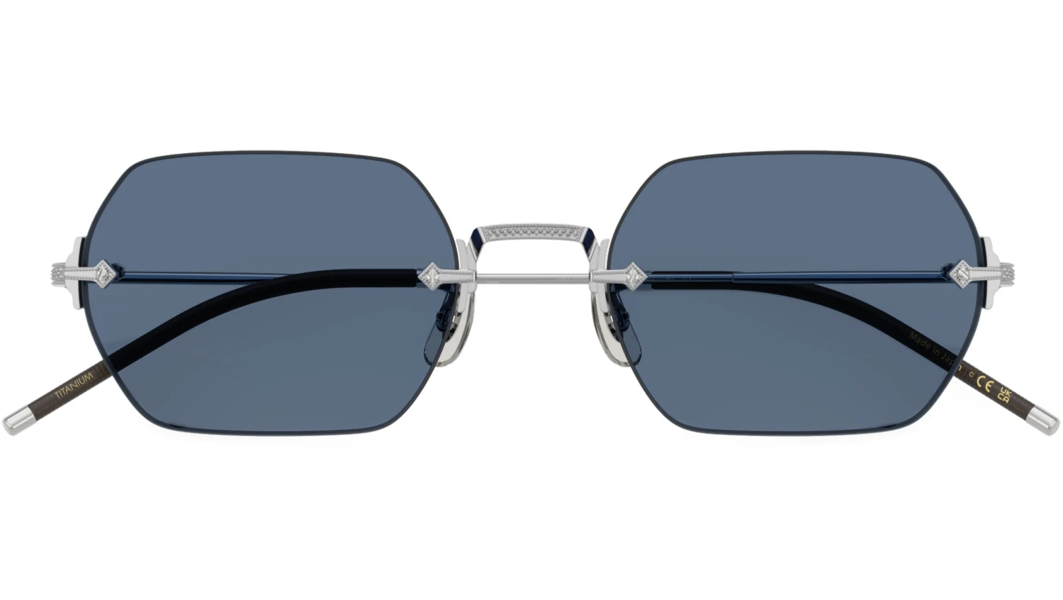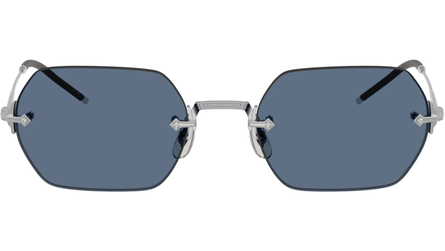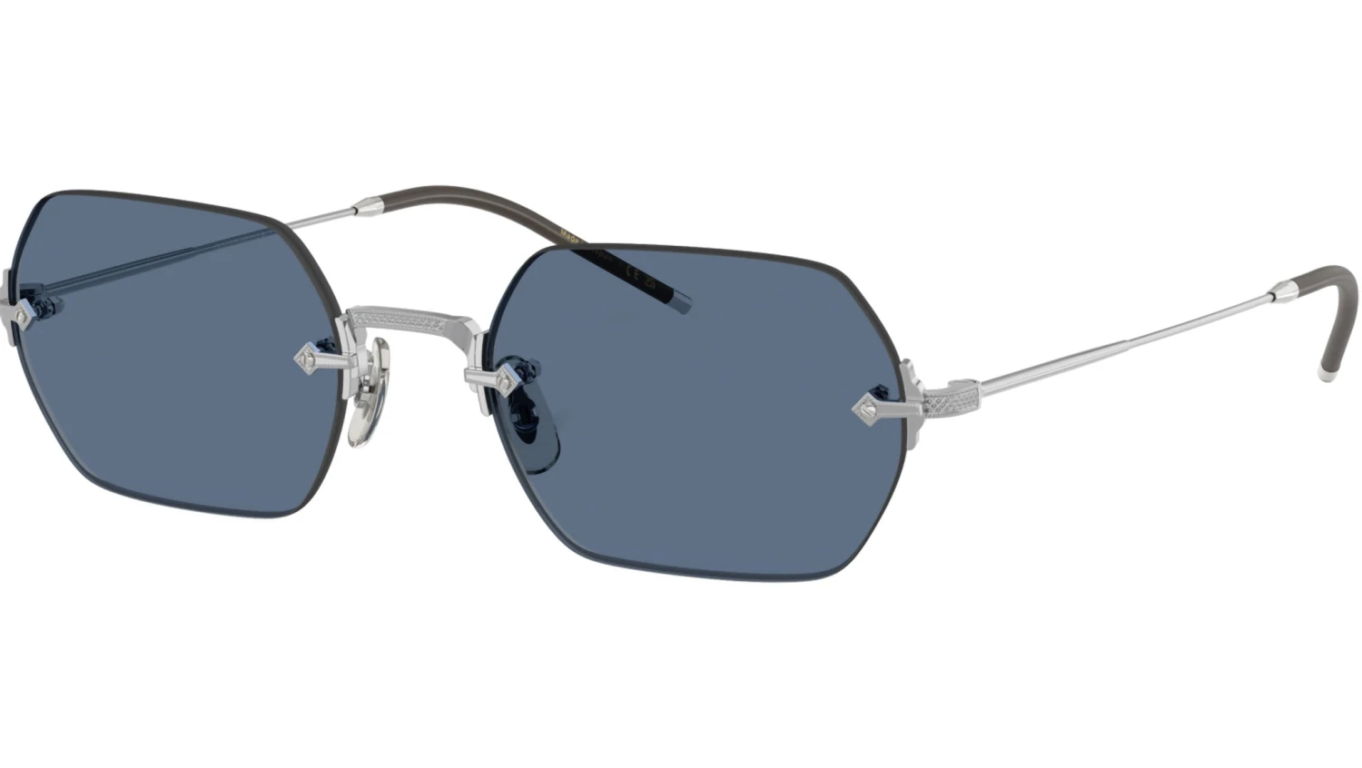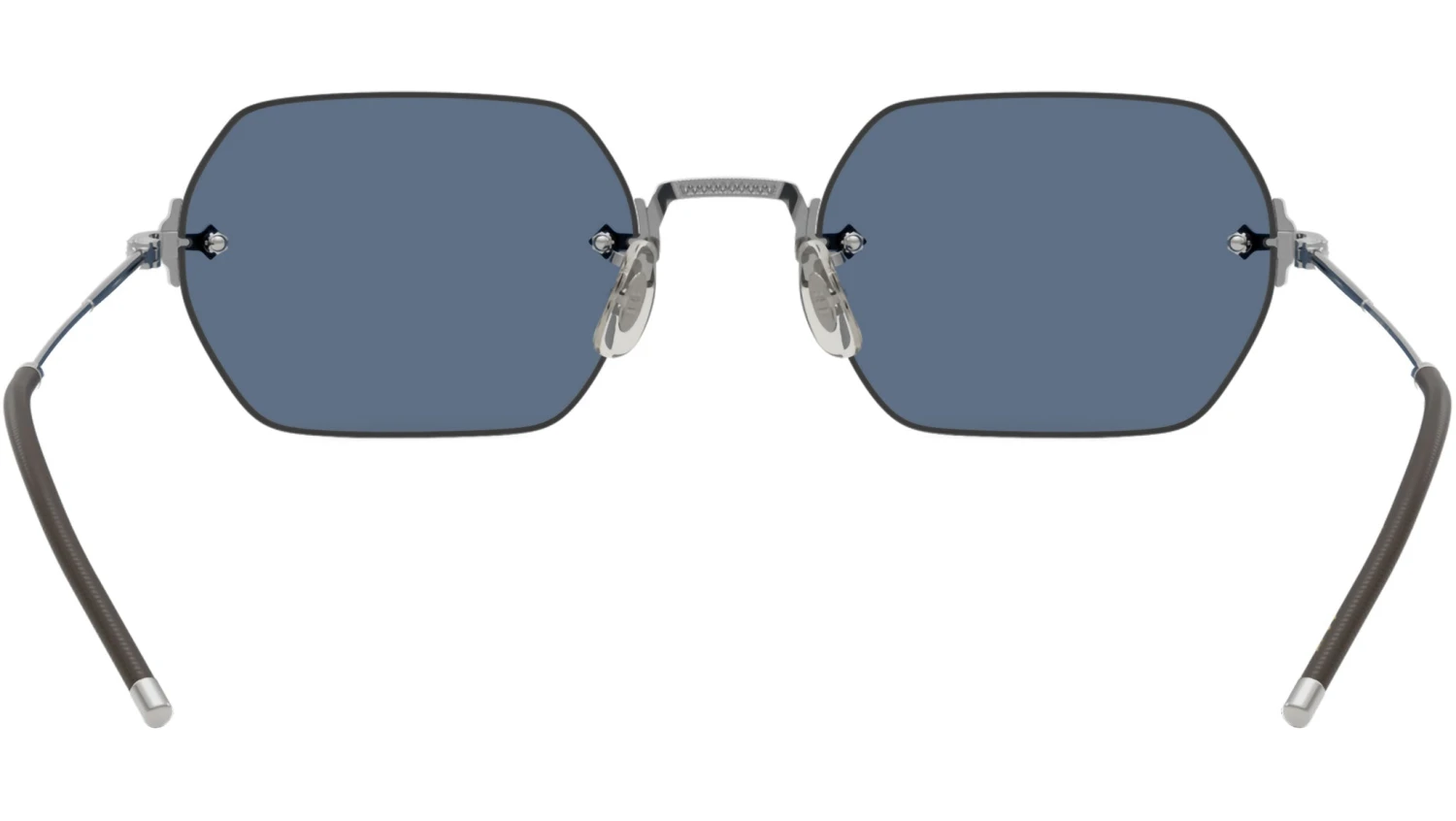 Oliver Peoples TK-13 OV1353ST 503680 sunglasses for men and woman, featuring silver geometric titanium frame and blue CR-39 lenses. Adjustable nosepads. Brand line: Essentials. Style code: 0OV1353ST. Color code: 503680. Made in Japan. Authorized Oliver Peoples online reseller. Your glasses will include the original case and accessories and are covered by a 12-month global warranty.