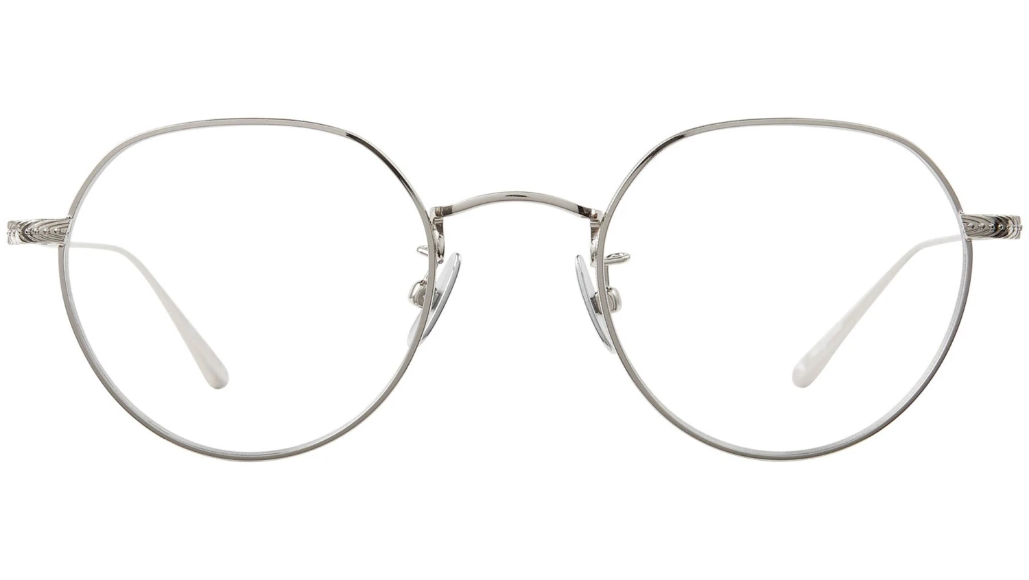 Garrett Leight Patrick glasses featuring silver round metal frame and demo lens lenses. The Patrick features a sleek, flat-topped P3 all-metal frame with refined coin-edge detailing along the eye wire and intricate filigree on the endpieces. Its all-metal temples and screw-in titanium nose pads ensure both durability and comfort. Offered in a range of classic plating colors, this model is designed for unisex appeal. Technical features include hand-finished optical quality CR-39 lenses, Saturn endpiece filigree, 4 base lens with backside anti-reflective coating, and the inclusion of a GLCO soft case and cleaning cloth. Brand line: GLCO. Style code: 3074. Color code: SV. Authorized Garrett Leight online reseller. Your glasses will include the original case and accessories and are covered by a 12-month global warranty.
