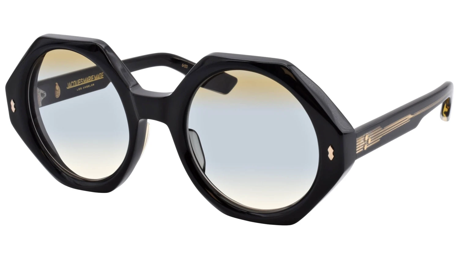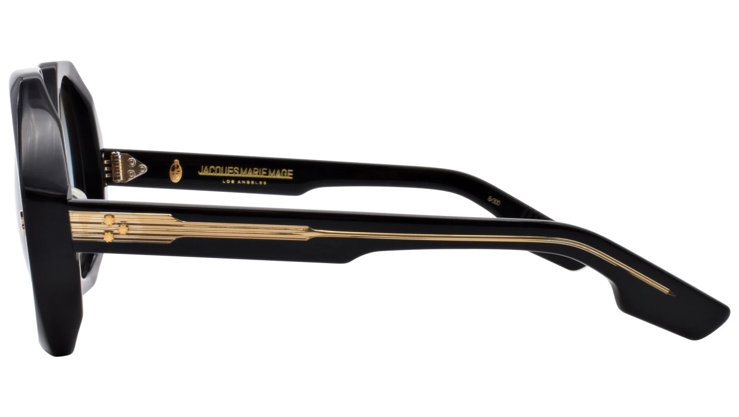 Oversized, feminine, ’60s-inspired glasses; a new addition to the Women’s Series. Black 10mm cured cellulose acetate frame. Custom double laminated acetate temples featuring precious metal hardware and brown gradient lenses. Light gold double arrowhead front pin. Light gold exposed wirecore. Light gold tension-secured custom 7 barrel hinge. Dark gold domed 3D metal logo. Kalahari tri-gradient 8 base CR-39 lens with backside anti-reflective treatment. 100% UV protection.
