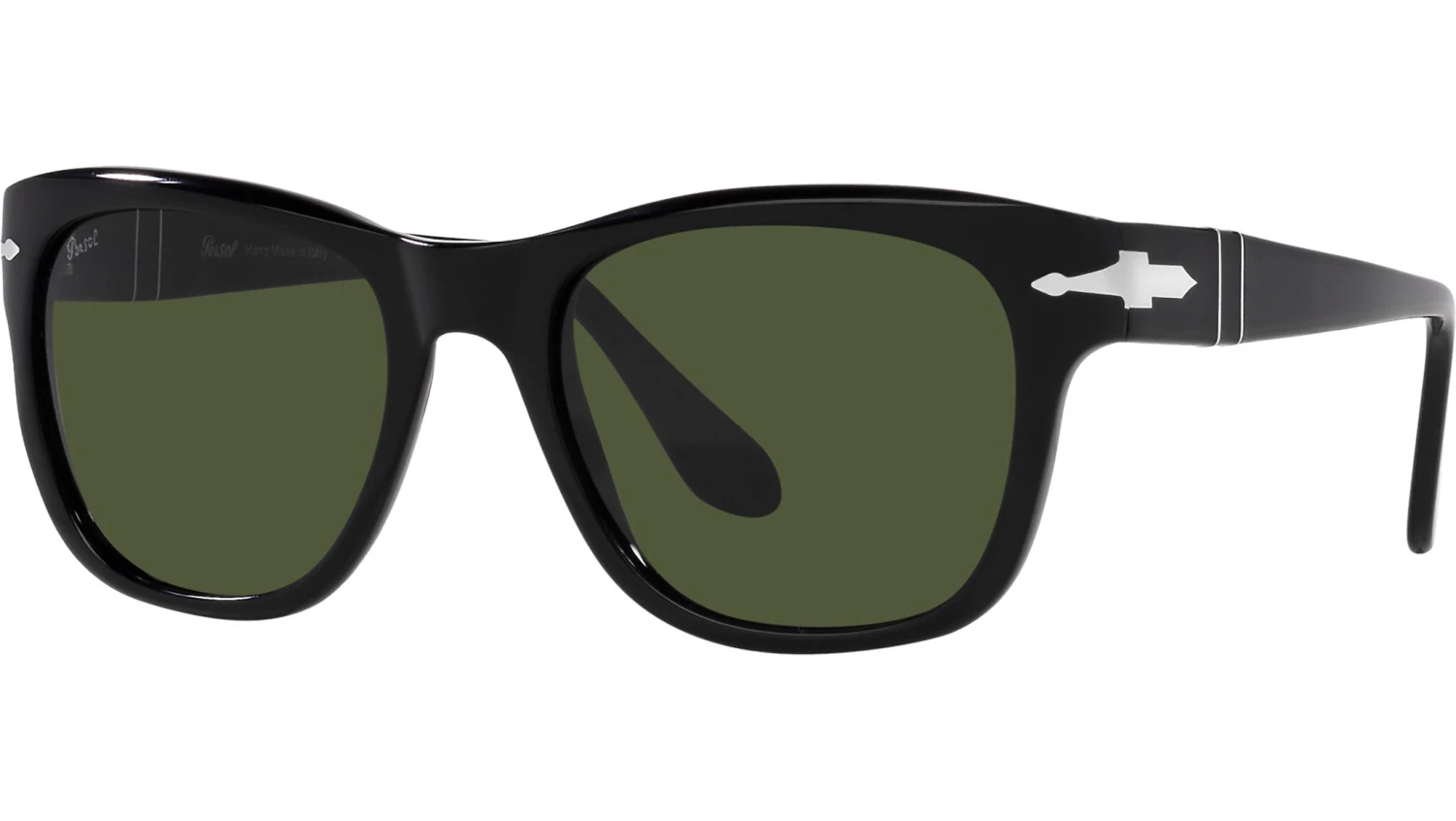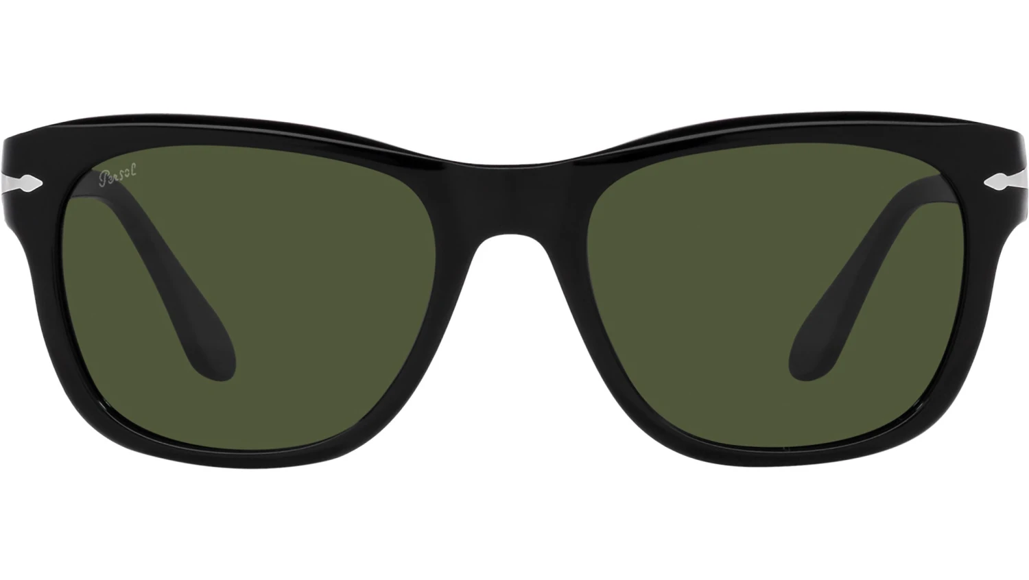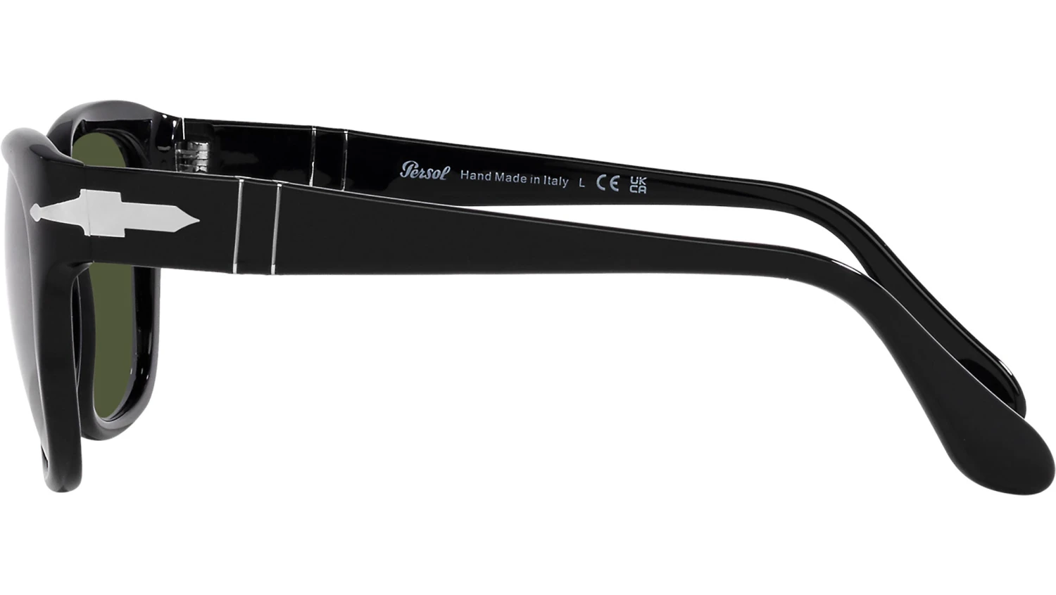 Persol sunglasses model PO3313S color code 95/31 featuring black full rim acetate frame and glass green lenses. Meticulous attention to every intricate detail ensures distinct styles and practical solutions. Driven by an unwavering passion for skill refinement and an unrelenting pursuit of innovation, Persol embodies true quality. Embodying its evocative name, which signifies “for sun” this brand stands as a testament to a rich heritage of superior craftsmanship and excellence. Persol seamlessly blends aesthetics and technology, representing the epitome of handcrafted Italian manufacturing. Renowned for its timeless design and artistry, the brand has become a beloved choice within the realm of cinema.