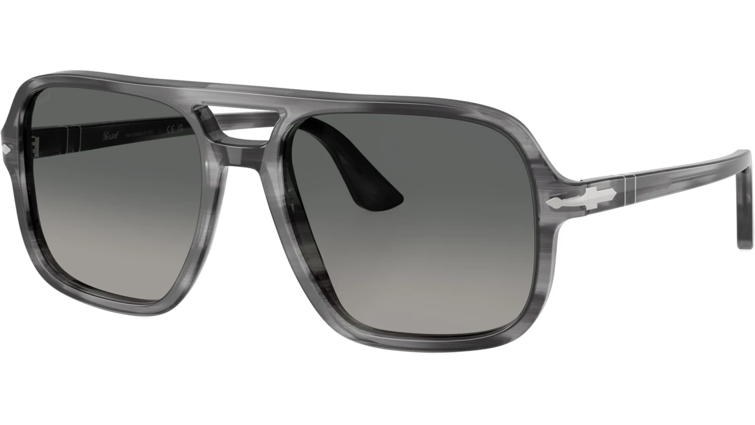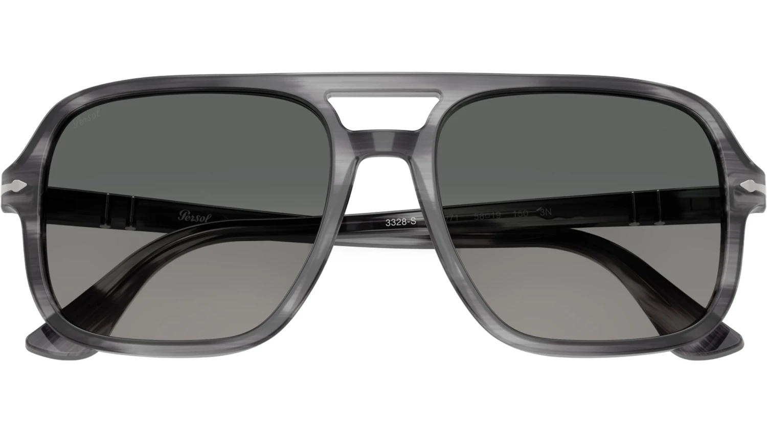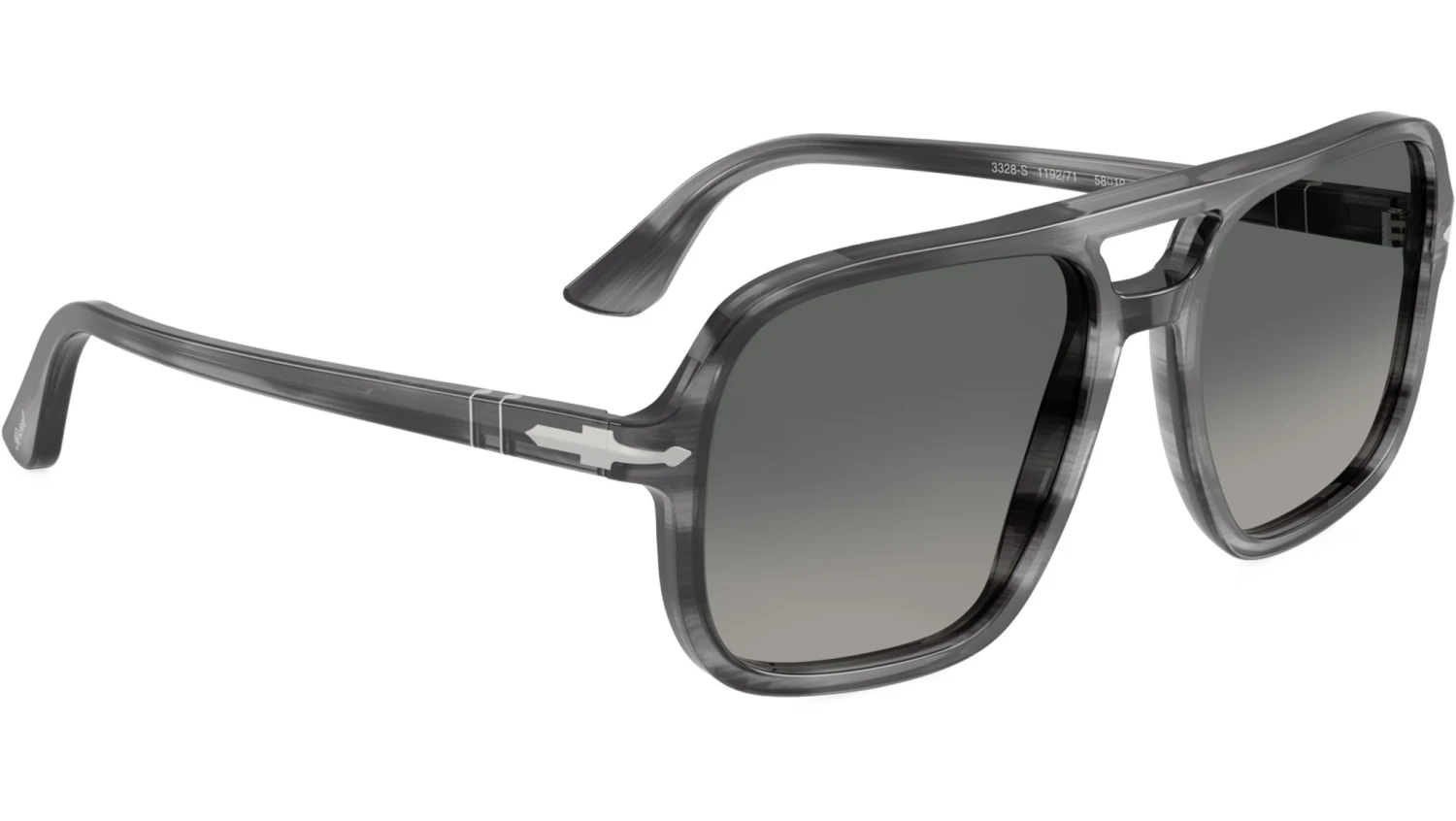 Persol sunglasses for men model PO3328S 119271 featuring striped grey acetate frame and grey gradient dark base 6 lenses. High bridge fit. Frame line: Officina. Brand code: 0PO3328S. Color code: 119271. Authorised Persol Eyewear Online Reseller. Your glasses will come including the original case and accessories and will be covered by 12 month global warranty.