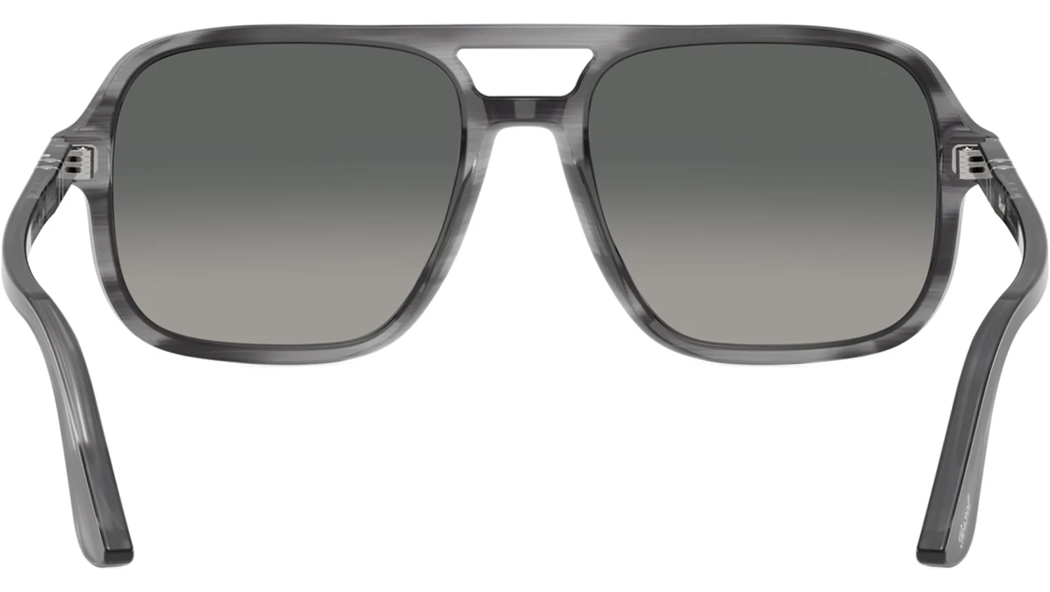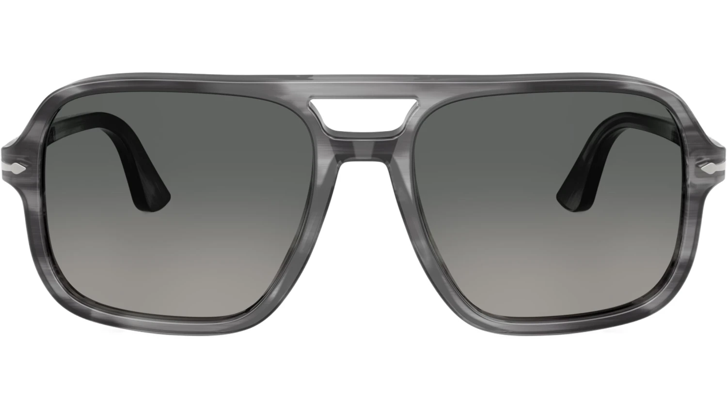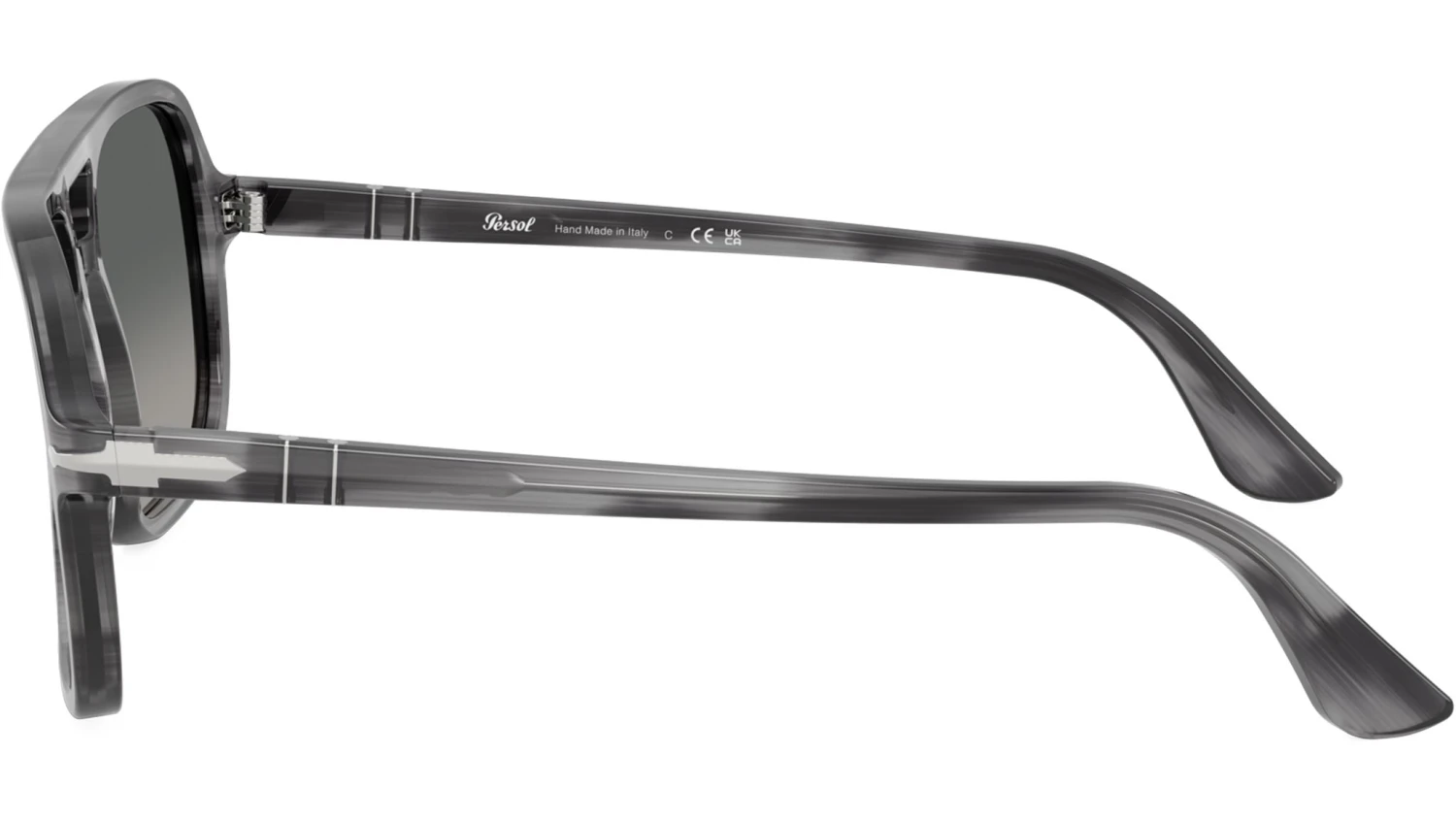 Persol sunglasses for men model PO3328S 119271 featuring striped grey acetate frame and grey gradient dark base 6 lenses. High bridge fit. Frame line: Officina. Brand code: 0PO3328S. Color code: 119271. Authorised Persol Eyewear Online Reseller. Your glasses will come including the original case and accessories and will be covered by 12 month global warranty.