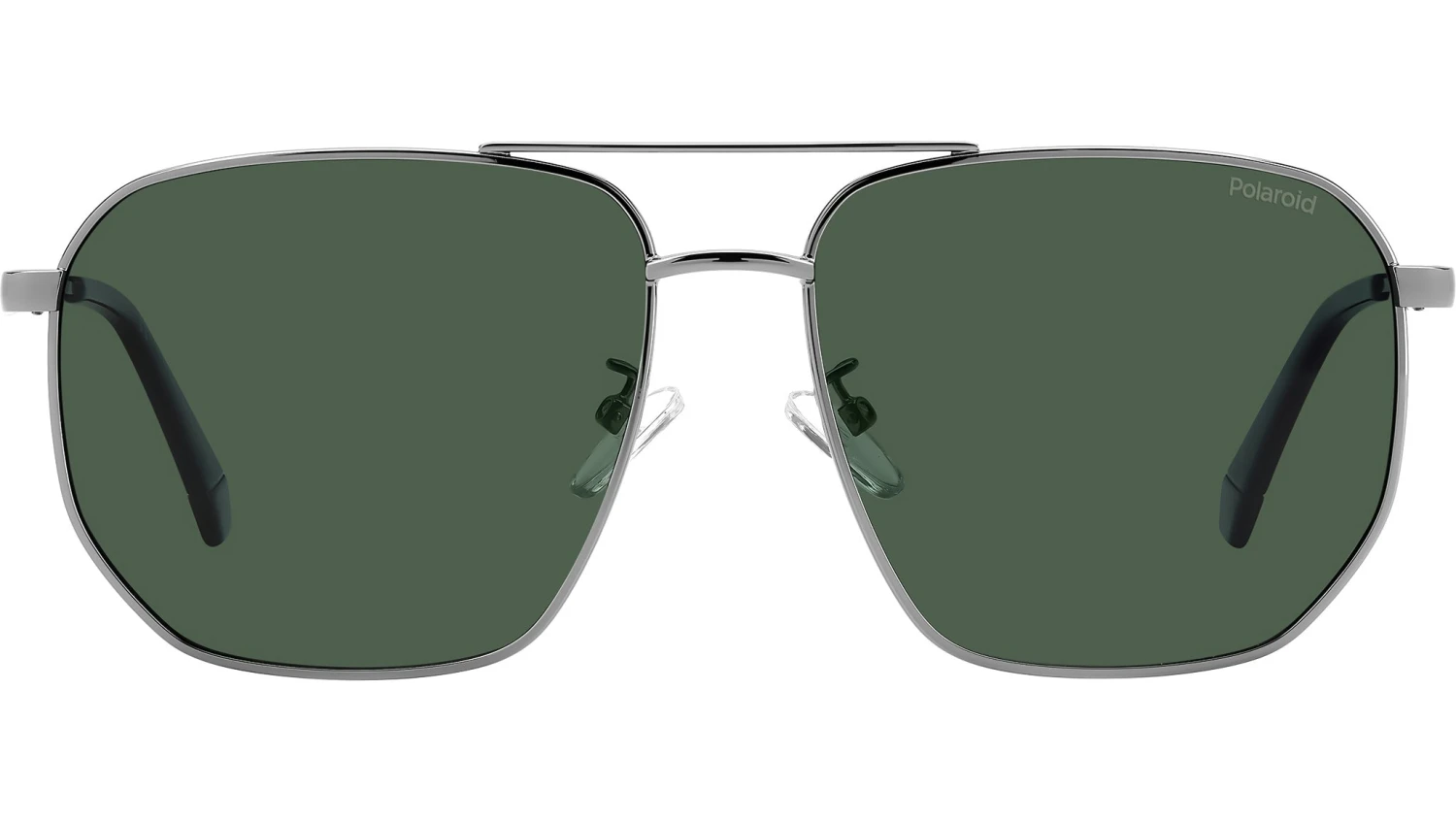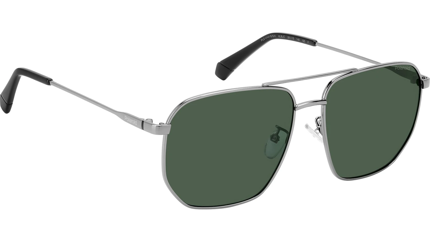 Polaroid PLD 4141/G/S/X 6LB UC sunglasses for men, featuring ruthenium squared metal frame and green polarized lenses. The geometric front of these Polaroid sunglasses for men comes with a double bridge and rests on adjustable nose pads. The metal frames can be fitted with prescription lenses, and they flow into temples customised by a colourful detail, and tone-on-tone end tips. Brand line: Essential. Style code: 205708. Color code: 6LB UC. Authorized Polaroid online reseller. Your glasses will include the original case and accessories and are covered by a 12-month global warranty.