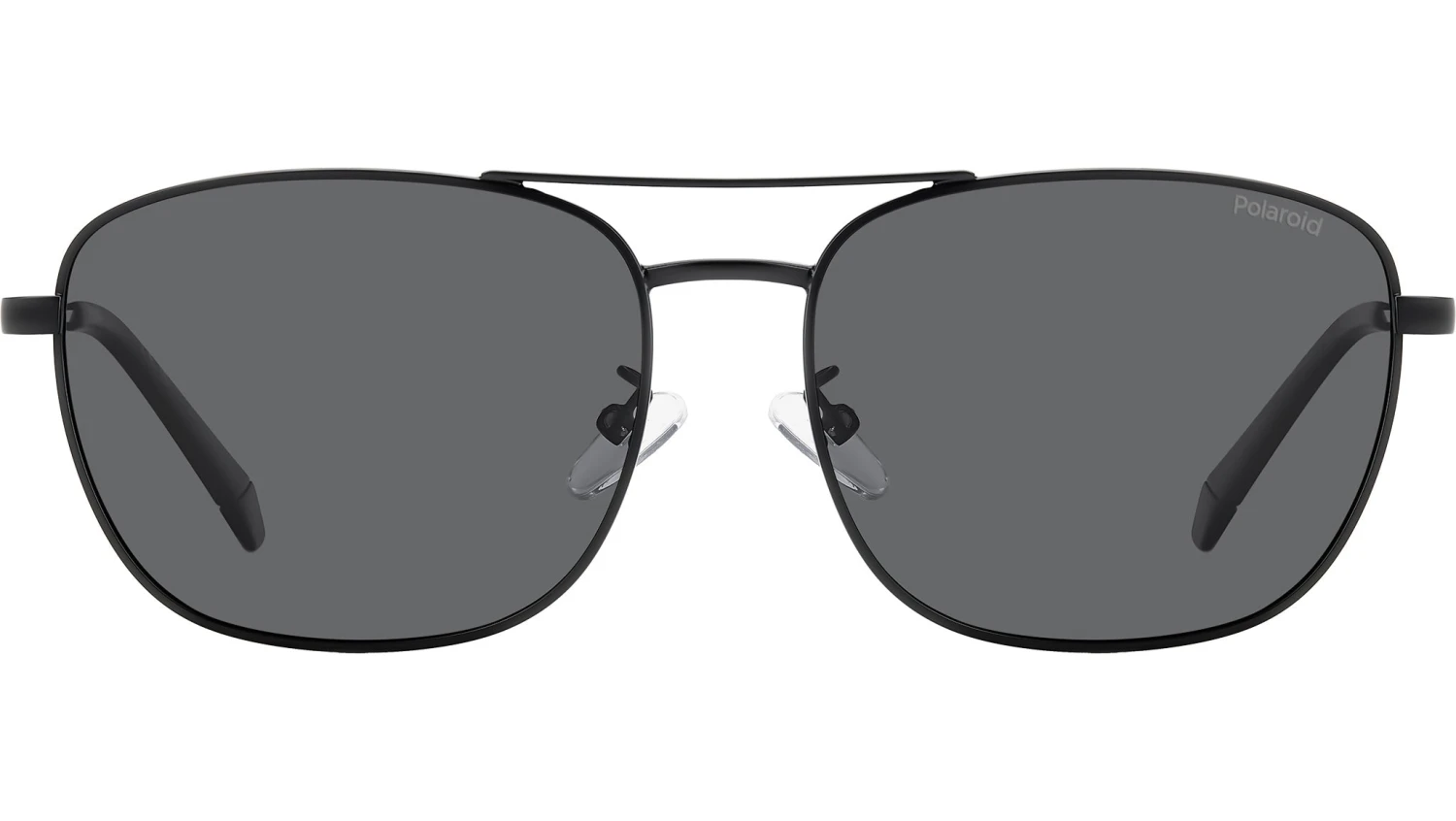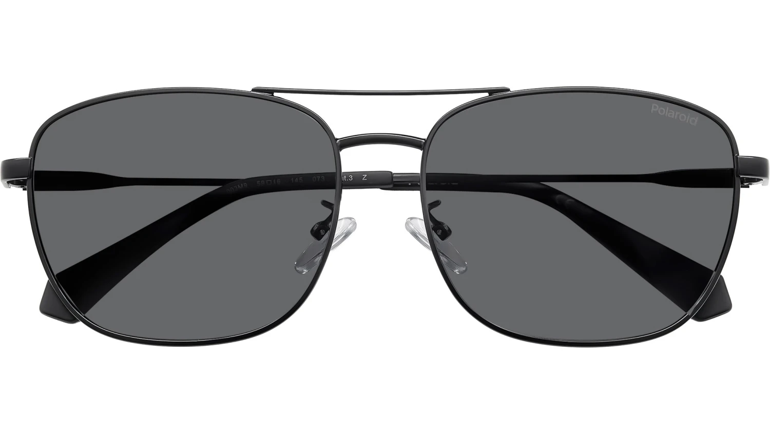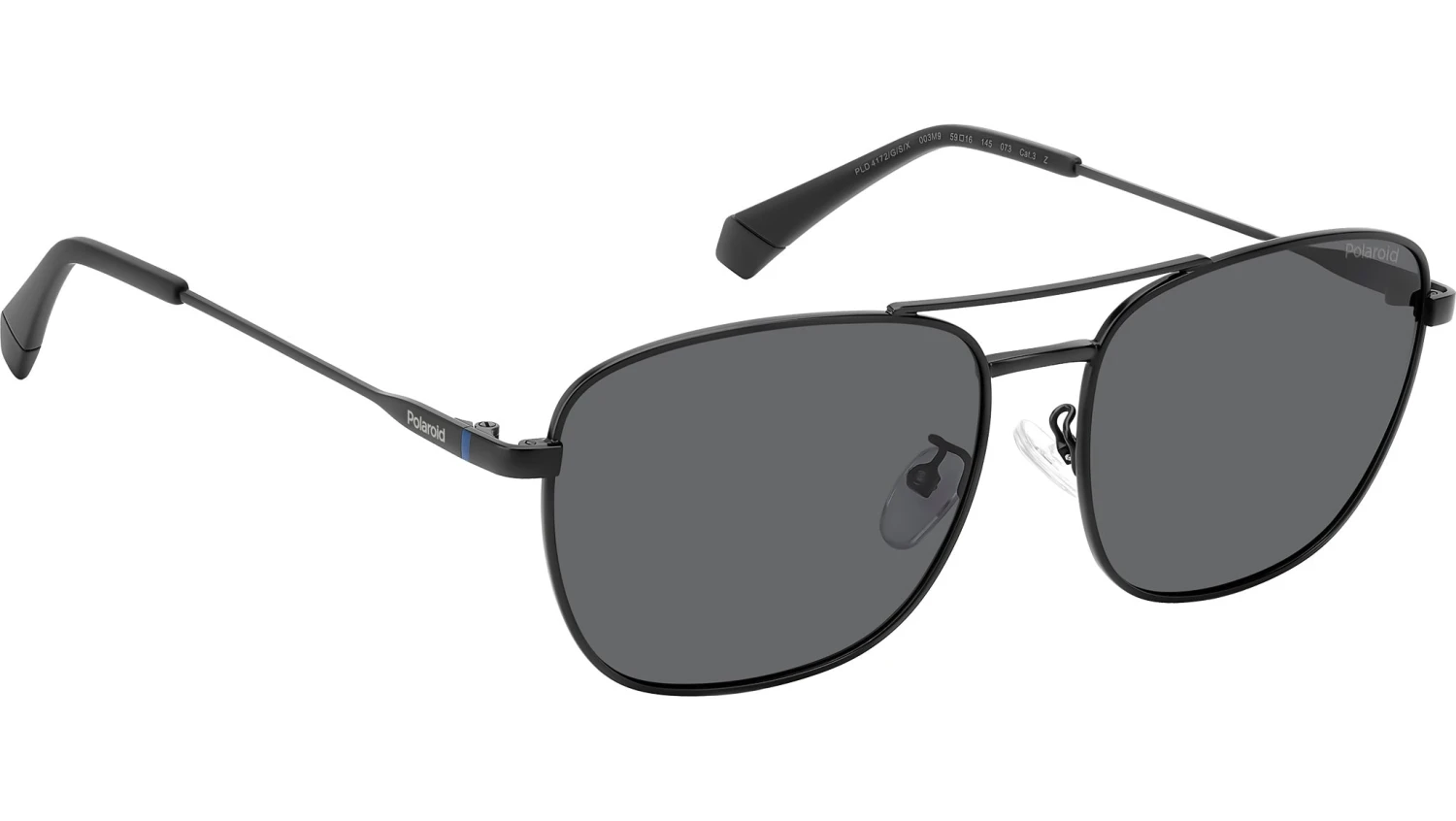 Polaroid PLD 4172/G/S/X 003 M9 sunglasses for men, featuring matte black squared metal frame and grey polarized lenses. Polaroid sunglasses for demanding men who want to elevate their style. The vintage vibe comes from the lightweight stainless steel frames, connected by a double bridge and resting on nose pads. Polaroid always includes a pop touch, in this case it’s the colourful line and laser-engraved logo on the temples. The rims can hold prescription lenses, and the Global Fit of this style adapts to all nose shapes. Brand line: Essential. Style code: 206793. Color code: 003 M9. Authorized Polaroid online reseller. Your glasses will include the original case and accessories and are covered by a 12-month global warranty.
