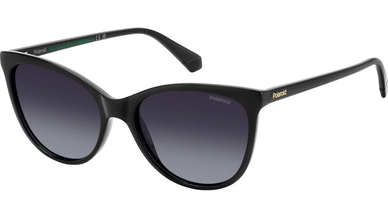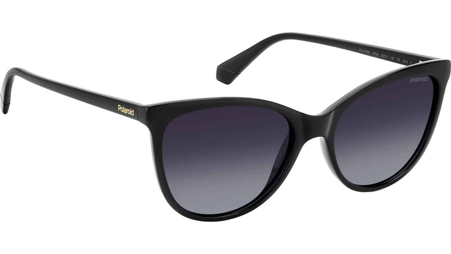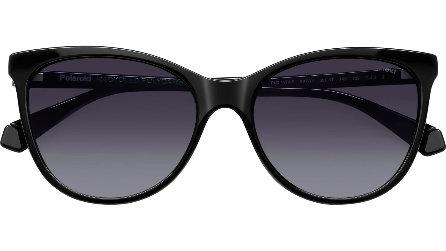 Polaroid PLD 4179/S 807 WJ sunglasses for women, featuring black cat eye polycarbonate frame and grey shaded polarized lenses. These Polaroid sunglasses are dedicated to women who seek the right balance between sophisticated design and everyday practicality. The sinuous cat-eye shape combines with sleek, slender lines to ensure lightness and comfort from morning to evening. Crafted in eco-polycarbonate, this style is a sustainable choice. Selecting the best colour for each individual personality will be a pleasure, going from classic colours to trendier options, including an ombré version. Brand line: Essential. Style code: 207369. Color code: 807 WJ. Authorized Polaroid online reseller. Your glasses will include the original case and accessories and are covered by a 12-month global warranty.