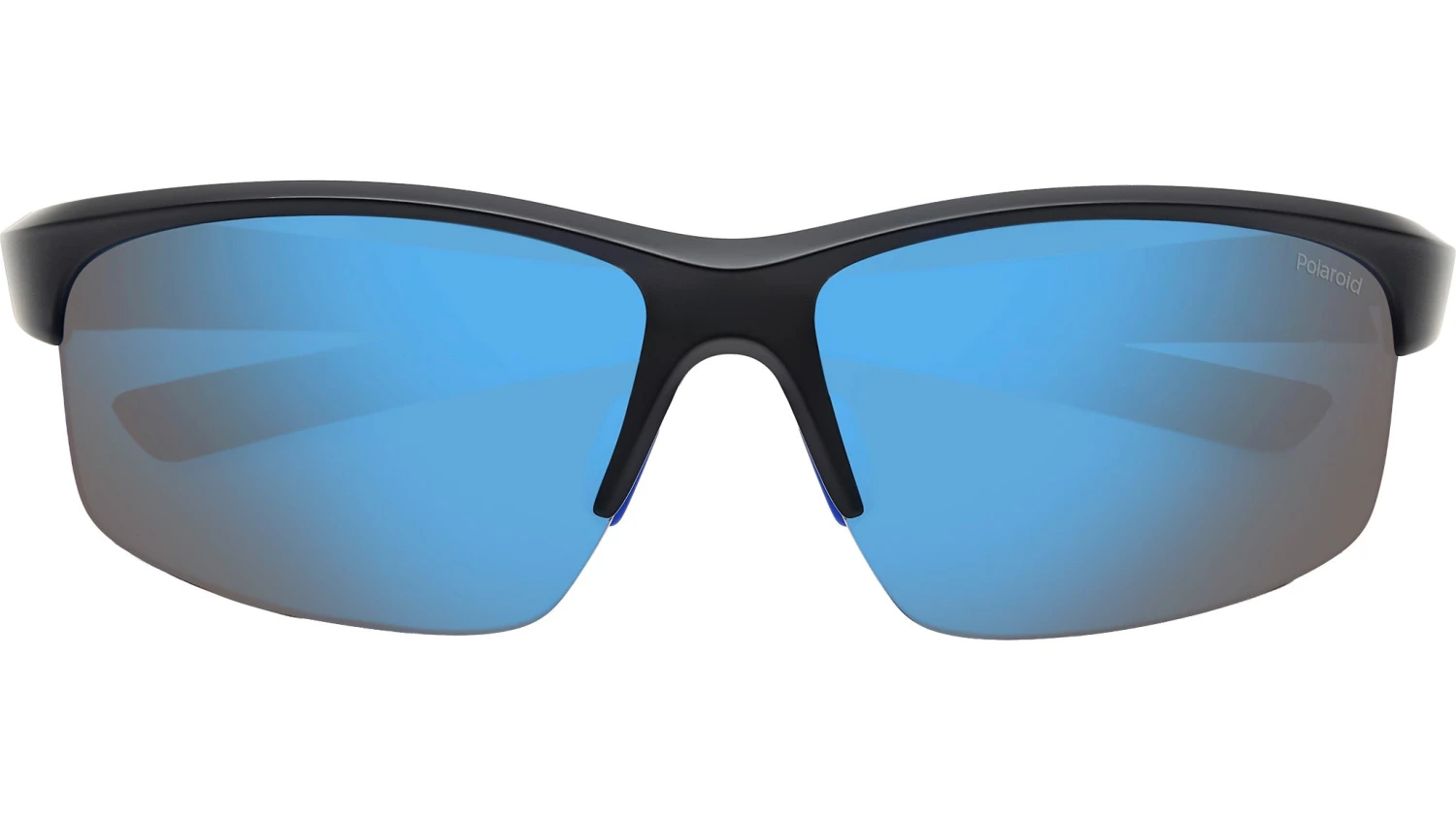Polaroid PLD 7018/N/S 0VK 5X sunglasses for men, featuring matte black blue rectangular polycarbonate frame and blue mirror polarized lenses. Brand line: Active. Style code: 201272. Color code: 0VK 5X. Authorized Polaroid online reseller. Your glasses will include the original case and accessories and are covered by a 12-month global warranty.