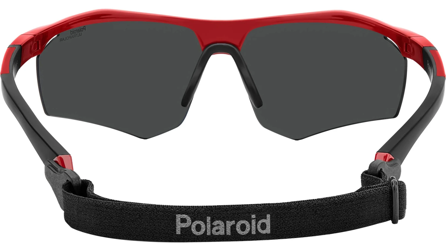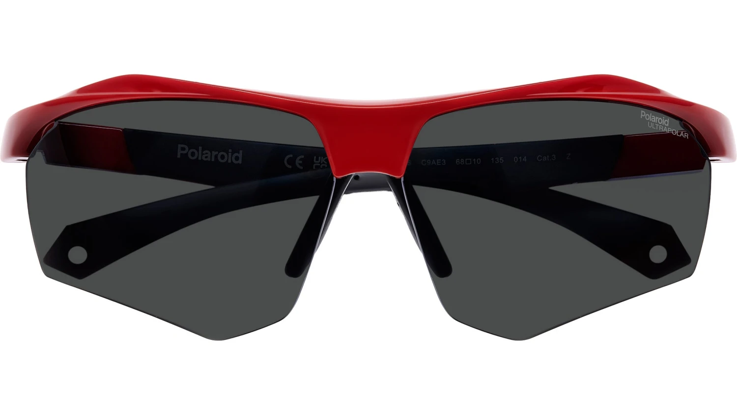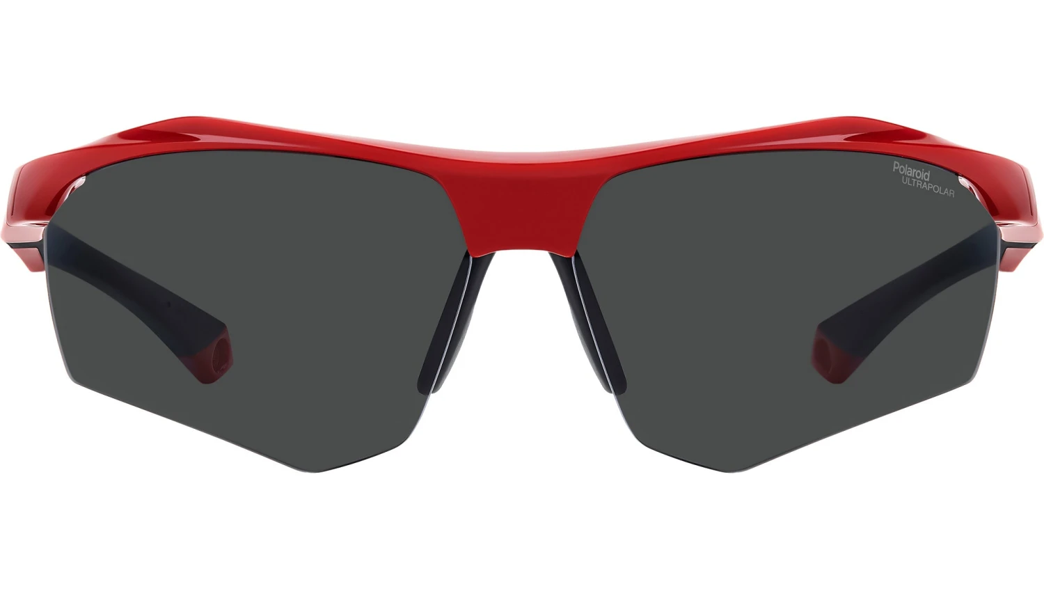 Polaroid PLD 7055/S C9A E3 sunglasses for men, featuring red rectangular polycarbonate frame and grey polarized high contrast lenses. When it comes to athletic performance, these Polaroid sunglasses can’t be beat. They’re composed of a half-rim frame with a full-coverage fit, made of polycarbonate. A secure grip is guaranteed by the rubberised nose pads and end tips, and when extra stability is needed, an elastic cord (purchased separately) can be attached via the openings. The lenses feature Ultrapolar technology for sharp, glare-free vision with boosted colors and truly defined contrast. Brand line: Active. Style code: 207374. Color code: C9A E3. Authorized Polaroid online reseller. Your glasses will include the original case and accessories and are covered by a 12-month global warranty.