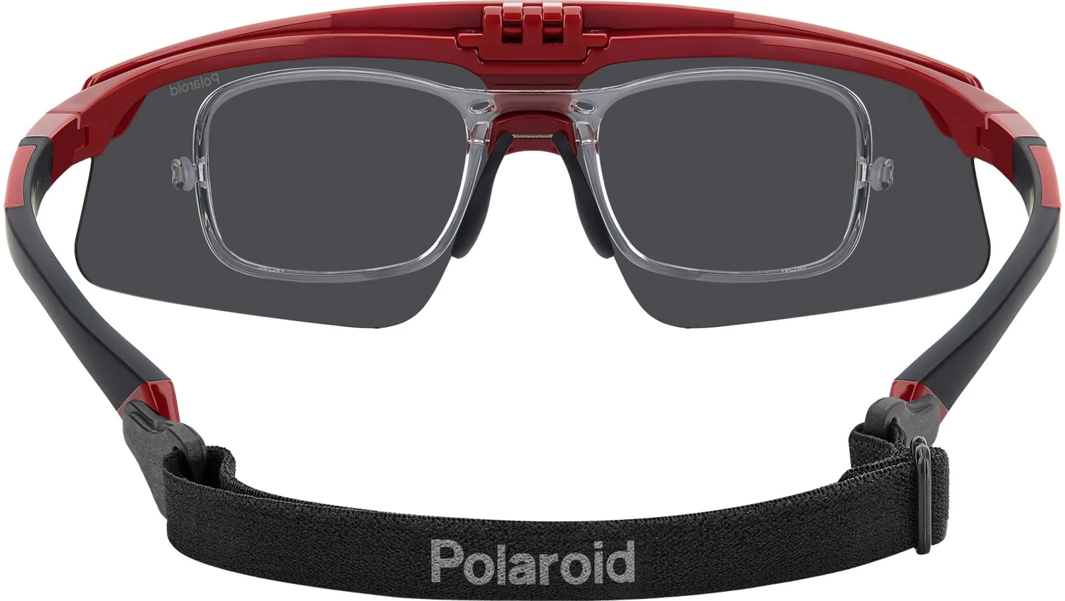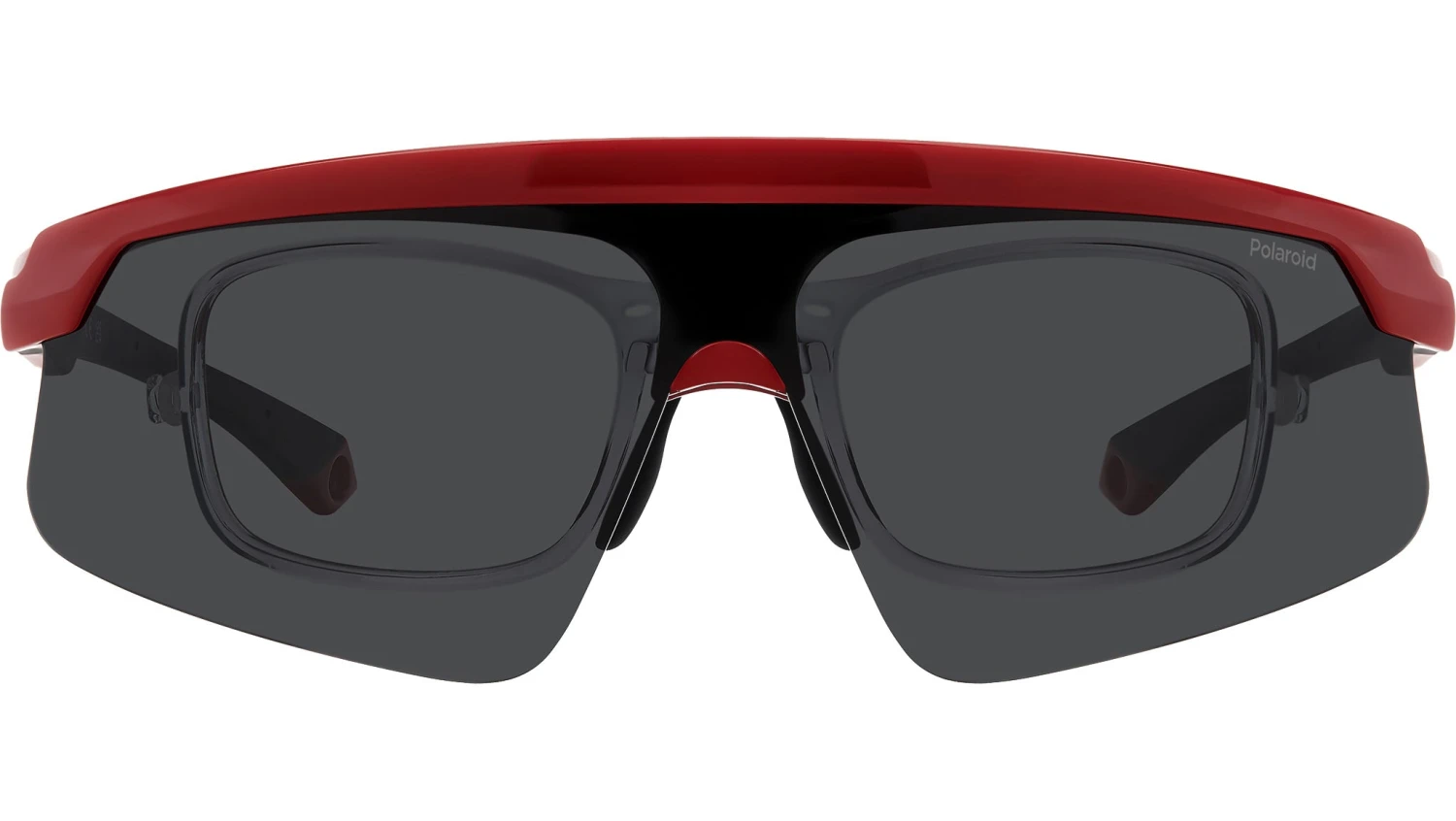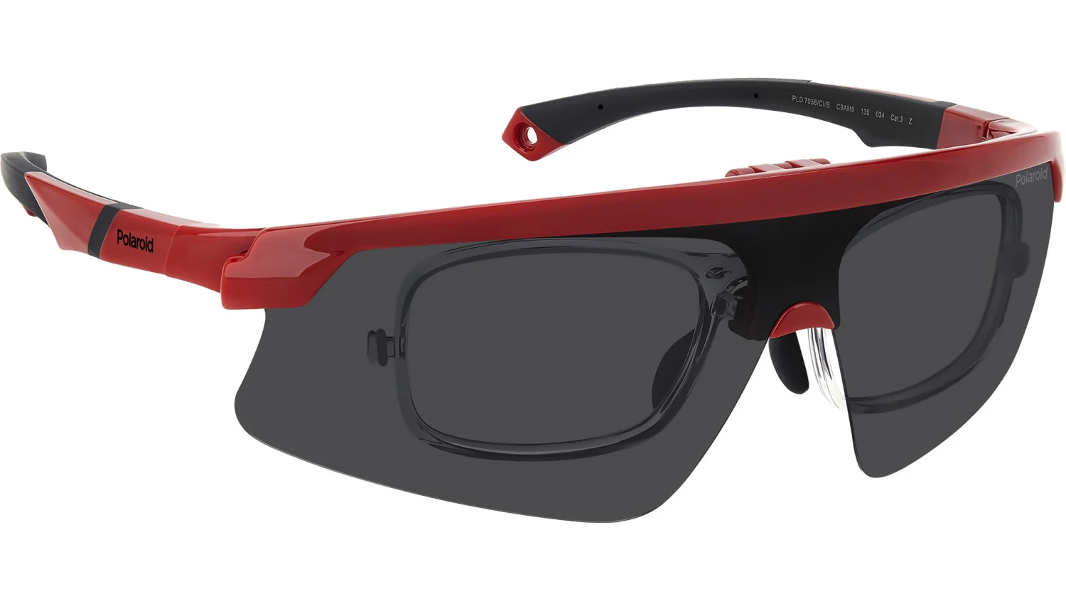 Polaroid PLD 7056/CI/S C9A M9 sunglasses for men, featuring red rectangular polycarbonate frame and grey polarized lenses. These aerodynamic and high-tech Polaroid sunglasses ride one of the most up-to-date trends in sportswear today. They’re composed of a full-coverage frame which rests on rubberised nose pads and end tips for reliable grip. The sun lenses can be raised with a simple movement, revealing the optical lenses below. These glasses can be completed by an elastic strap, purchased separately, which conveniently fits into the openings on the end tips. Brand line: Active. Style code: 207377. Color code: C9A M9. Authorized Polaroid online reseller. Your glasses will include the original case and accessories and are covered by a 12-month global warranty.