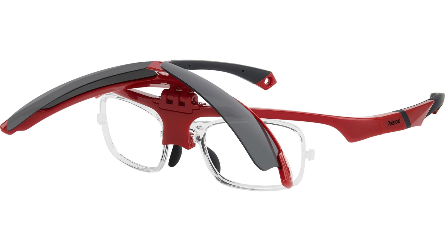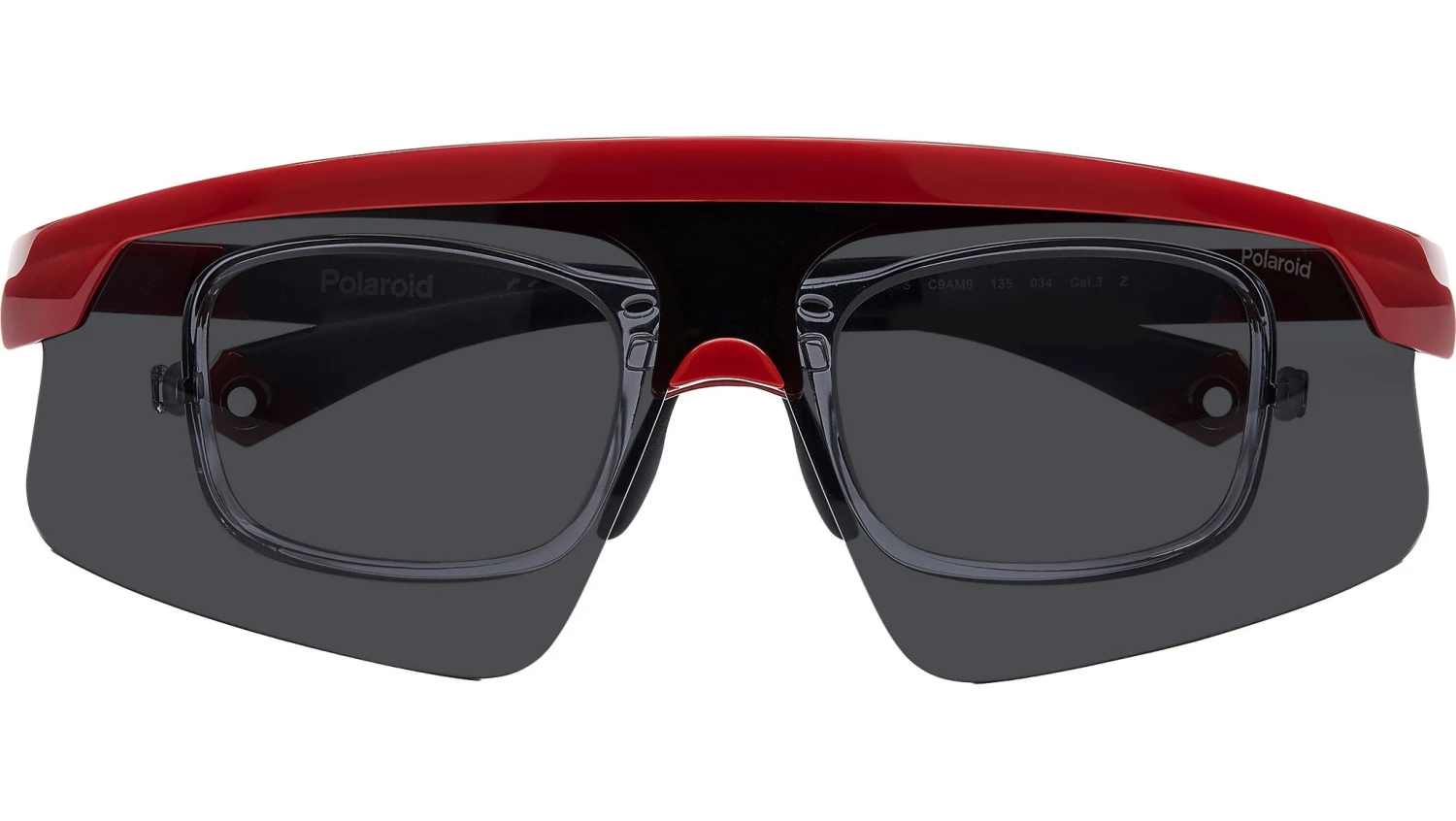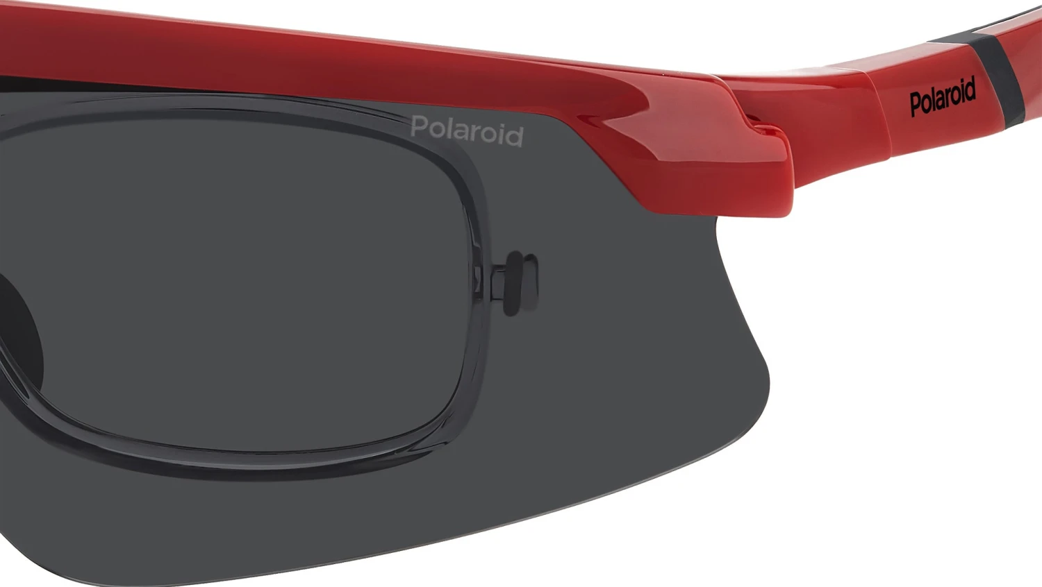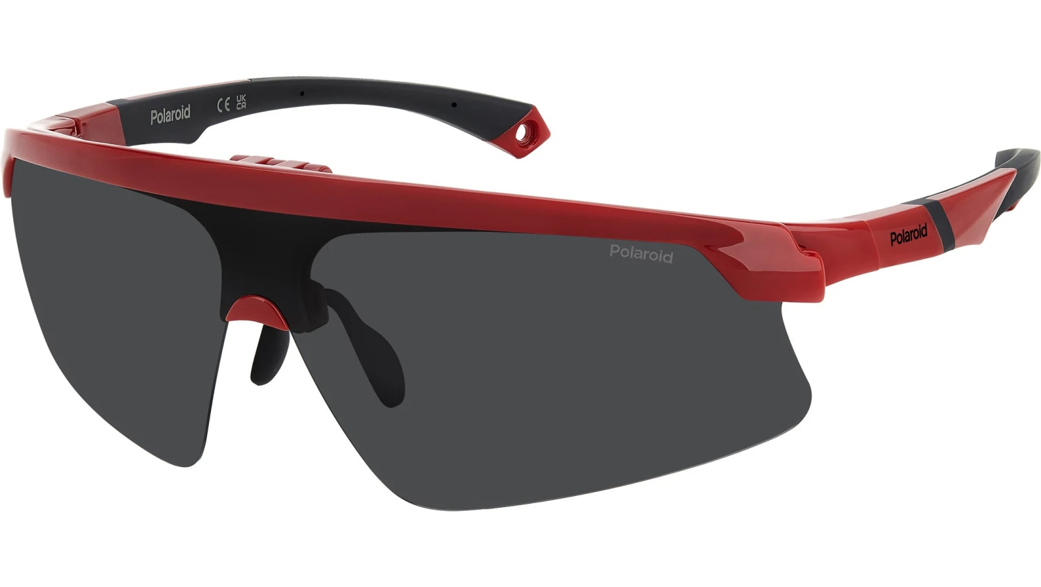 Polaroid PLD 7056/CI/S C9A M9 sunglasses for men, featuring red rectangular polycarbonate frame and grey polarized lenses. These aerodynamic and high-tech Polaroid sunglasses ride one of the most up-to-date trends in sportswear today. They’re composed of a full-coverage frame which rests on rubberised nose pads and end tips for reliable grip. The sun lenses can be raised with a simple movement, revealing the optical lenses below. These glasses can be completed by an elastic strap, purchased separately, which conveniently fits into the openings on the end tips. Brand line: Active. Style code: 207377. Color code: C9A M9. Authorized Polaroid online reseller. Your glasses will include the original case and accessories and are covered by a 12-month global warranty.