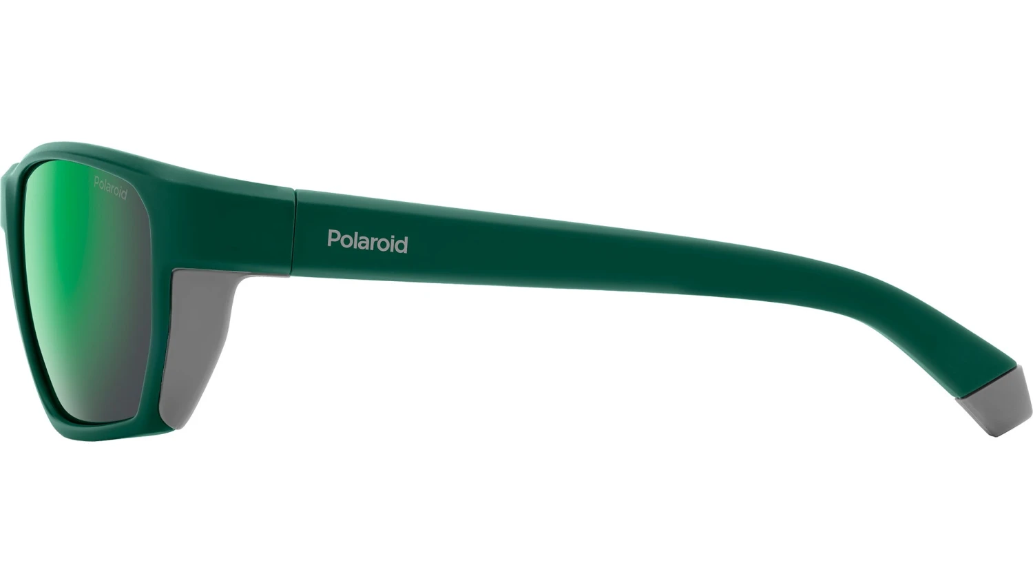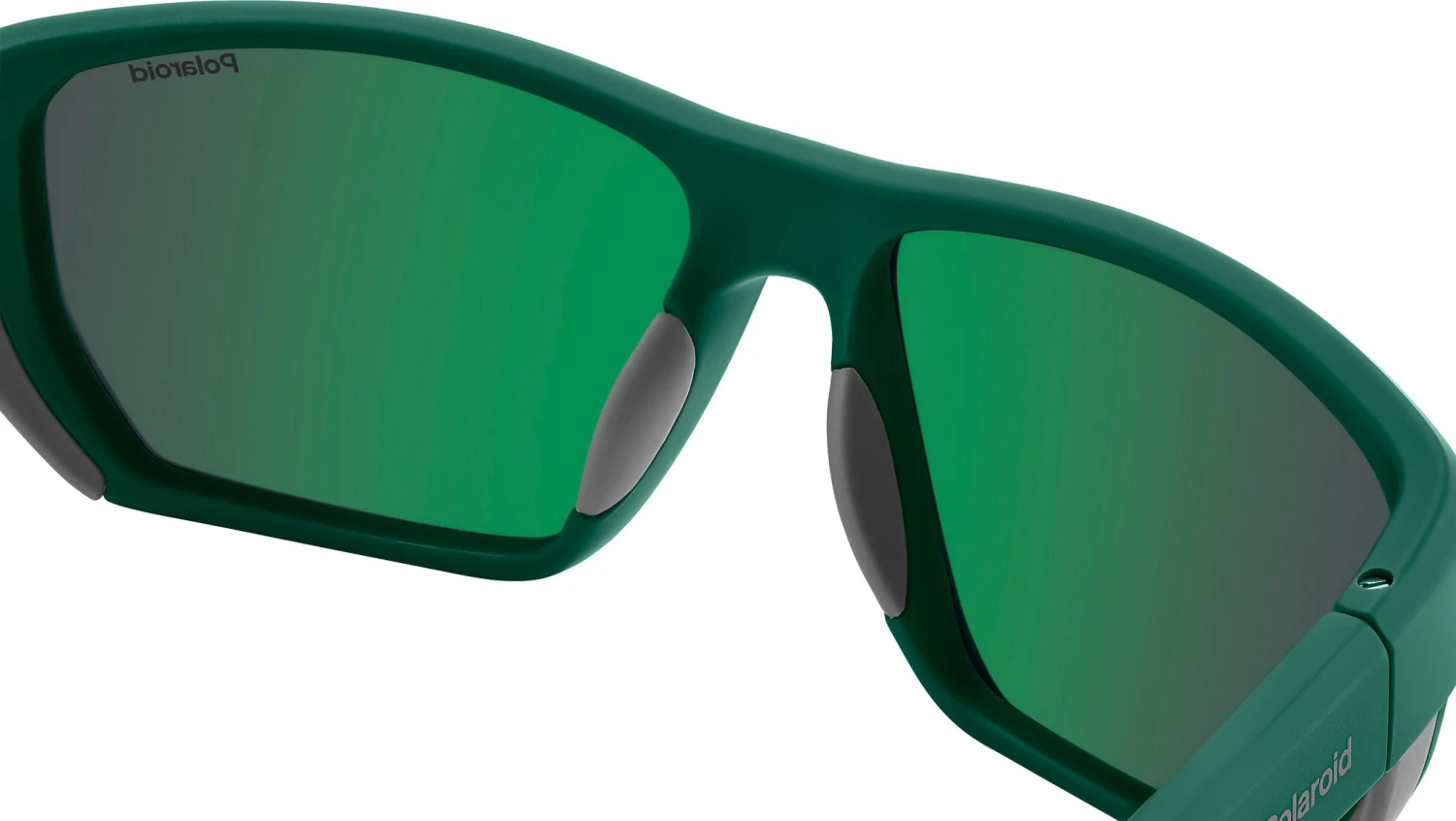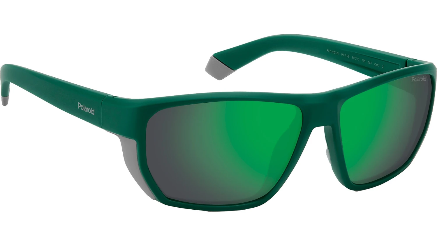 Polaroid PLD 7057/S PYW 5Z sunglasses for men, featuring matte teal rectangular polycarbonate frame and greygreen mirror polarized lenses. As bold as victory on the pitch, these Polaroid sunglasses infuse even basic outfits with a shot of adrenaline. With full and ample coverage, the font with lateral spoilers provides extra protection from light and glare. They stay in place thanks to the high-grip rubber nose pads, stable even while running on the beach or riding a bicycle. They also come in versions with mirrored or multi-layer lenses. Flawless with a track suit, bold with more formal attire. Unforgettable always. Brand line: Active. Style code: 207859. Color code: PYW 5Z. Authorized Polaroid online reseller. Your glasses will include the original case and accessories and are covered by a 12-month global warranty.