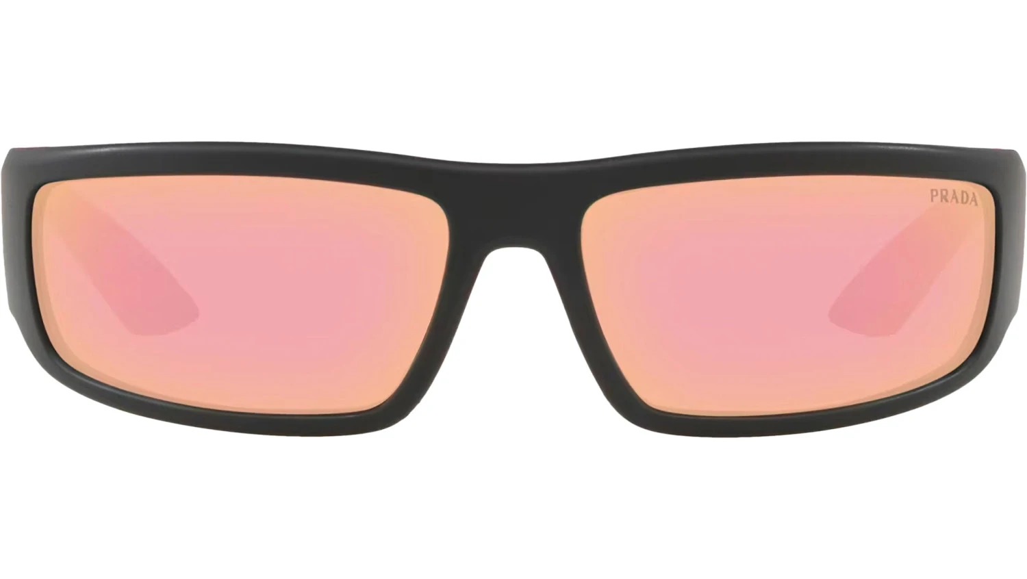 Prada Linea Rossa sunglasses model PS 02US, black and pink frame variant, color code 3535L2 with grey mirror rose gold lens. Prada Linea Rossa Sun Collection conveys an everyday casual style with all the quality and craftsmanship of the Prada brand.