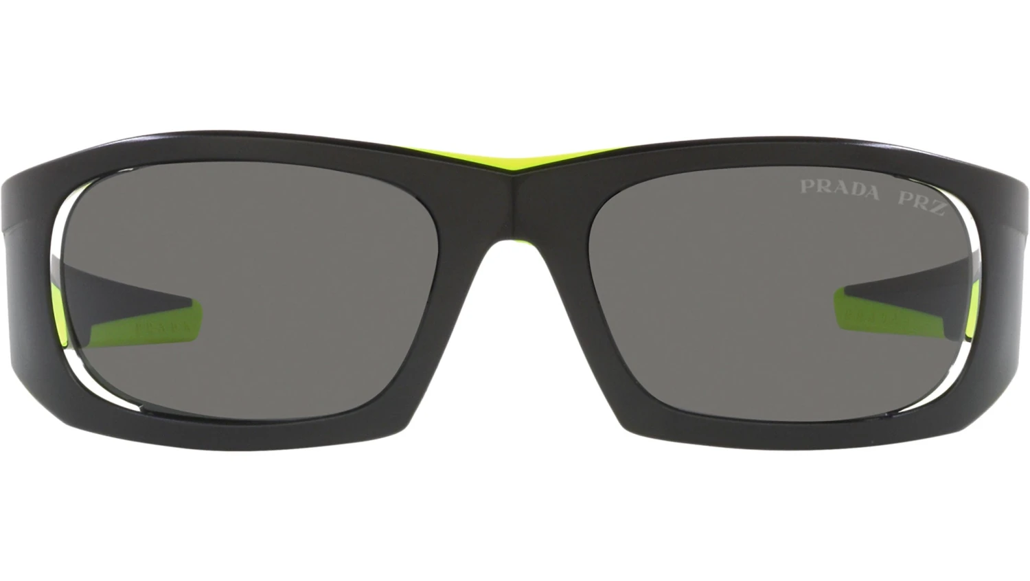 Prada Linea Rossa sunglasses model PS02YS matte black / yellow frame variant, color code 17G02G with dark grey polar lens. Prada Linea Rossa Sun Collection conveys an everyday casual style with all the quality and craftsmanship of the Prada brand.