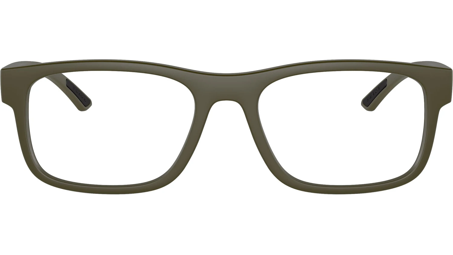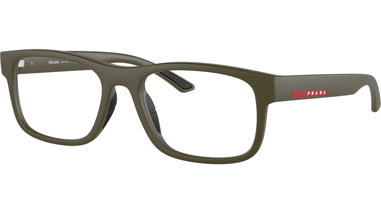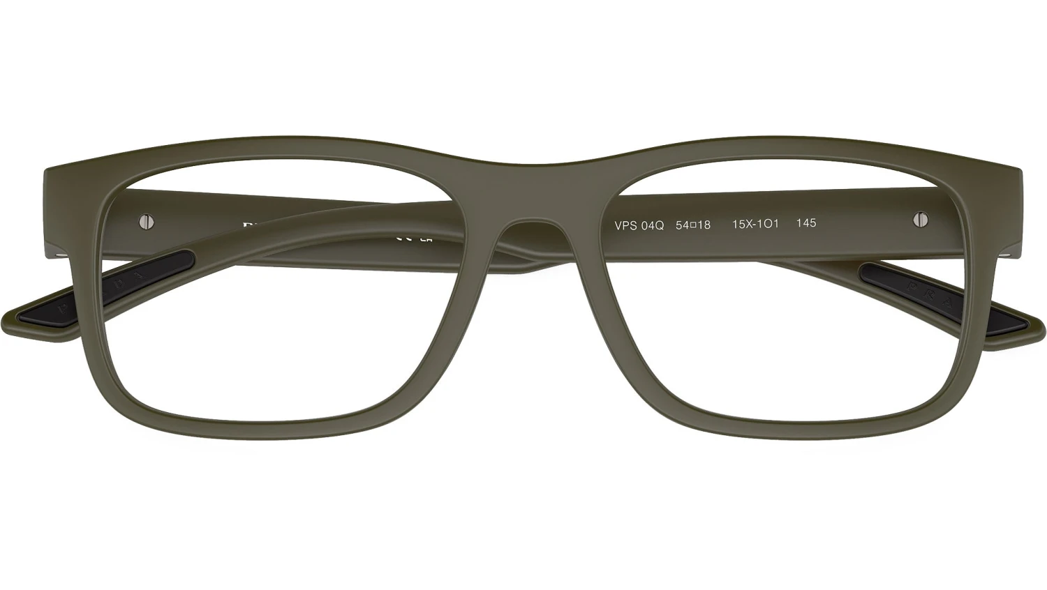 Prada Linea Rossa PS 04QV 15X1O1 glasses for men, featuring matte military green rectangular injection frame and demo lenses. High bridge fit. Brand line: Lifestyle. Style code: PS04QV. Color code: 15X1O1. Made in Italy. Authorized Prada Sport online reseller. Your glasses will include the original case and accessories and are covered by a 12-month global warranty.