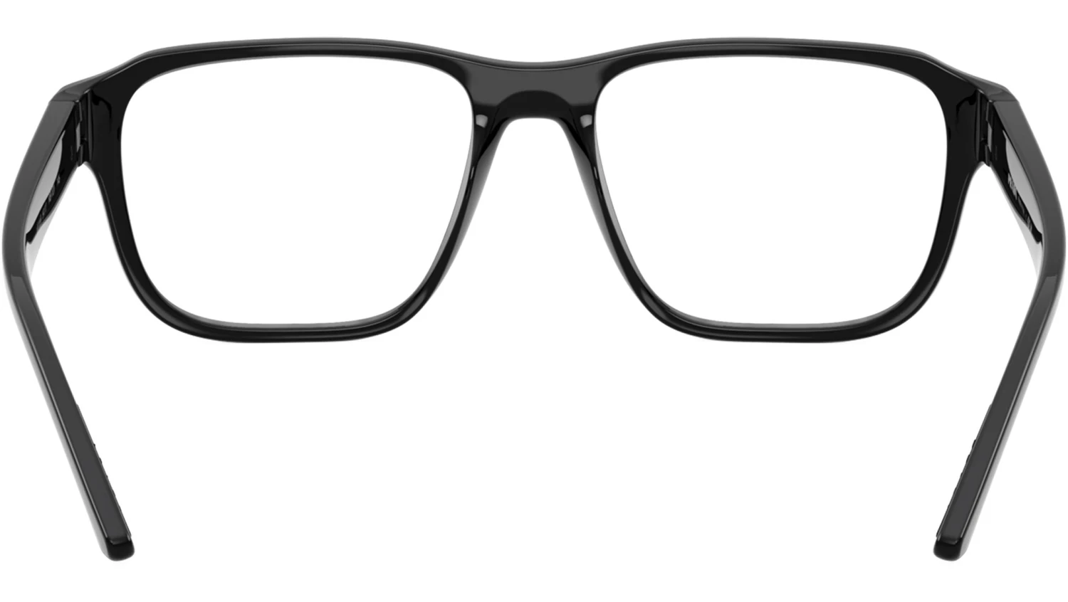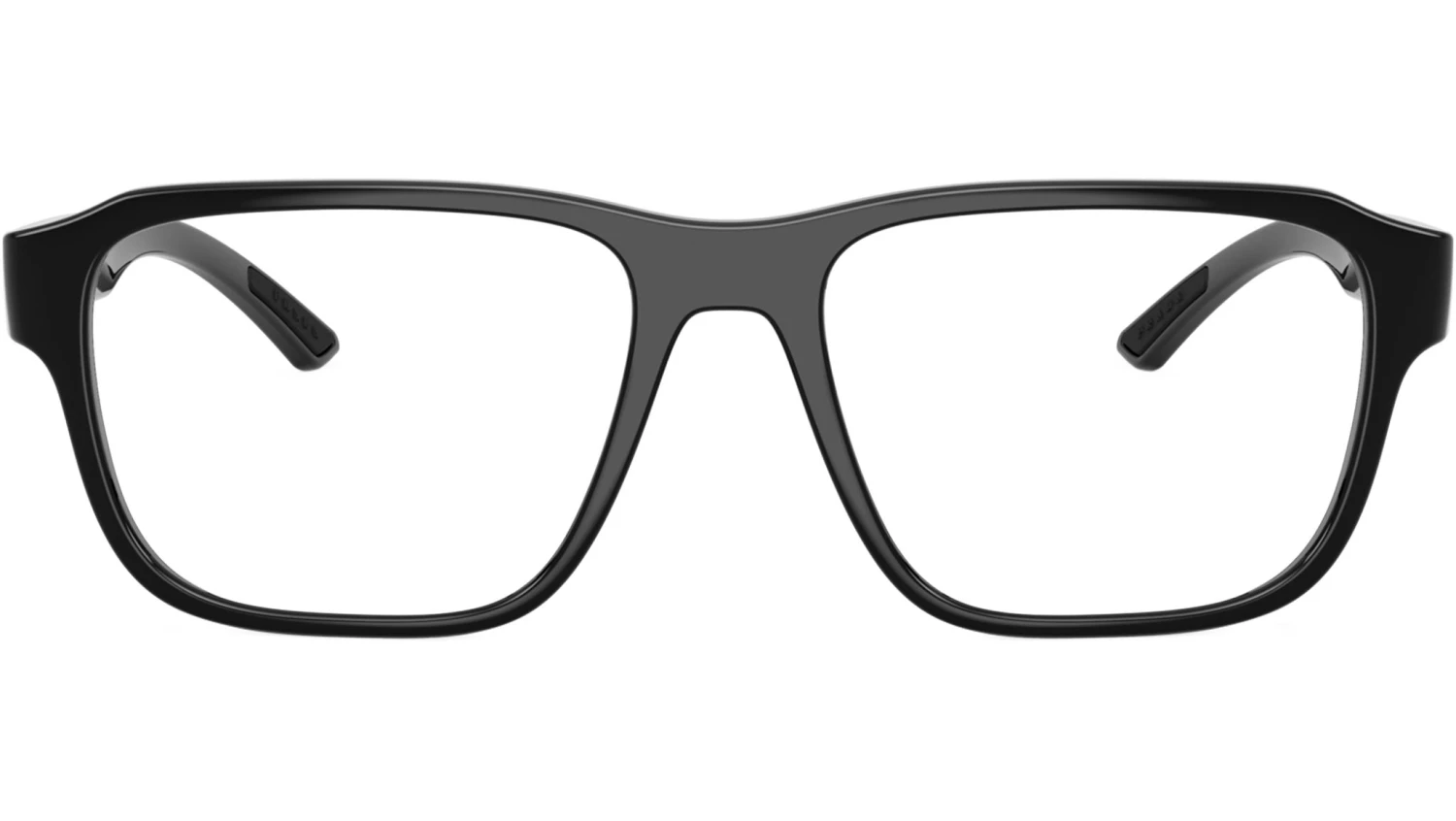Prada Linea Rossa PS 05RV 1AB1O1 glasses for men, featuring black geometric injection frame and demo lenses. High bridge fit. Brand line: Lifestyle. Style code: PS05RV. Color code: 1AB1O1. Made in Italy. Authorized Prada Sport online reseller. Your glasses will include the original case and accessories and are covered by a 12-month global warranty.