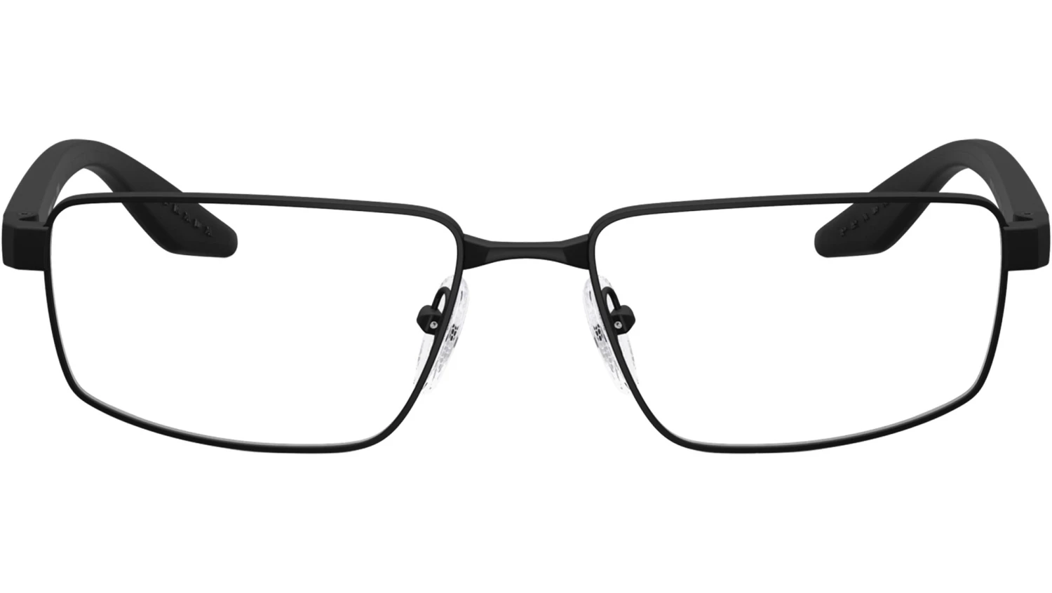 Prada Linea Rossa PS 52RV DG01O1 glasses for men, featuring black rubber rectangular metal frame and demo lenses. Universal fit. Brand line: Lifestyle. Style code: PS52RV. Color code: DG01O1. Made in Italy. Authorized Prada Sport online reseller. Your glasses will include the original case and accessories and are covered by a 12-month global warranty.