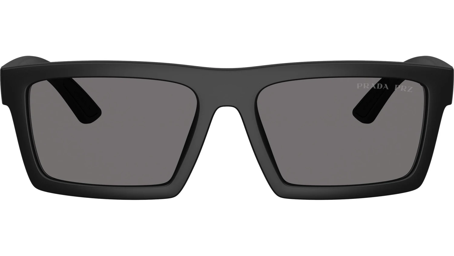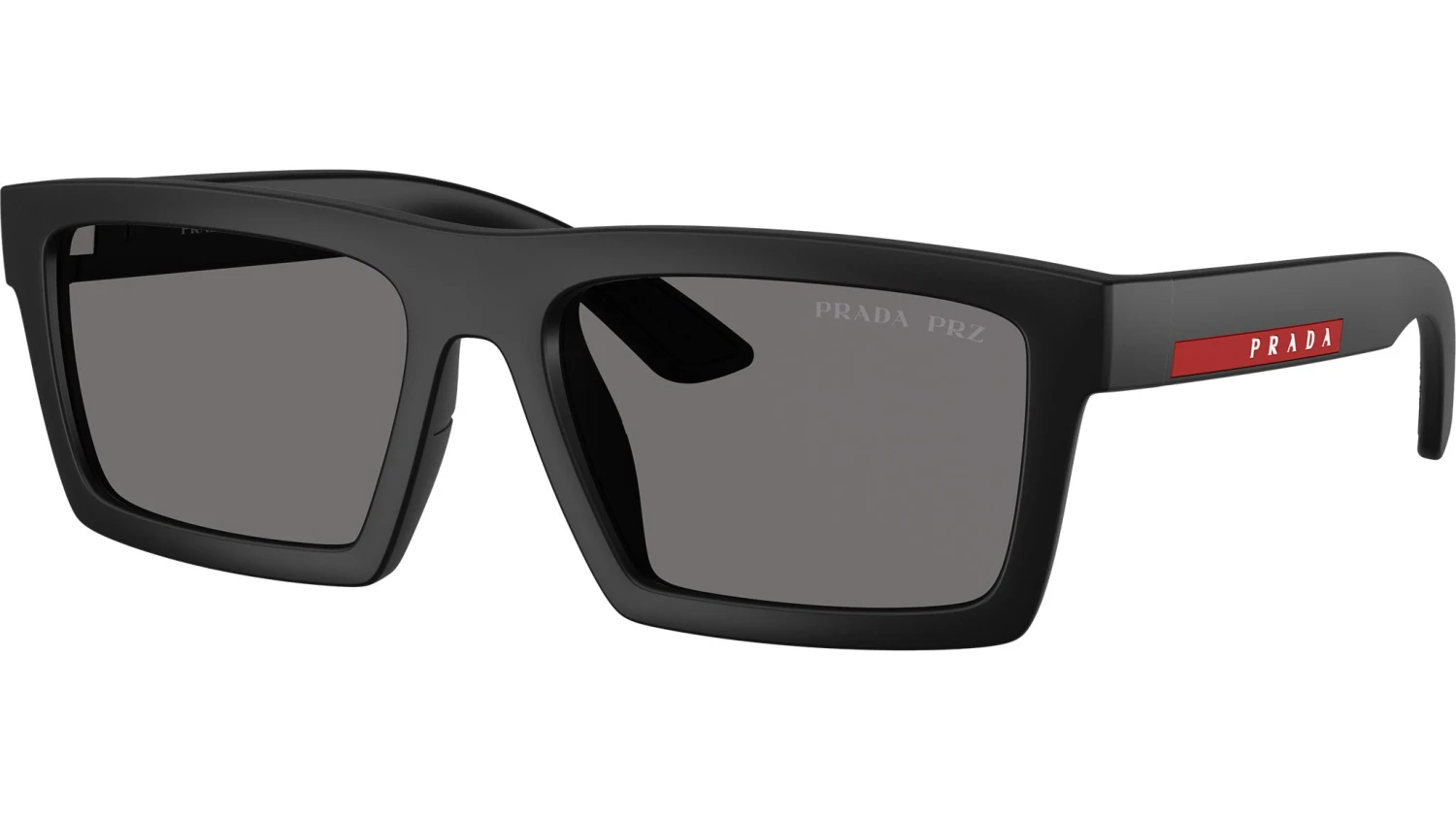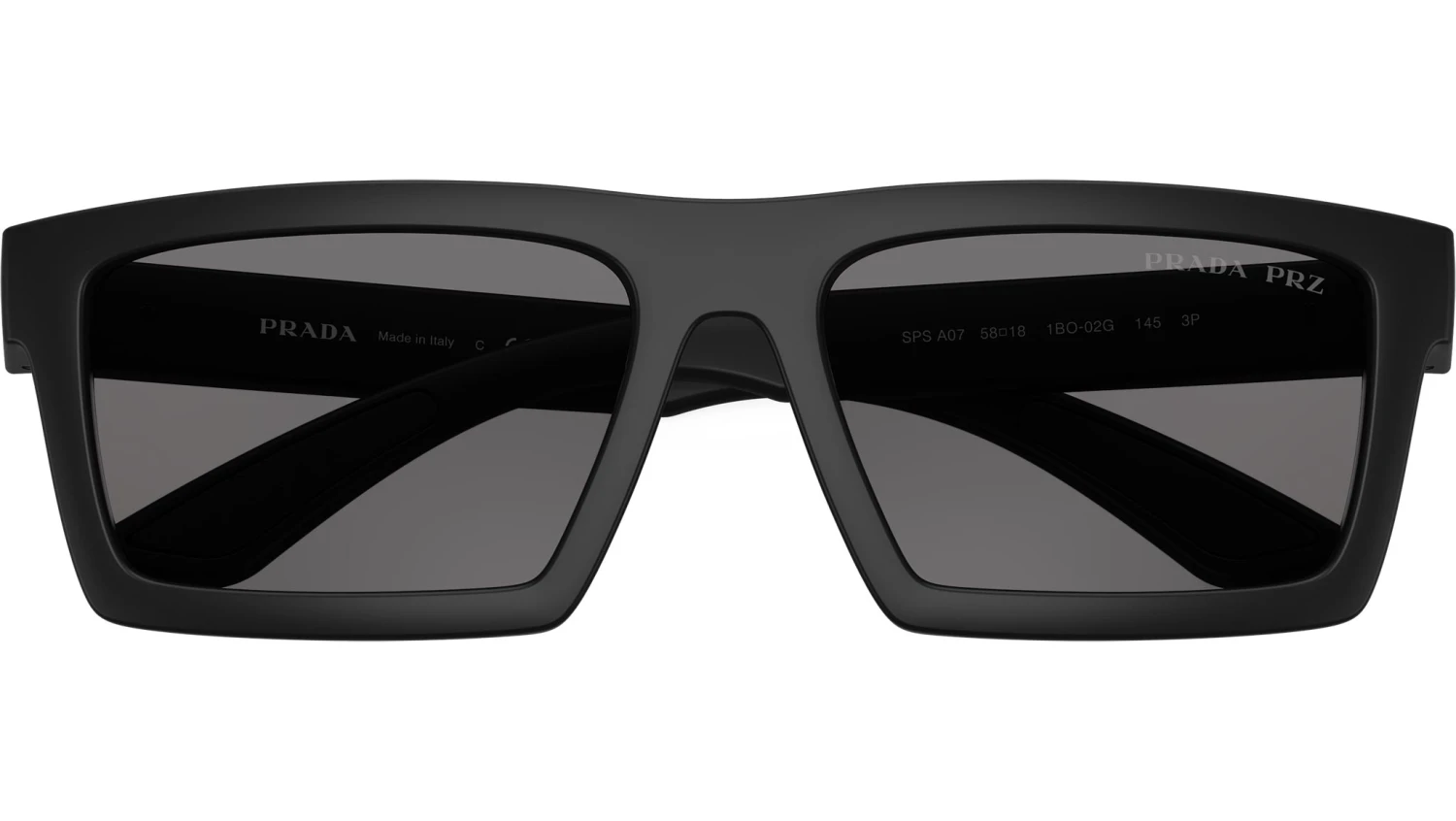 Prada Linea Rossa PS A07S 1BO02G sunglasses for men, featuring matte black rectangular injection frame and dark grey polar polycarbonate lenses. High bridge fit. Brand line: Lifestyle. Style code: PSA07S. Color code: 1BO02G. Made in Italy. Authorized Prada Sport online reseller. Your glasses will include the original case and accessories and are covered by a 12-month global warranty.