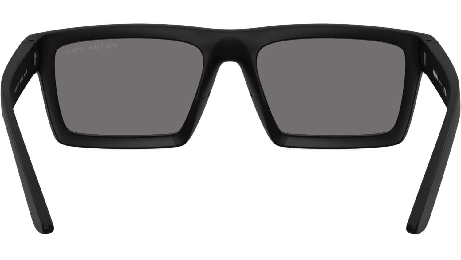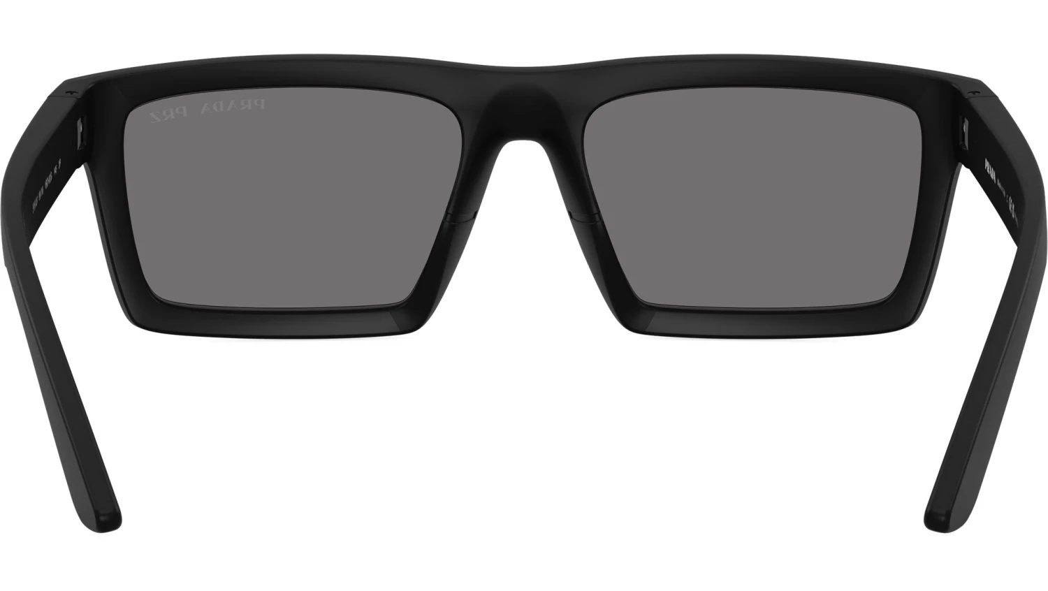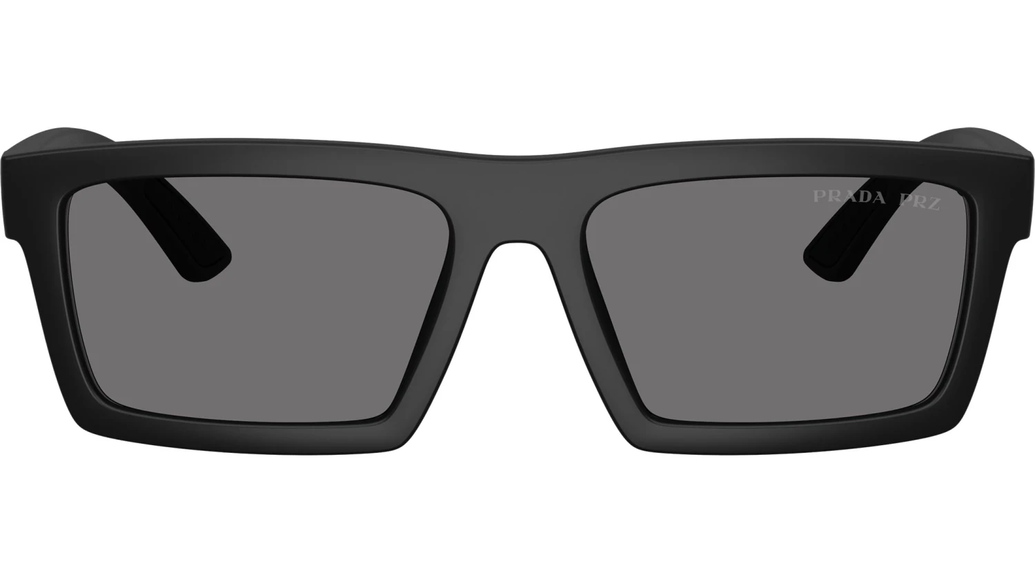 Prada Linea Rossa PS A07S 1BO02G sunglasses for men, featuring matte black rectangular injection frame and dark grey polar polycarbonate lenses. High bridge fit. Brand line: Lifestyle. Style code: PSA07S. Color code: 1BO02G. Made in Italy. Authorized Prada Sport online reseller. Your glasses will include the original case and accessories and are covered by a 12-month global warranty.