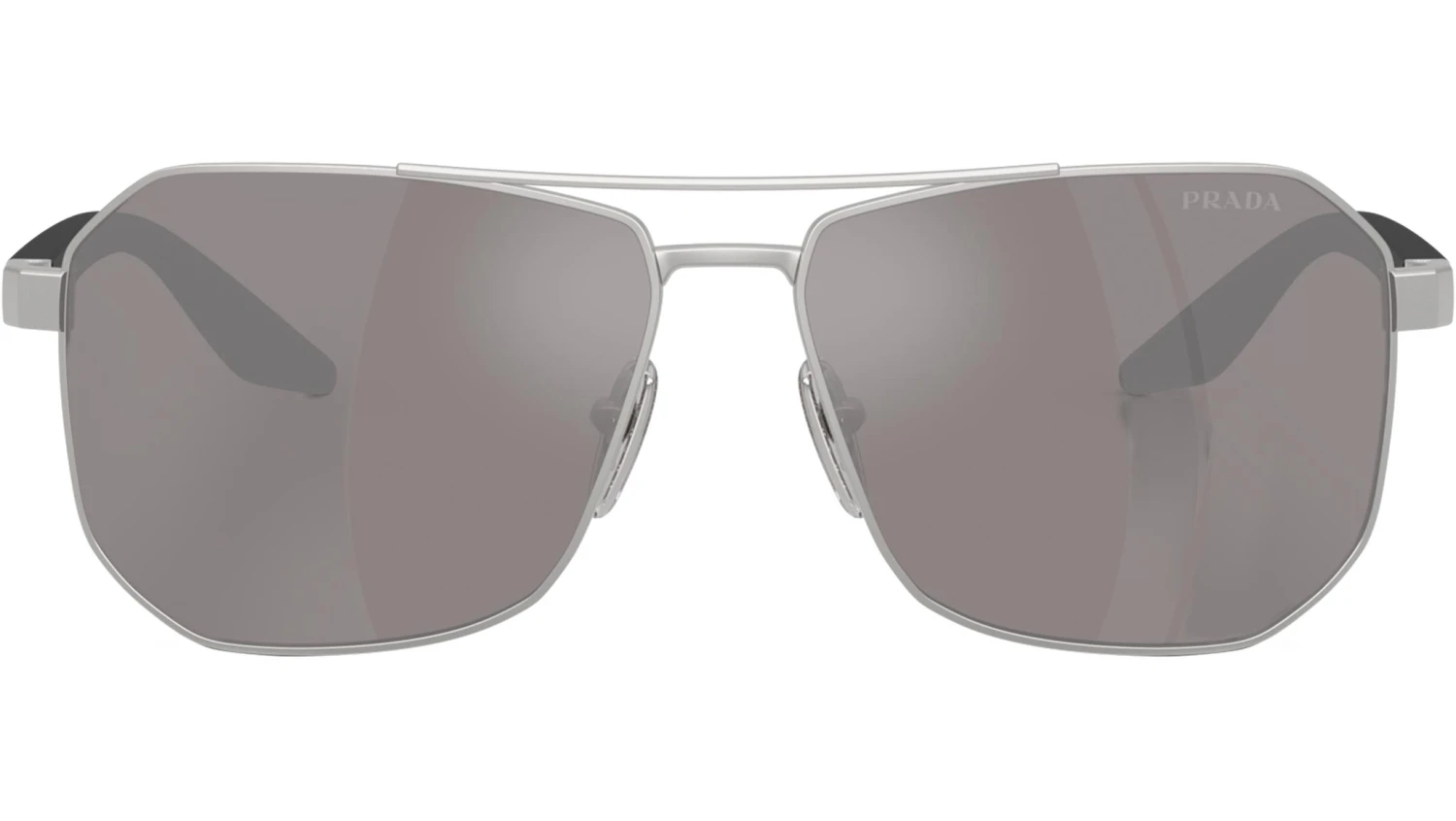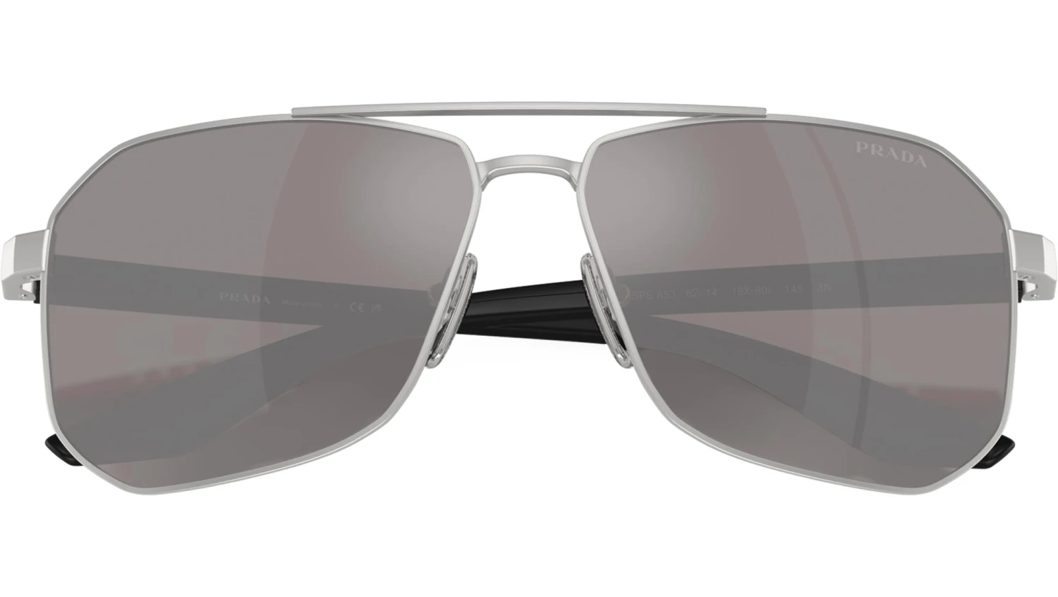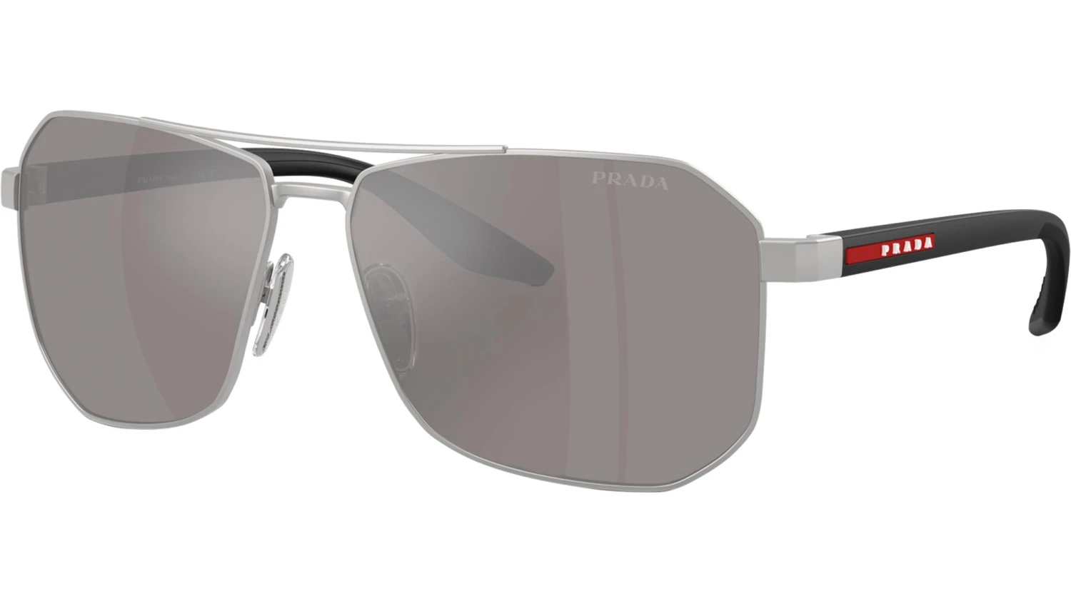 Prada Linea Rossa PS A53S 18X80I sunglasses for men, featuring matte champagne pilot metal frame and purple brown mirror silver polyamide lenses. High bridge fit. Brand line: Lifestyle. Style code: PSA53S. Color code: 18X80I. Made in Italy. Authorized Prada Sport online reseller. Your glasses will include the original case and accessories and are covered by a 12-month global warranty.
