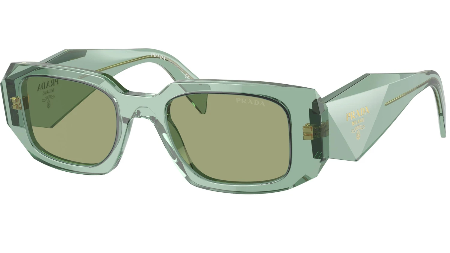 Prada PR 17WS 11R10E sunglasses for women, featuring transparent sage rectangular acetate frame and green mirror silver polyamide lenses. Universal fit. Brand line: Catwalk. Style code: PR17WS. Color code: 11R10E. Made in Italy. Authorized Prada online reseller. Your glasses will include the original case and accessories and are covered by a 12-month global warranty.