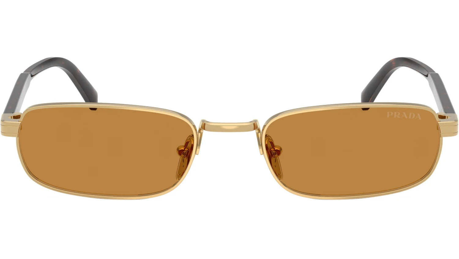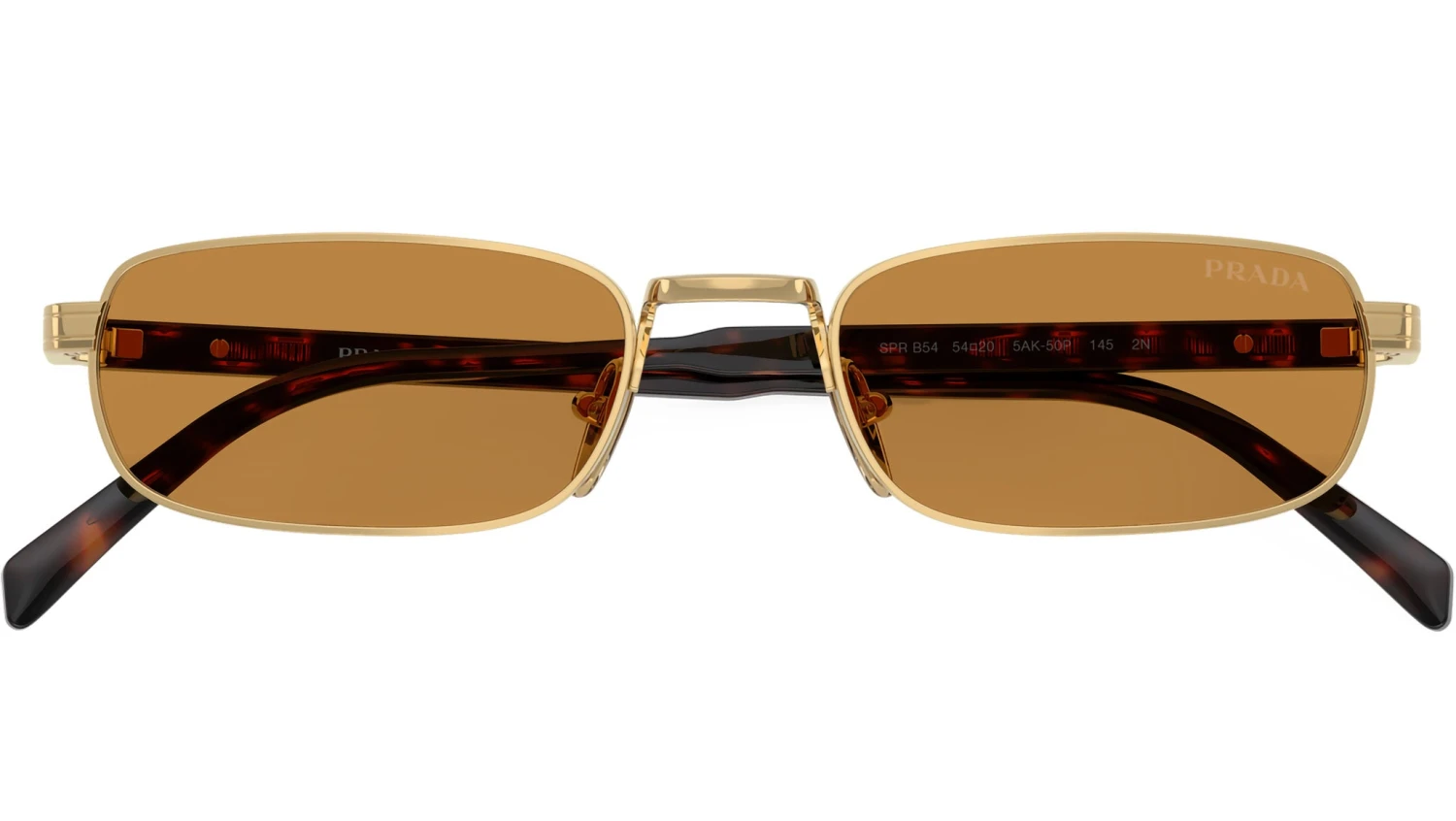 Prada PR B54S 5AK50P sunglasses for men, featuring gold rectangular metal frame and dark honey bio polyamide lenses. Adjustable nosepads. Brand line: Signature. Style code: PRB54S. Color code: 5AK50P. Made in Italy. Authorized Prada online reseller. Your glasses will include the original case and accessories and are covered by a 12-month global warranty.