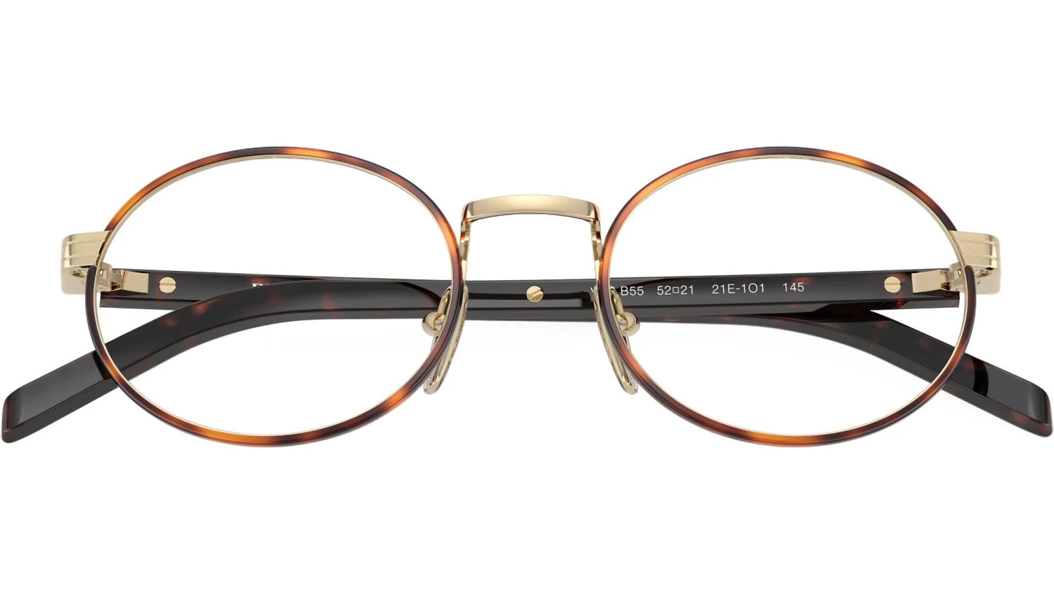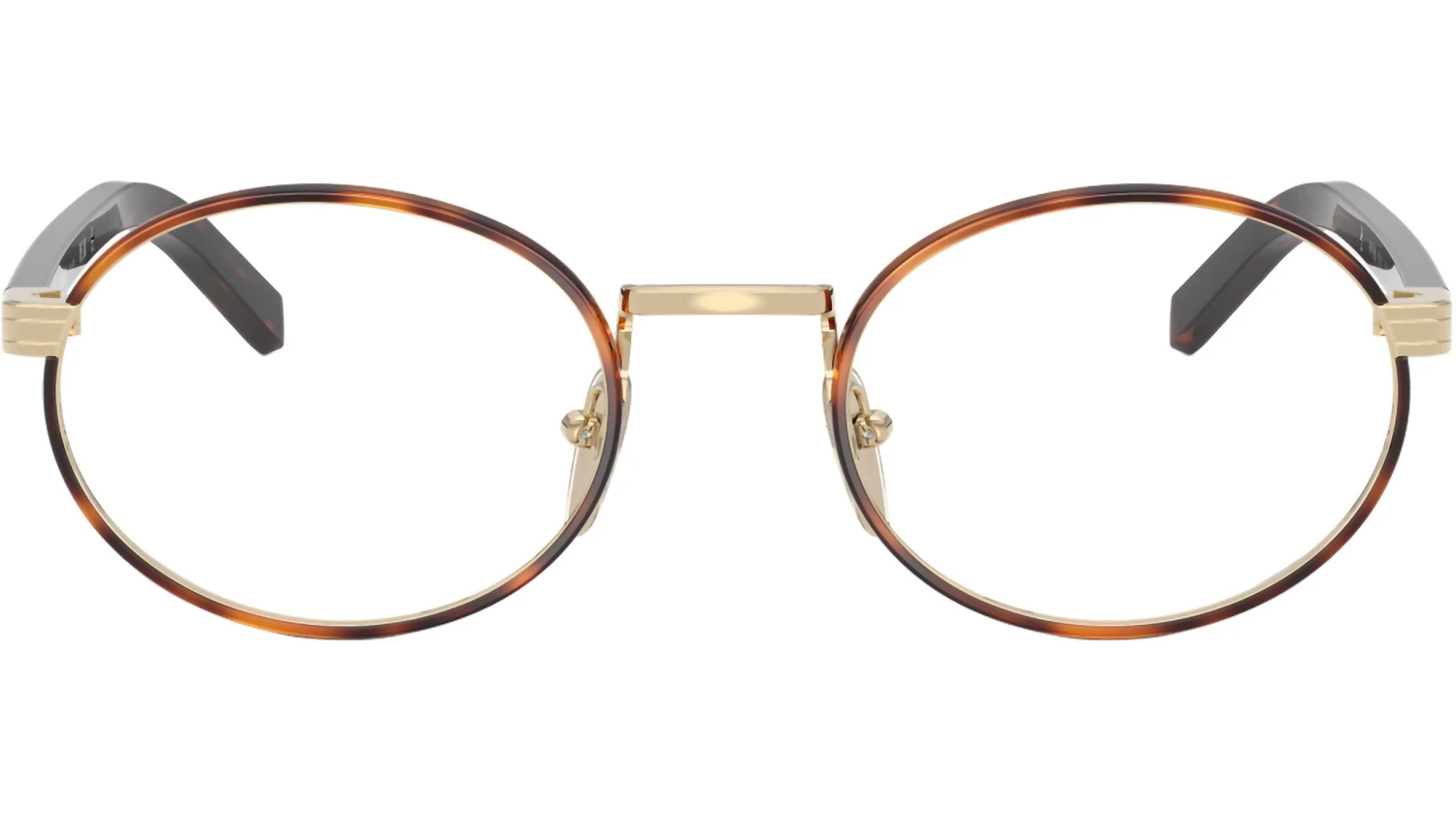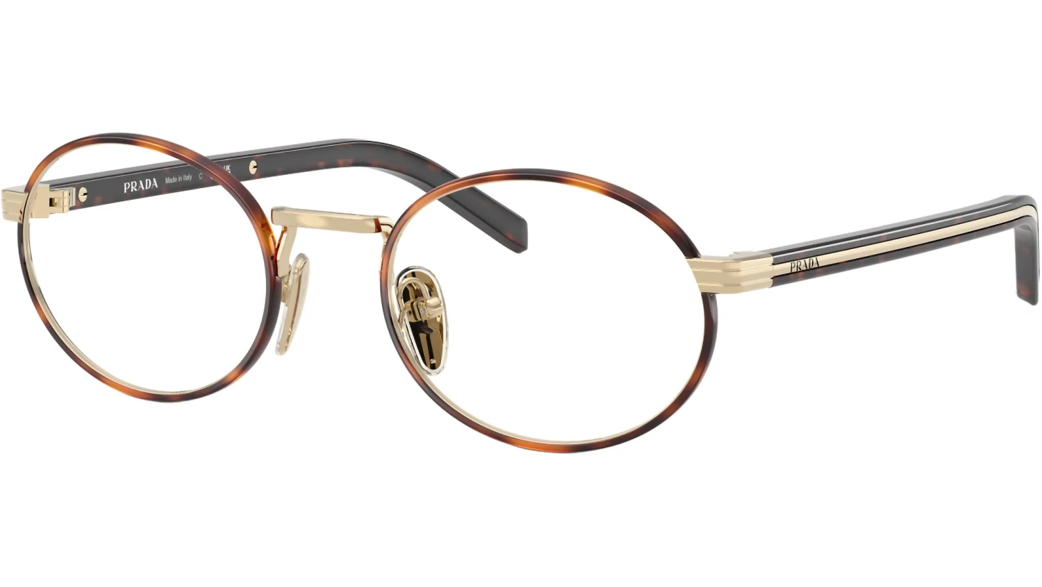 Prada PR B55V 21E1O1 glasses for women, featuring pale gold / root tortoise oval metal frame and demo lens . Adjustable nosepads. Brand line: Signature. Style code: PRB55V. Color code: 21E1O1. Made in Italy. Authorized Prada online reseller. Your glasses will include the original case and accessories and are covered by a 12-month global warranty.