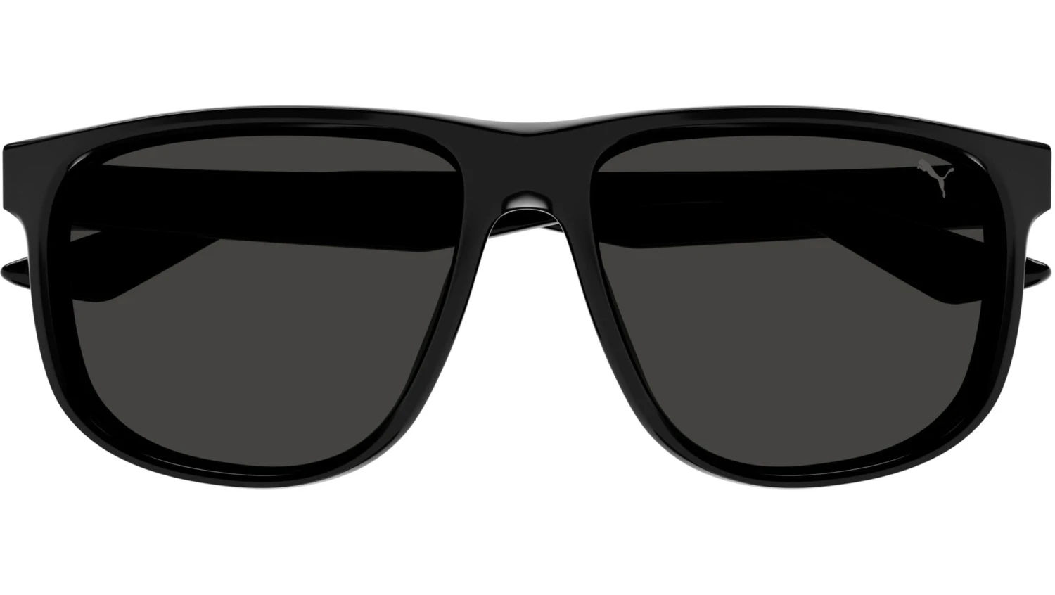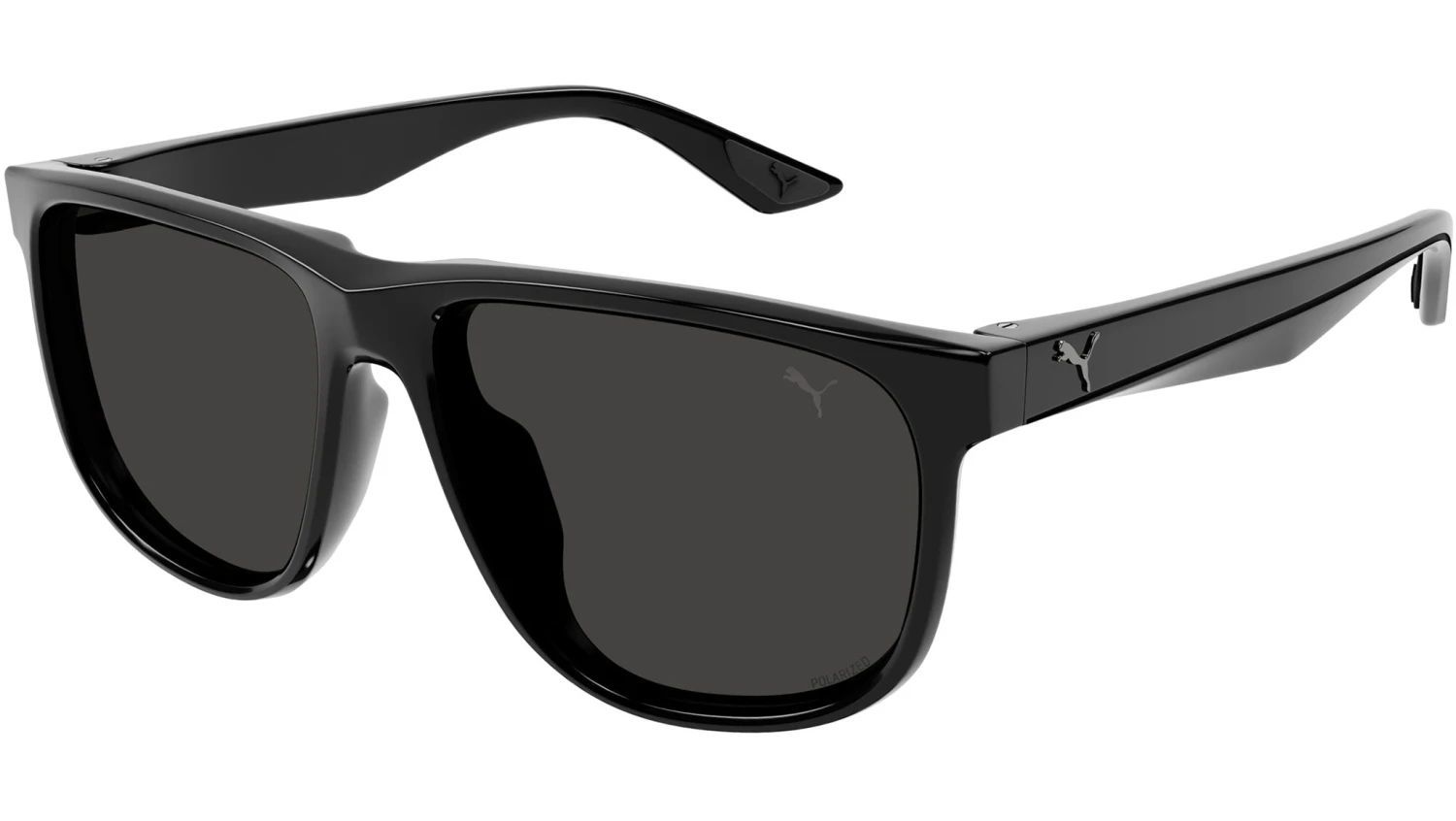 Puma Sport line sunglasses model PU0441S, panthos injection frame, color code 001 featuring shiny black front with black temple and polar solid smoke lenses. Authorized Puma online reseller. Your glasses will come with the original case and accessories and will be covered by a 12-month global warranty.