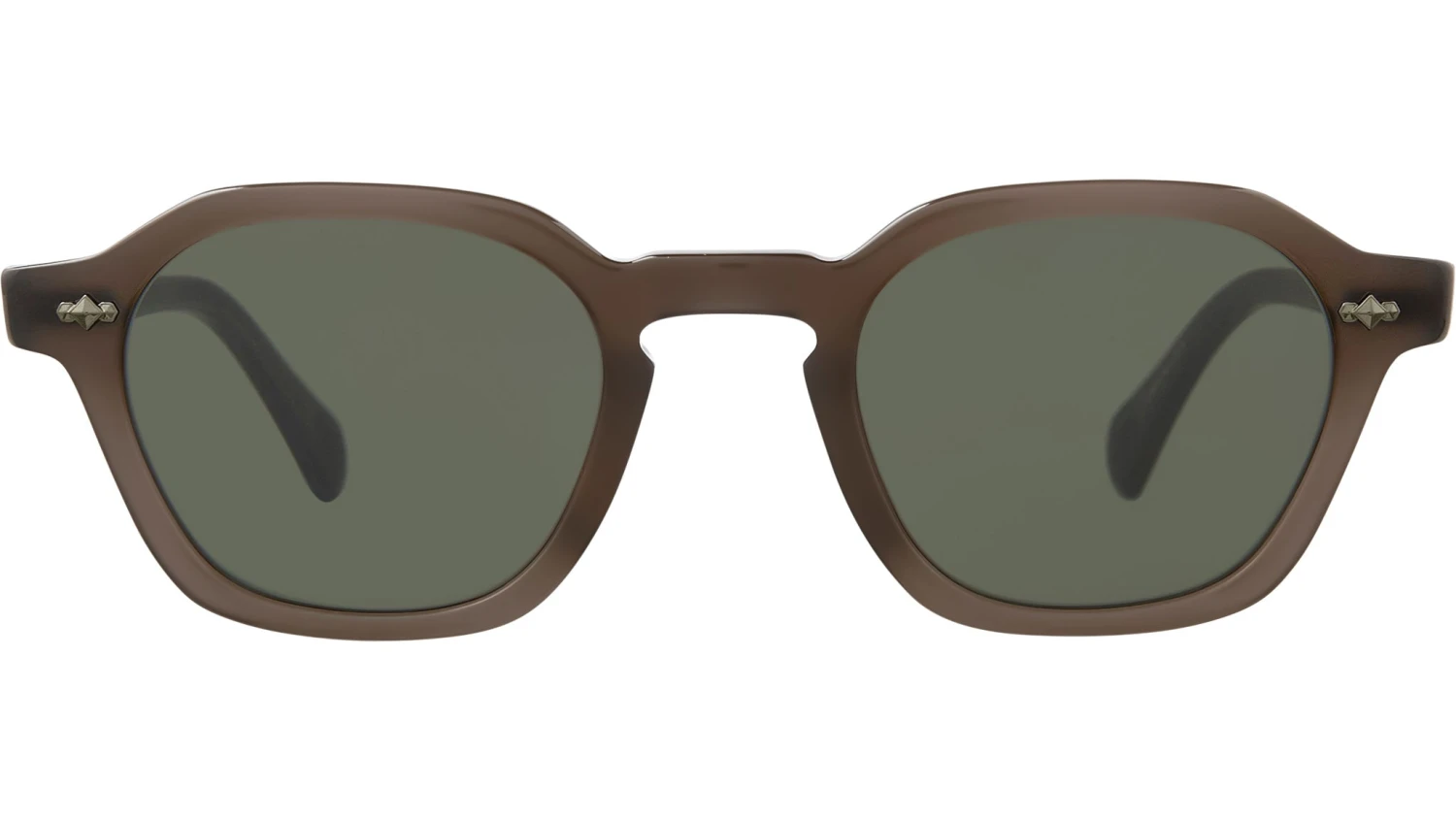 Mr. Leight Rell S sunglasses featuring truffle / pewter geometric titanium frame and select G-15 lenses. The Rell model features an unconventional silhouette that pays homage to the nonconforming spirit of mid-20th century musicians and artists. Its geometric design is enhanced by striking color and lens pairings, complemented by intricate filigree artwork on the core wire. Notable features include Fish Hook metal decals on the outer temples, handcrafted construction in Japan, and Select Glass lenses that ensure clarity. The custom titanium Shark Teeth engraved metal core wire and 4 Base lens with backside anti-reflective coating provide both style and functionality. Additional elements such as the Vintage Diamond plaque, custom hexagon riveted pins at the temples, metal temple tips, and a keyhole bridge further elevate the design. A custom engraved 3-barrel hinge with an enamel-filled logo cap completes this piece, offering 100% UV protection. The unisex look makes it suitable for a wide range of wearers. Style code: ML2030. Color code: TRU-PW/SELG15. Authorized Mr. Leight online reseller. Your glasses will include the original case and accessories and are covered by a 12-month global warranty.