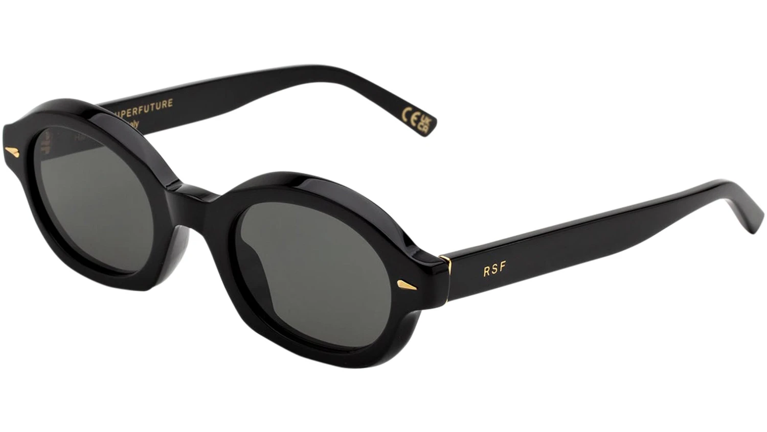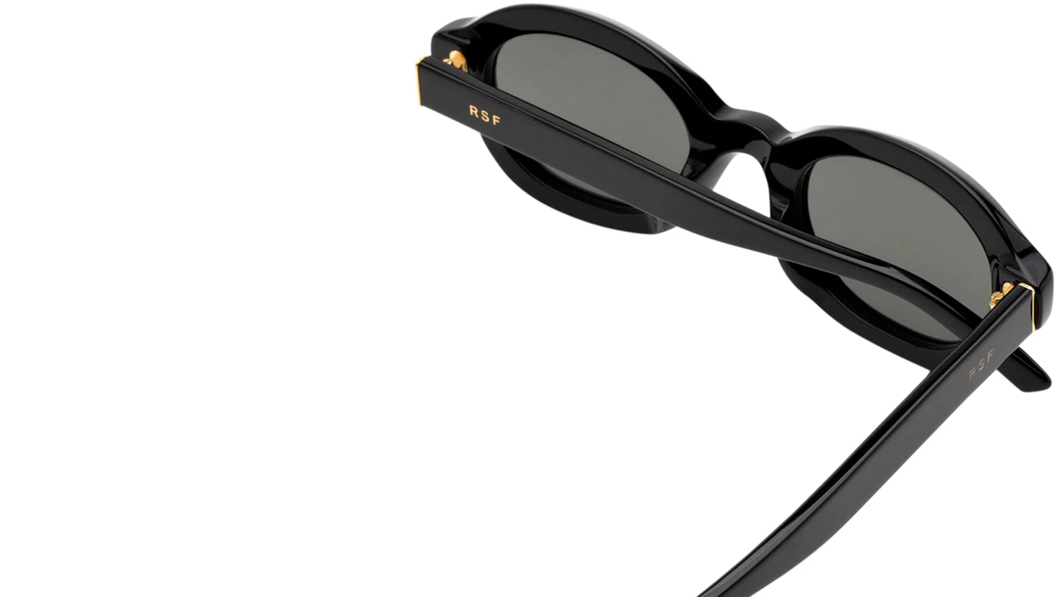 Oval and compact, Marzo is an exciting silhouette in RSF’s roster. Characterized by chunky acetate rims, a signature RSF feature, the model draws inspiration from 1960s shapes, with its low, protruding temple tips and oval lenses. With hand-crafted decors and sleek temples, this is a fresh take on casual everyday sunglasses. This version comes in a black finish with black lenses and gold decors. Sizes: R Lens Width: 50 mm. Frame Front: Frame Side: 145 mm. Product Code Size R: D7Z