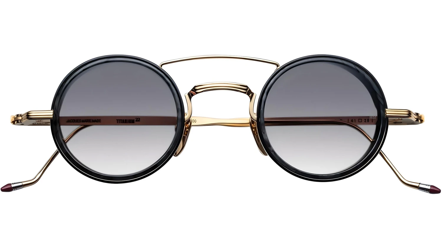 Moon gold 100% beta titanium frame with black gradient lenses. Features a custom moon gold hairline hinge, burgundy epoxy temple tips, and black burlwood acetate eyerim inserts. Custom nose pads with logo and hairline engravings add a refined touch. Sunrise gradient 2 base lenses with backside anti-reflective treatment ensure clarity and comfort. Frame shape: circular. Provides 100% UV protection.
