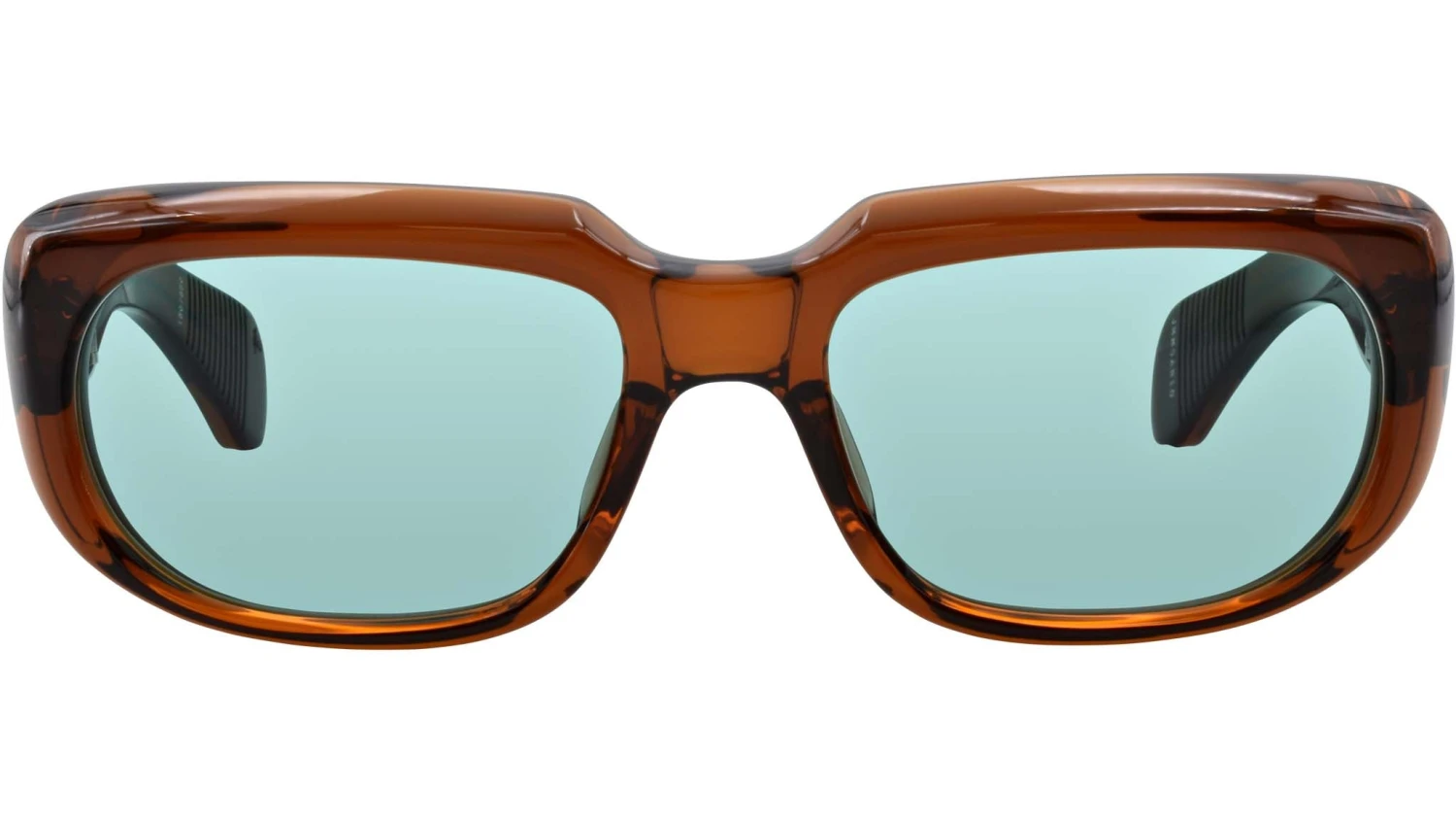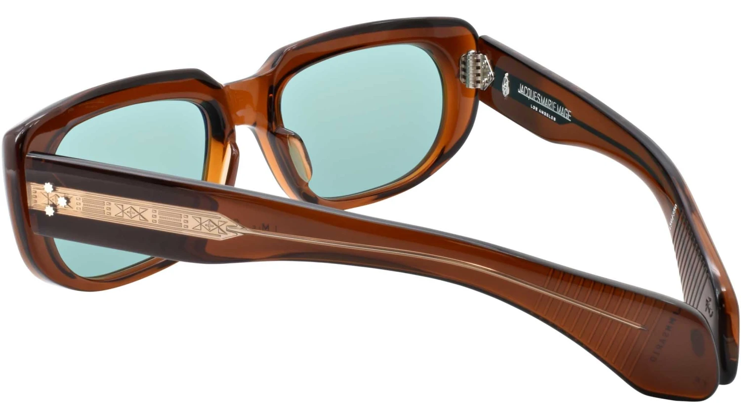 Brown 10mm cured cellulose acetate frame with custom double laminated acetate temples, accentuated by precious metal hardware and blue lenses. The inner dark gold wire core exhibits custom native-inspired filigree engraving, while a dark gold tension-secured custom 9-barrel hinge ensures durability. Adorned with blue 6 base CR-39 lenses featuring a backside anti-reflective treatment – a masterpiece of craftsmanship and style.